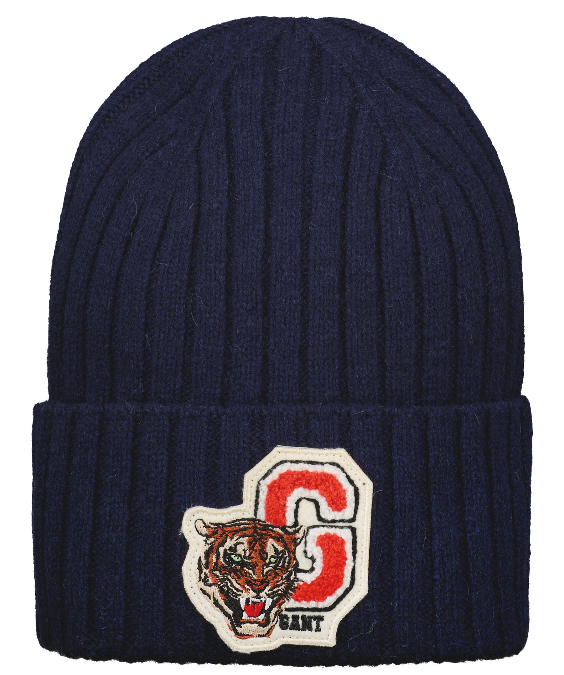 Marinblå ribbstickad mössa från Gant med en broderad tiger och ett stort G framtill. Mössan är gjord i 100% ull.