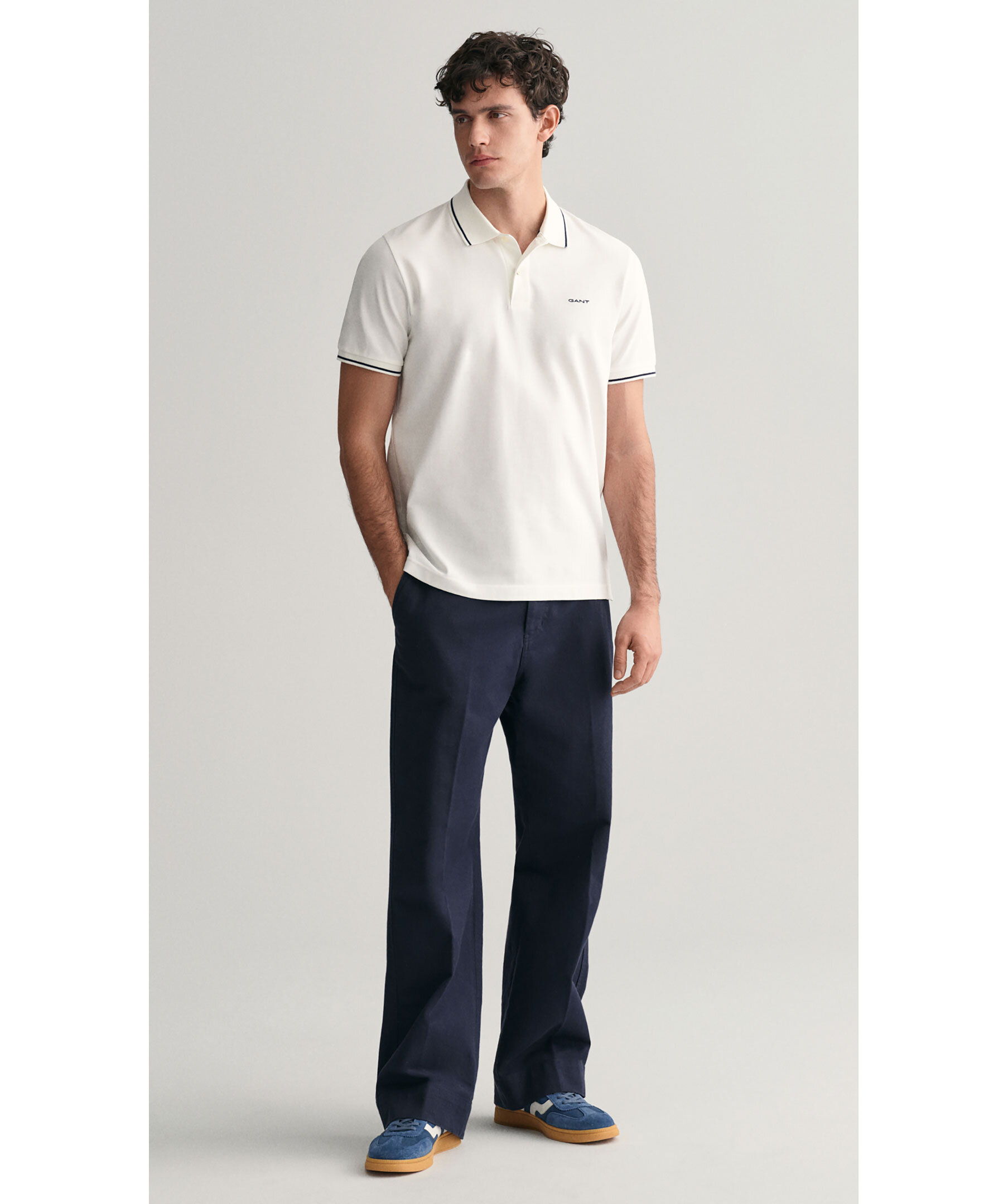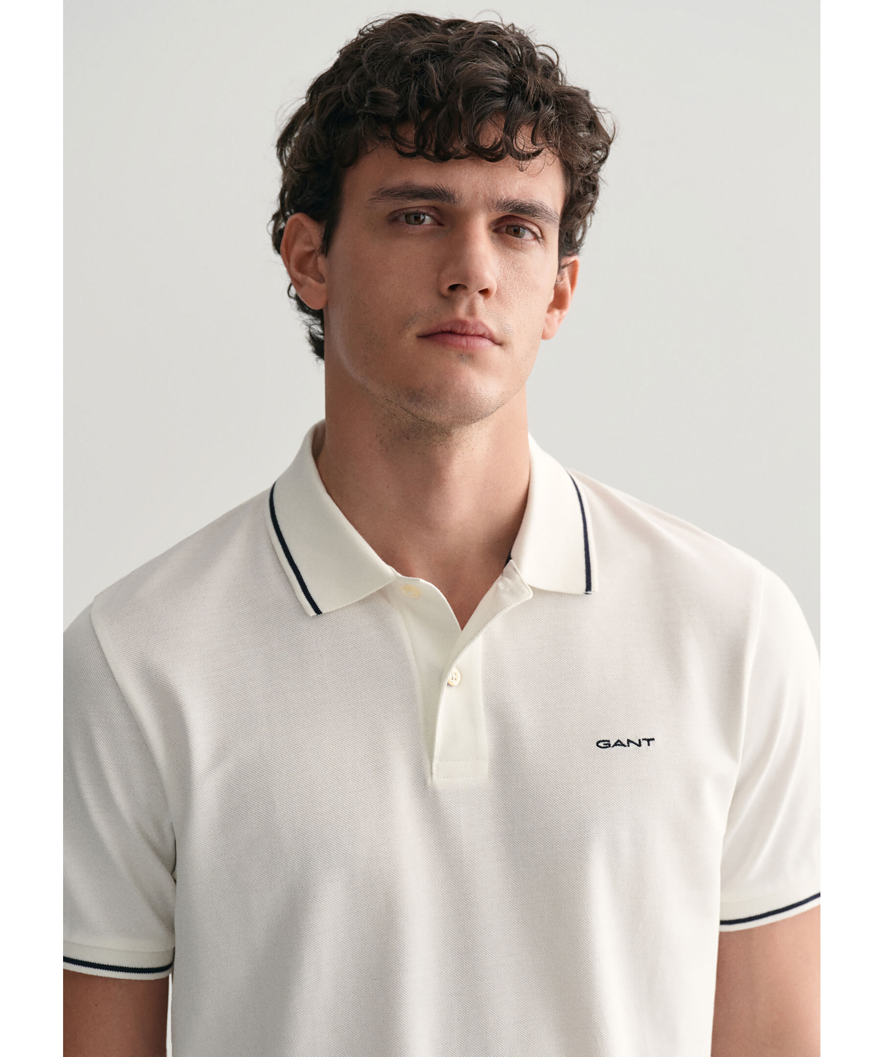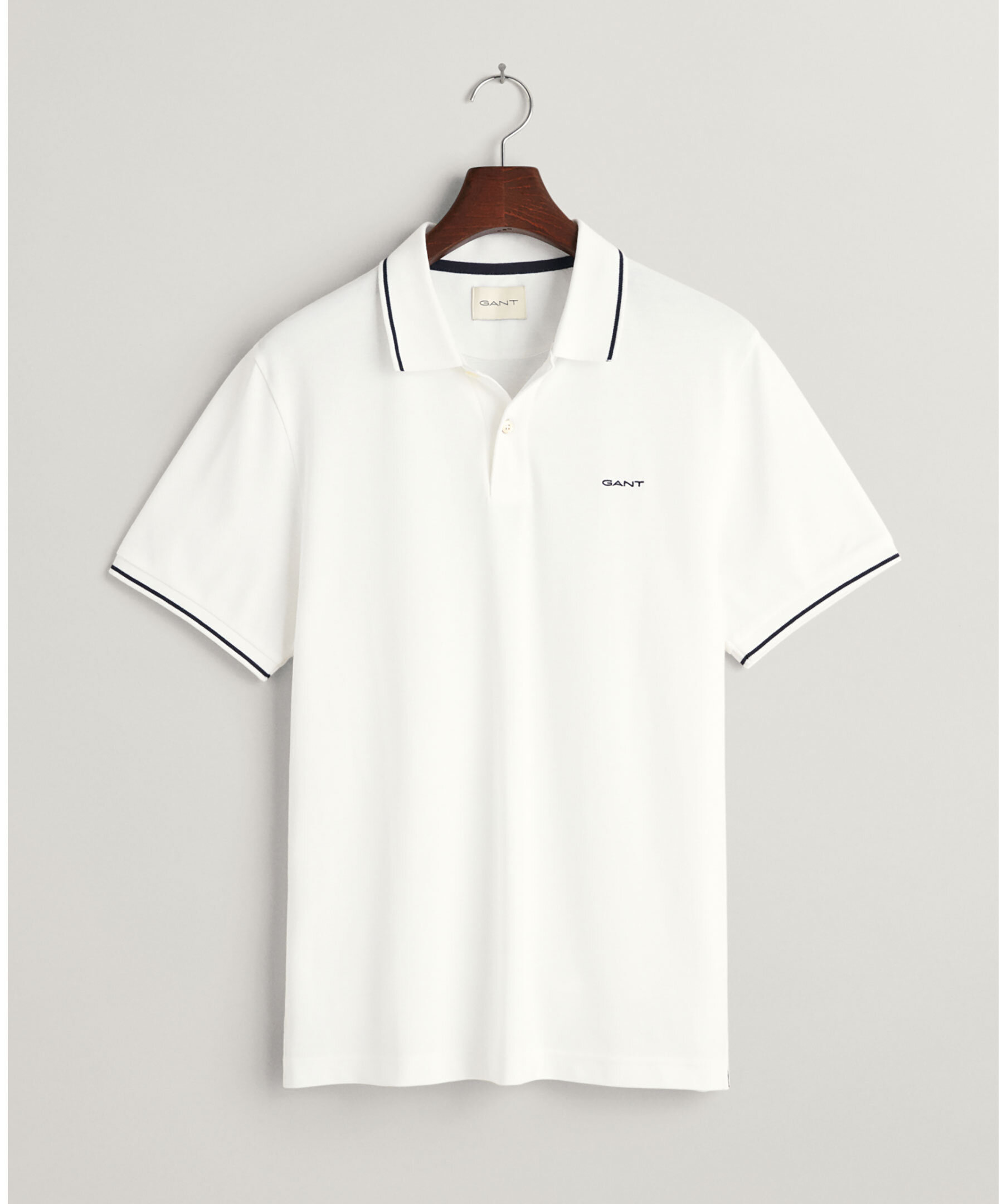 <>br/>Vit Piké från Gant. Slätstickad krage med svart rand, slätstickat ärmslut med svart rand. Två knappar. Broderad logotyp på vänster bröst. Tillverkad i 100% Bomull.