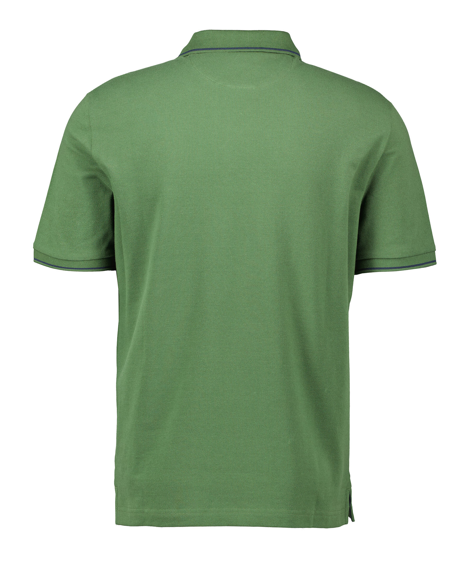 Skogsgrön Piké från Gant. Slätstickad krage med svart rand, slätstickat ärmslut med svart rand. Två knappar. Broderad logotyp på vänster bröst. Tillverkad i 100% Bomull.