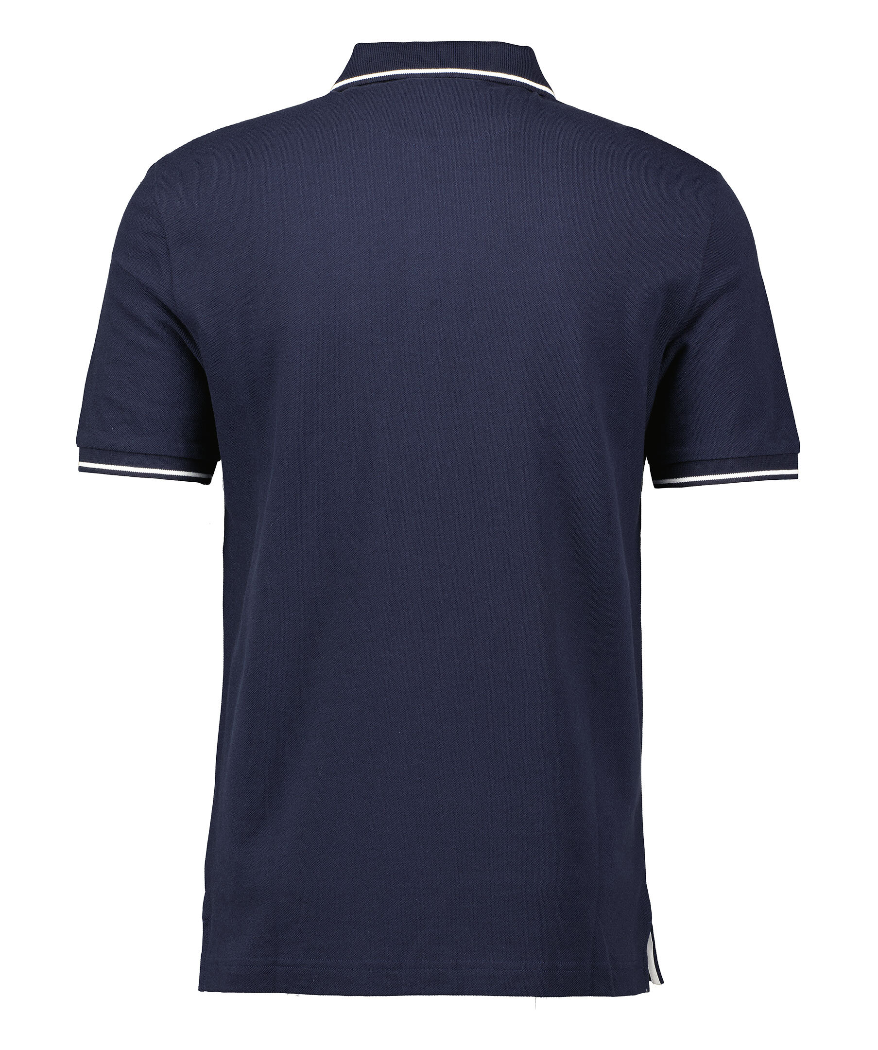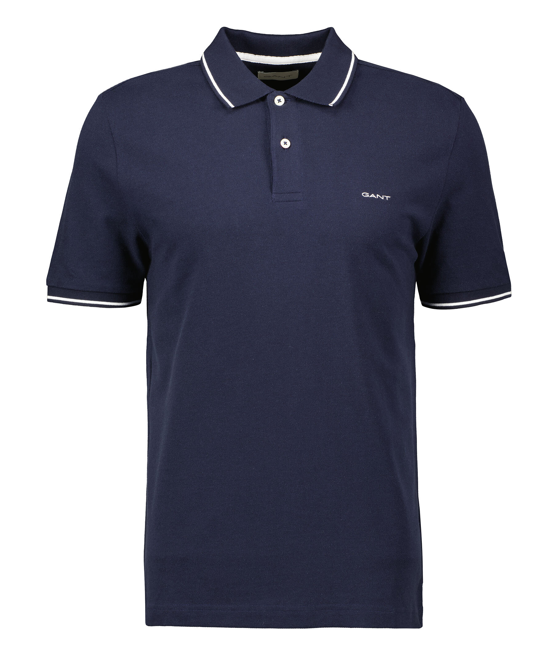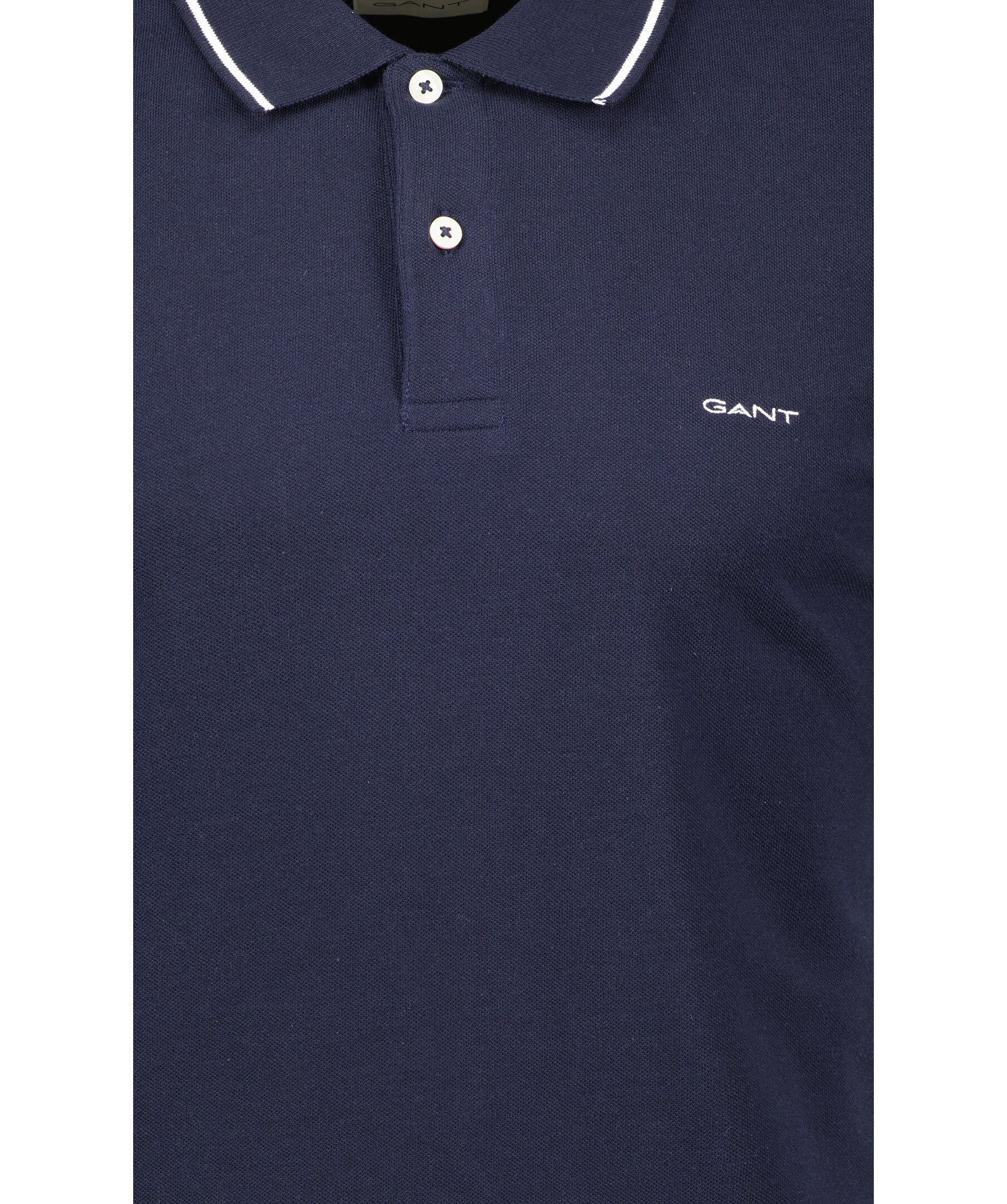Mörkblå Piké från Gant. Slätstickad krage med svart rand, slätstickat ärmslut med svart rand. Två knappar. Broderad logotyp på vänster bröst. Tillverkad i 100% Bomull.