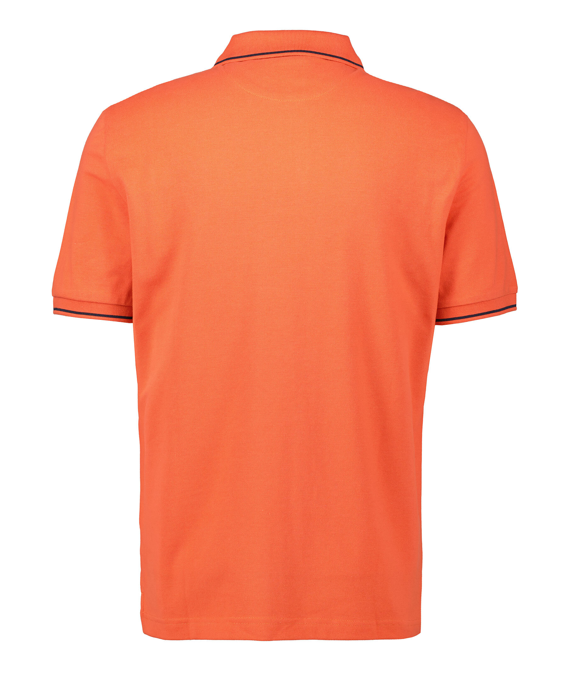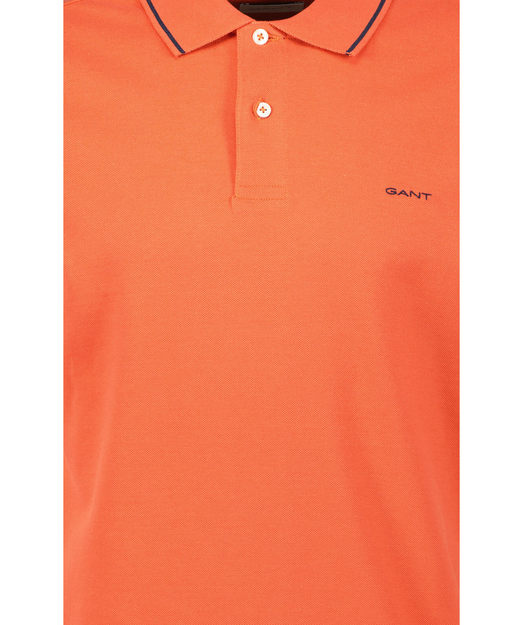 Orange Piké från Gant. Slätstickad krage med svart rand, slätstickat ärmslut med svart rand. Två knappar. Broderad logotyp på vänster bröst. Tillverkad i 100% Bomull.