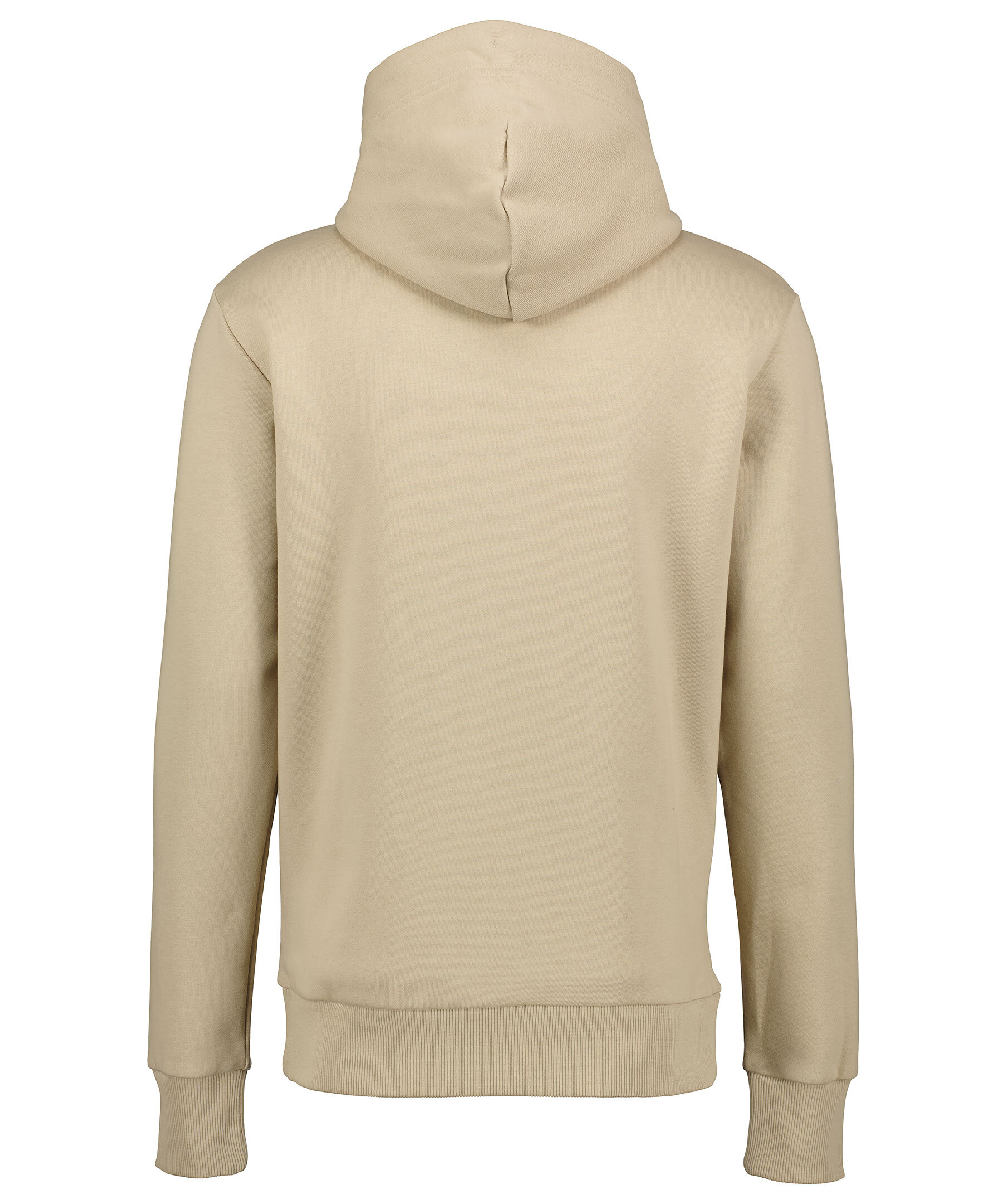 Beige hoodie från Gant. Stängs framtill med dragkedja. Luva med dragsko. Broderad logotyp på vänster bröst i vitt. Två fickor framtill på magen. Ribbstickade muddar i ärm- och plaggslut. Borstad insida. 97% Bomull 3% Elastan.