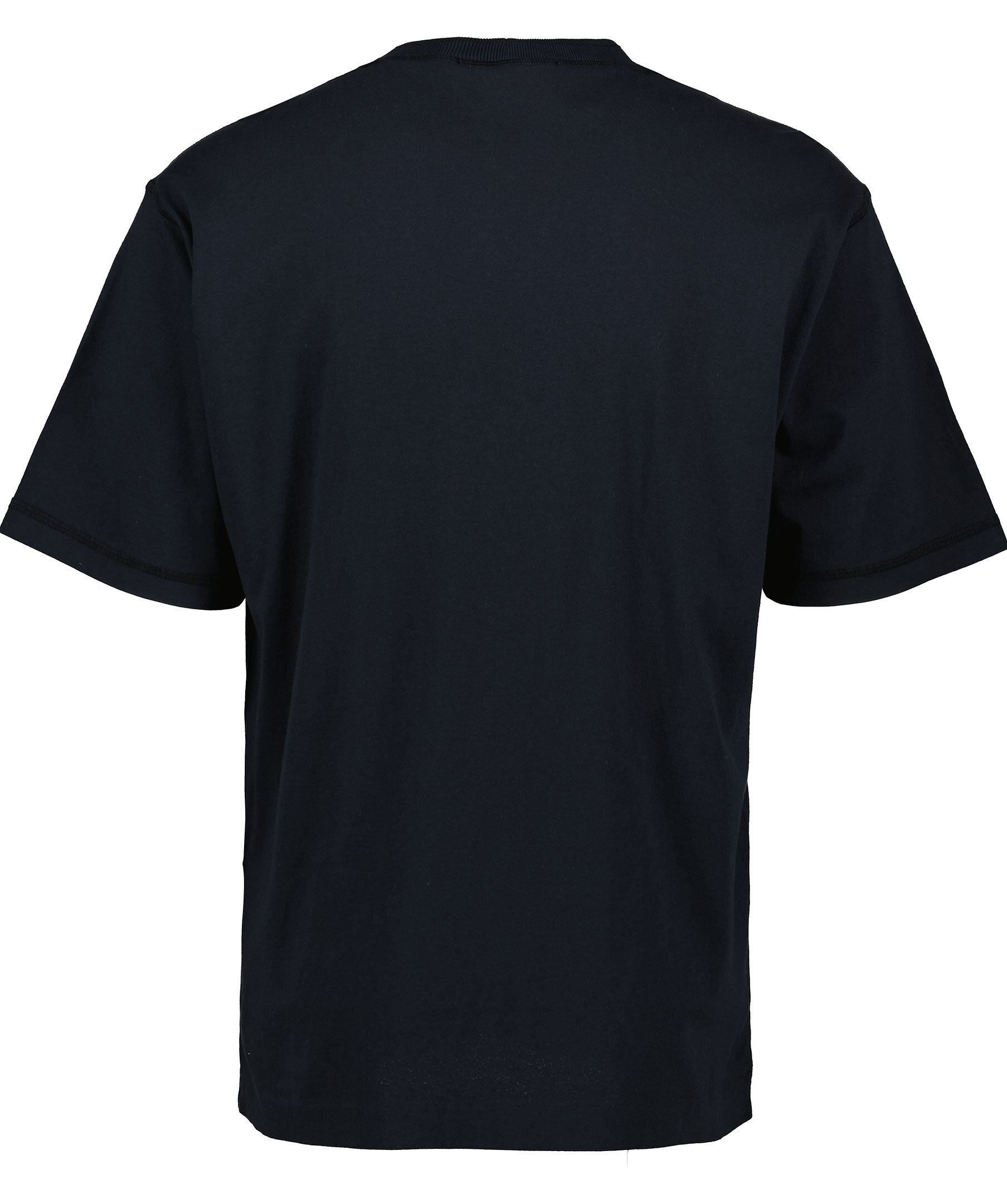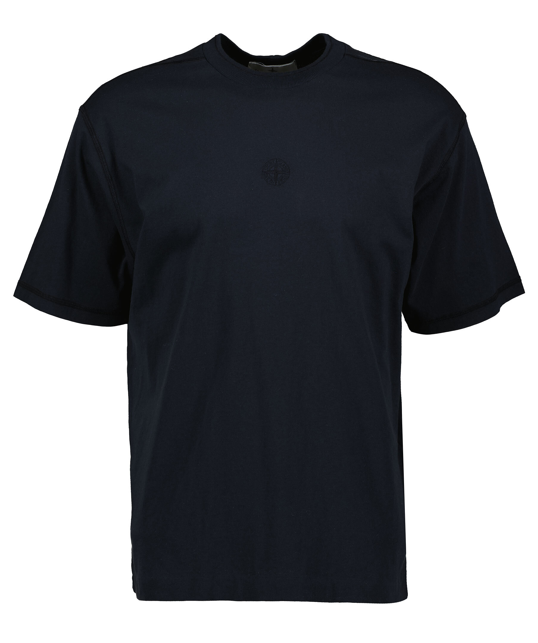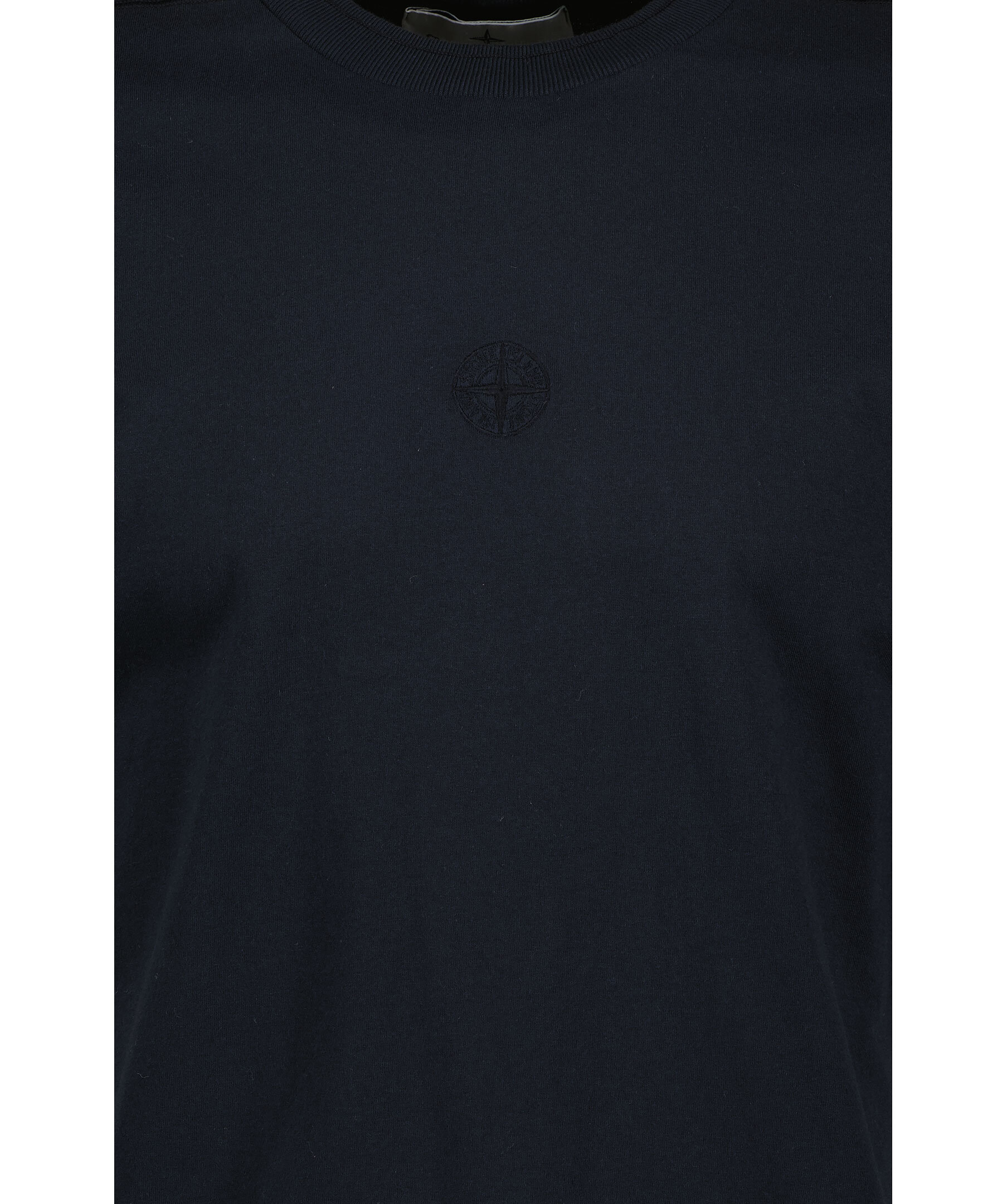Mörkblå T-shirt från Stone Island. Rundad halsringning med ribbstickad mudd. Broderad logotyp mitt på bröstet. Tillverkad i 100% bomull.