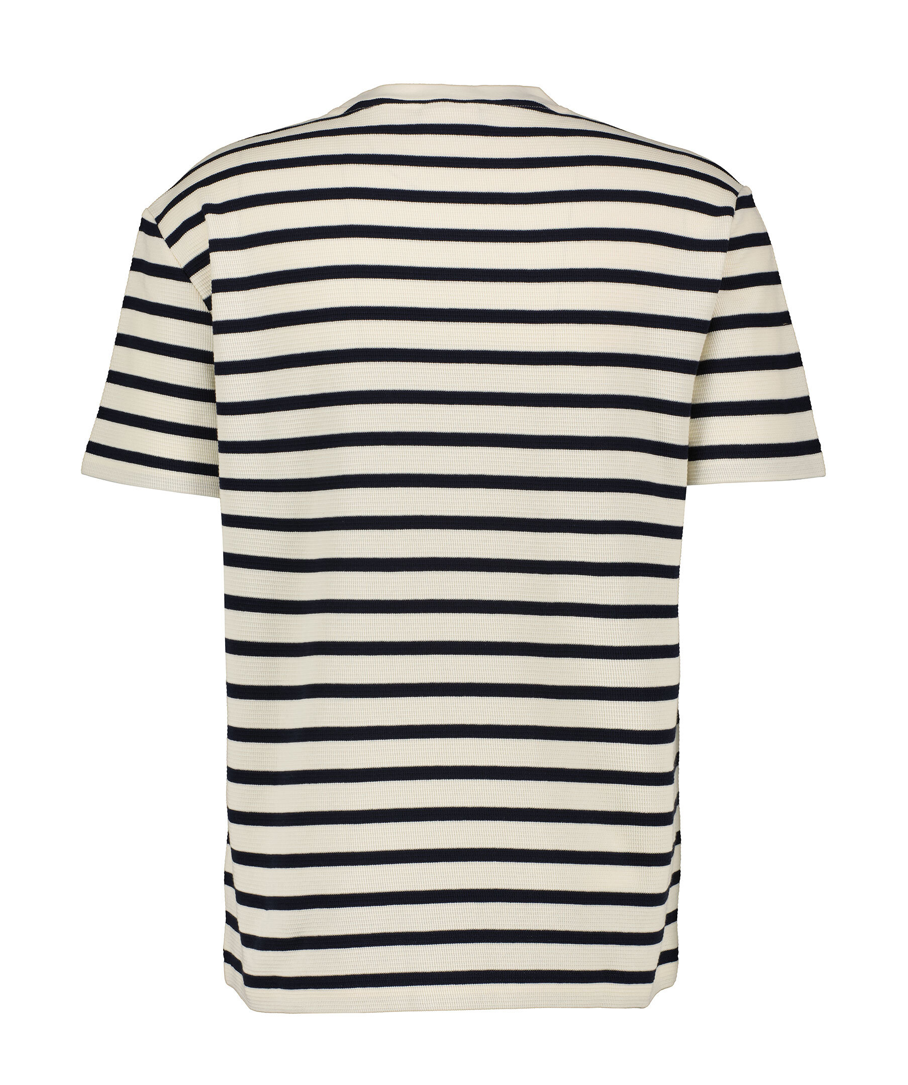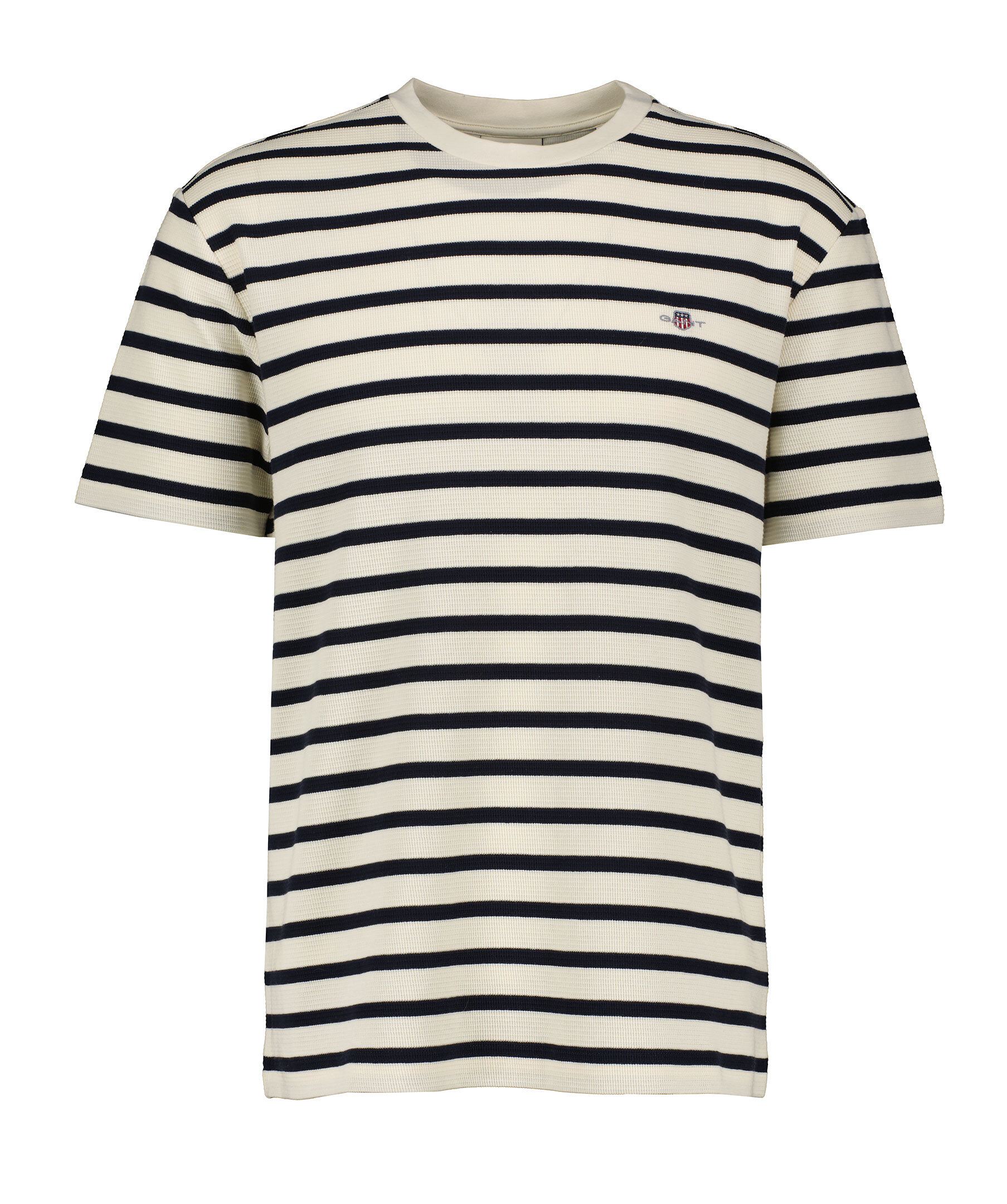 Krämvit och marinblå, randig t-shirt med våffelstruktur från Gant. T-shirten har rundad halsringning och korta ärmar samt liten broderad logotyp på bröstet. Tillverkad i bomull.