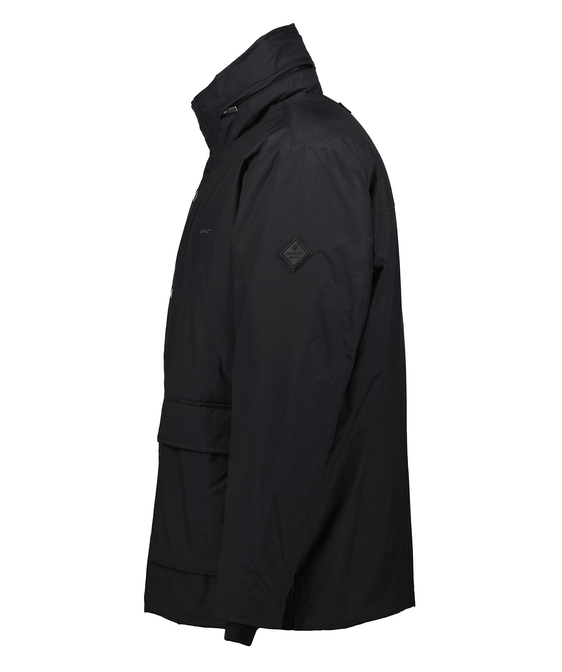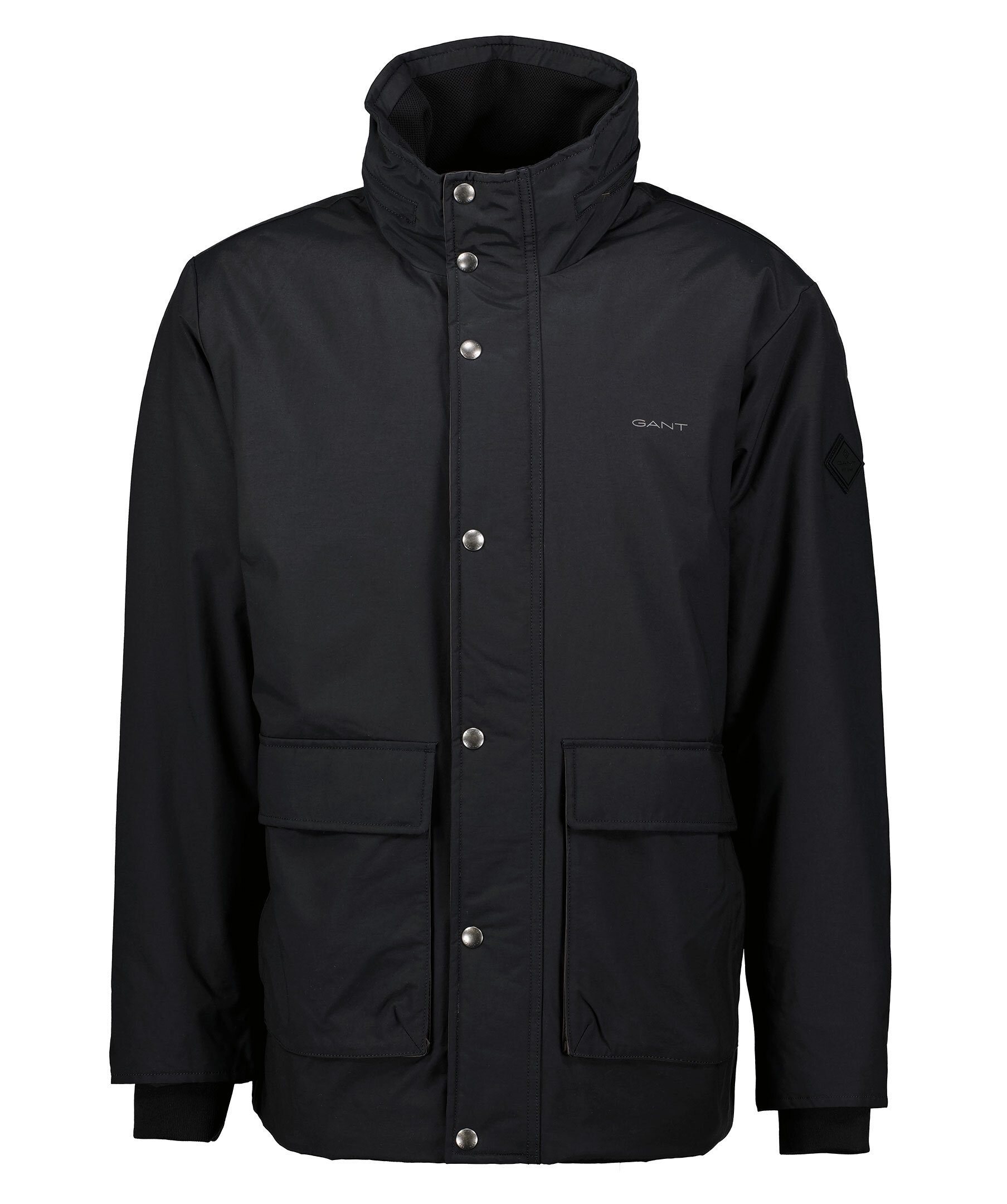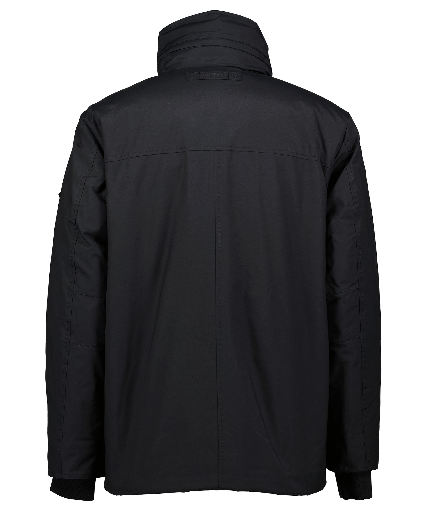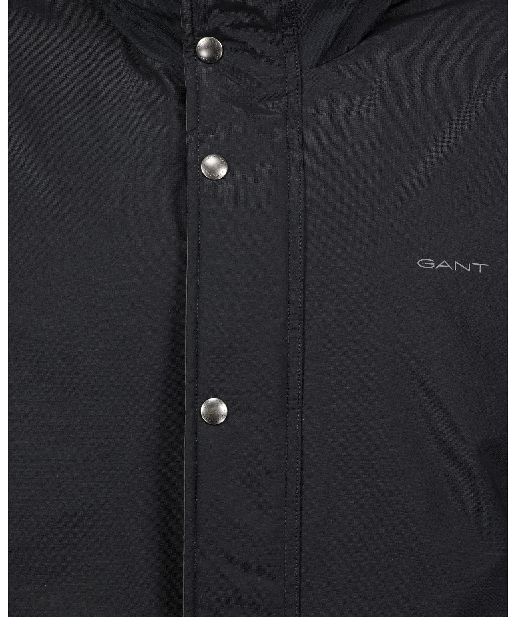Svart vadderad jacka från Gant. Stängs framtill med tvåvägsdragkedja och tryckknappar. Tryckt logotyp på vänster bröst. Ribbstickade muddar vid ärmslut. Utvikbar luva i kragen. Locker loop baktill på ryggen med broderad logotyp.