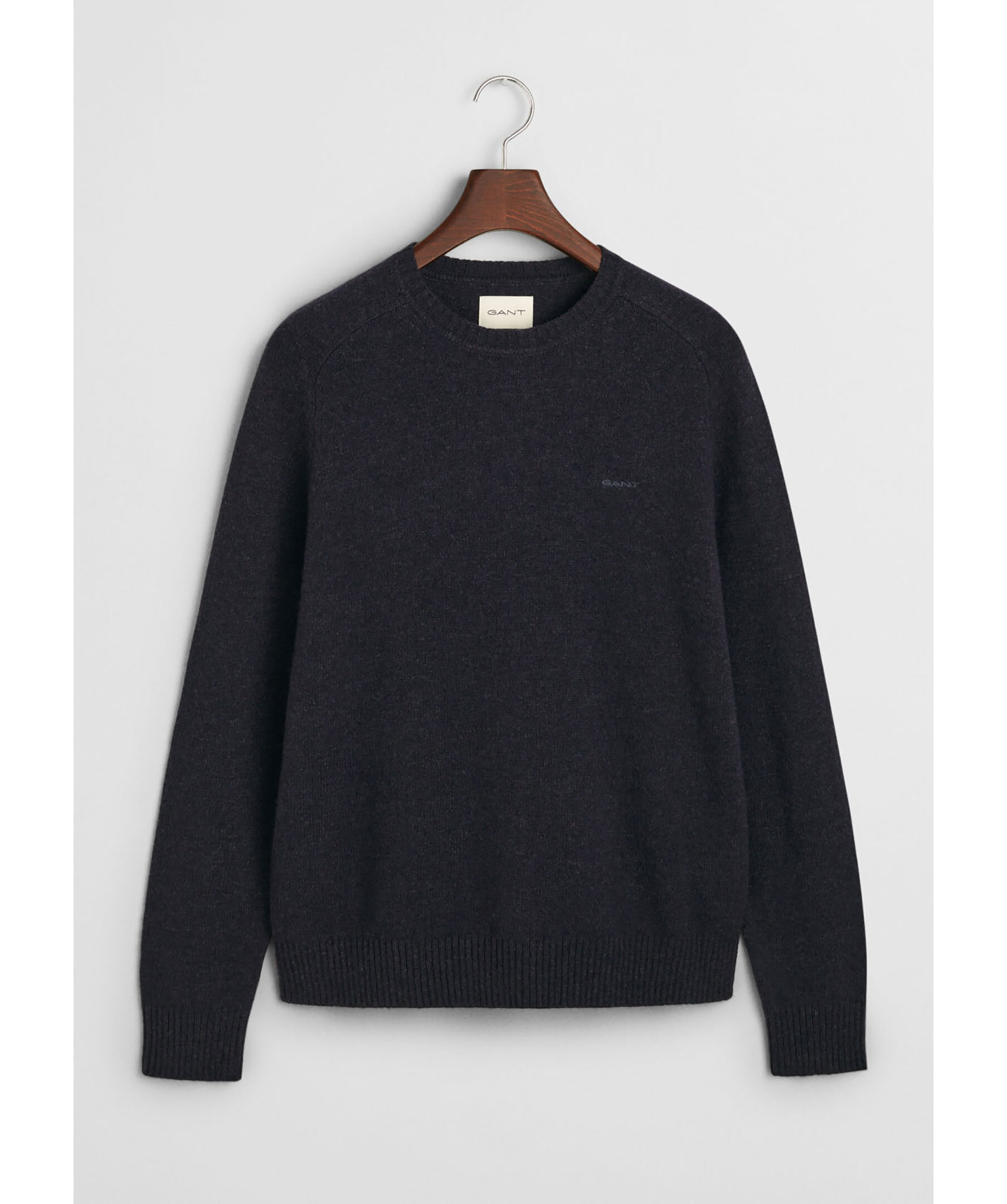 Mörkblå stickad tröja från Gant. Tröjan har en rund, ribbstickad halsringning samt ribbstickade muddar vid ärm- och plaggslut. Liten broderad GANT-logotyp på bröstet. Tillverkad i en ullblandning.