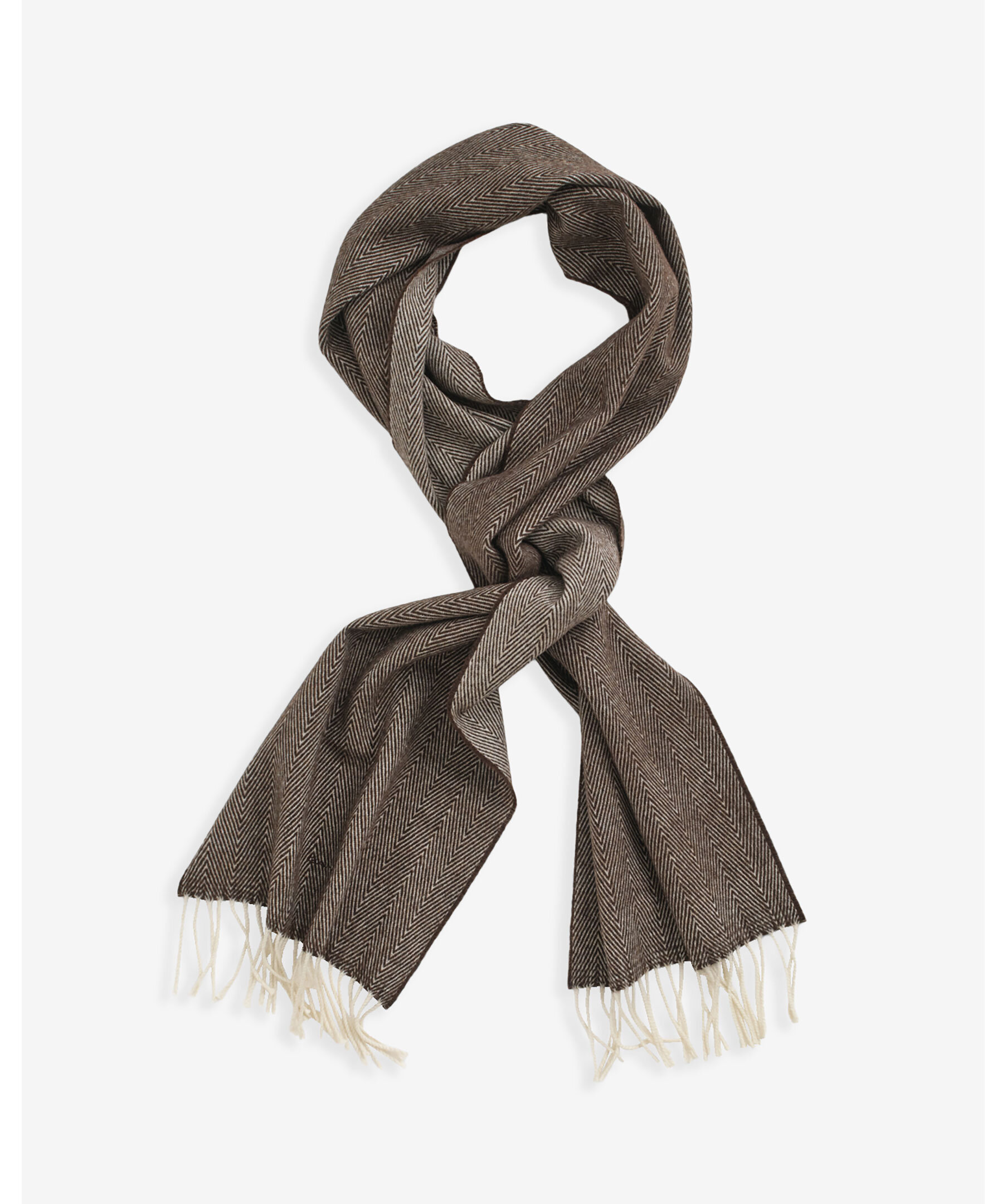 Halsduk från GANT. Tillverkad i 100% merinoull och har ett klassiskt tvåfärgat fiskbensmönster. Den är försedd med fransade kanter och ett tonalt broderat GANT-logo vid nederkanten. Med sina mått på 180 x 30 cm