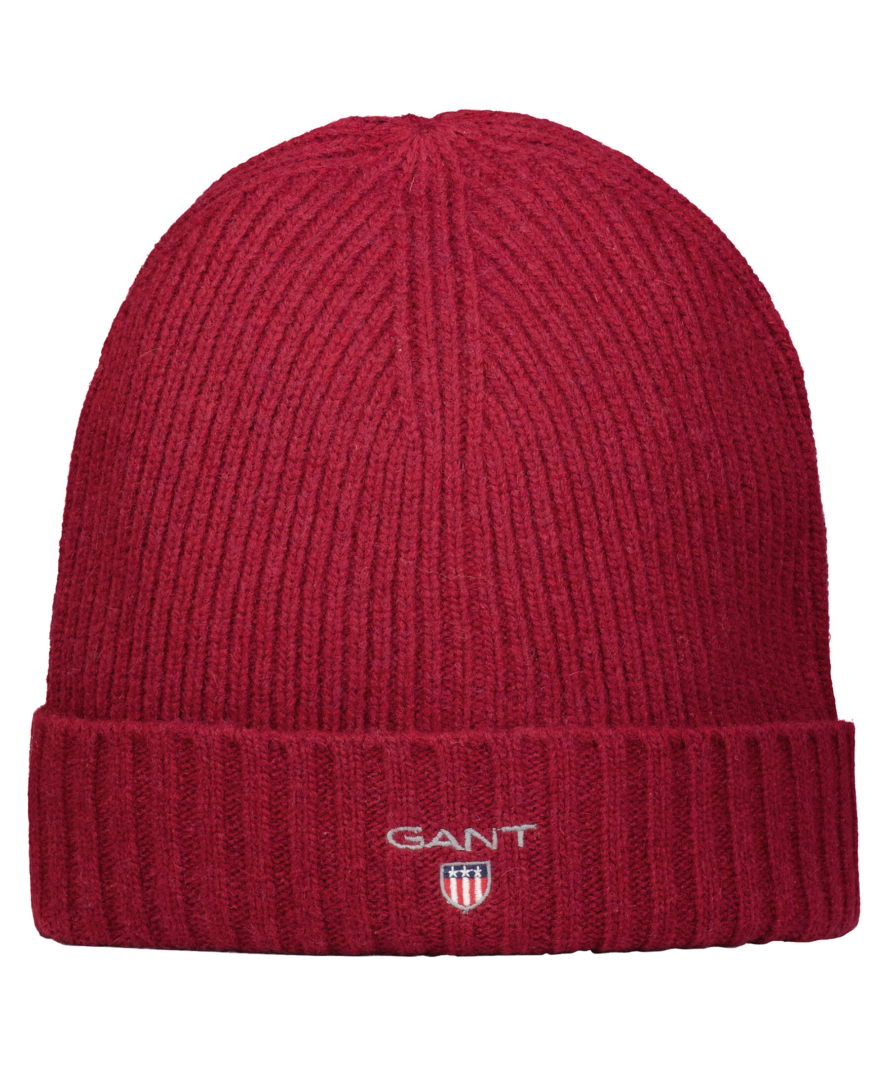 Vinröd, mellantjock ribbstickad mössa med uppvikt kant från Gant. Broderad logotyp fram. Gjord i ullblandning med grått foder i bomullsblandning.