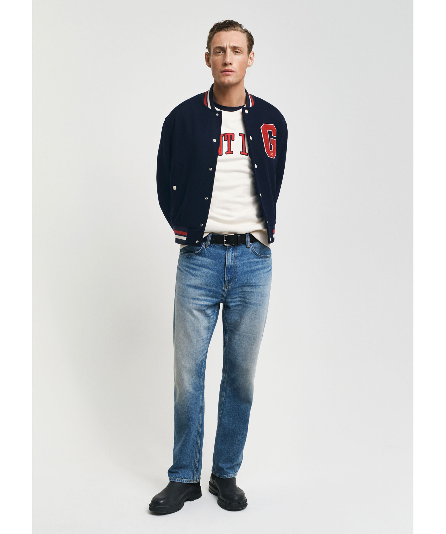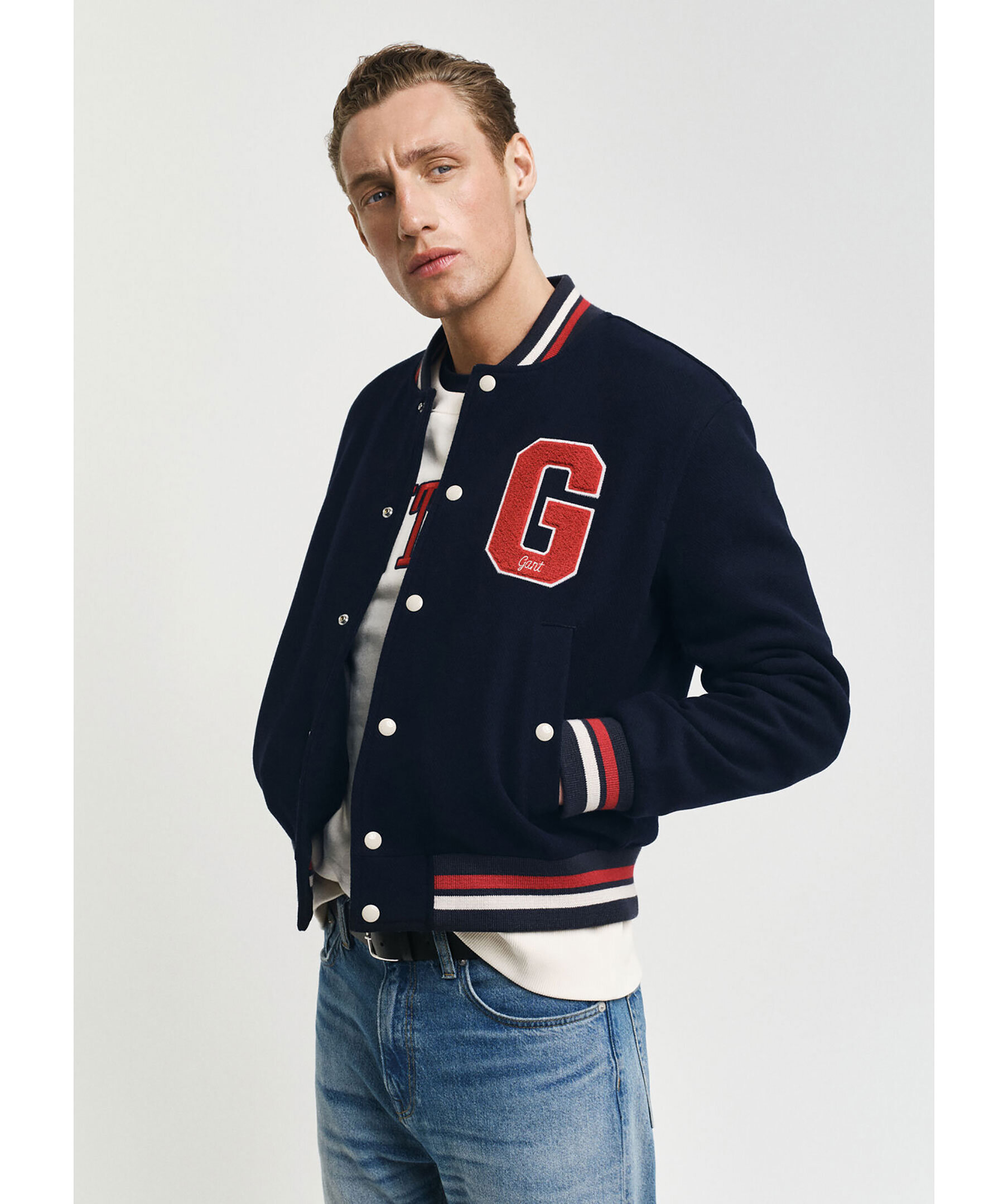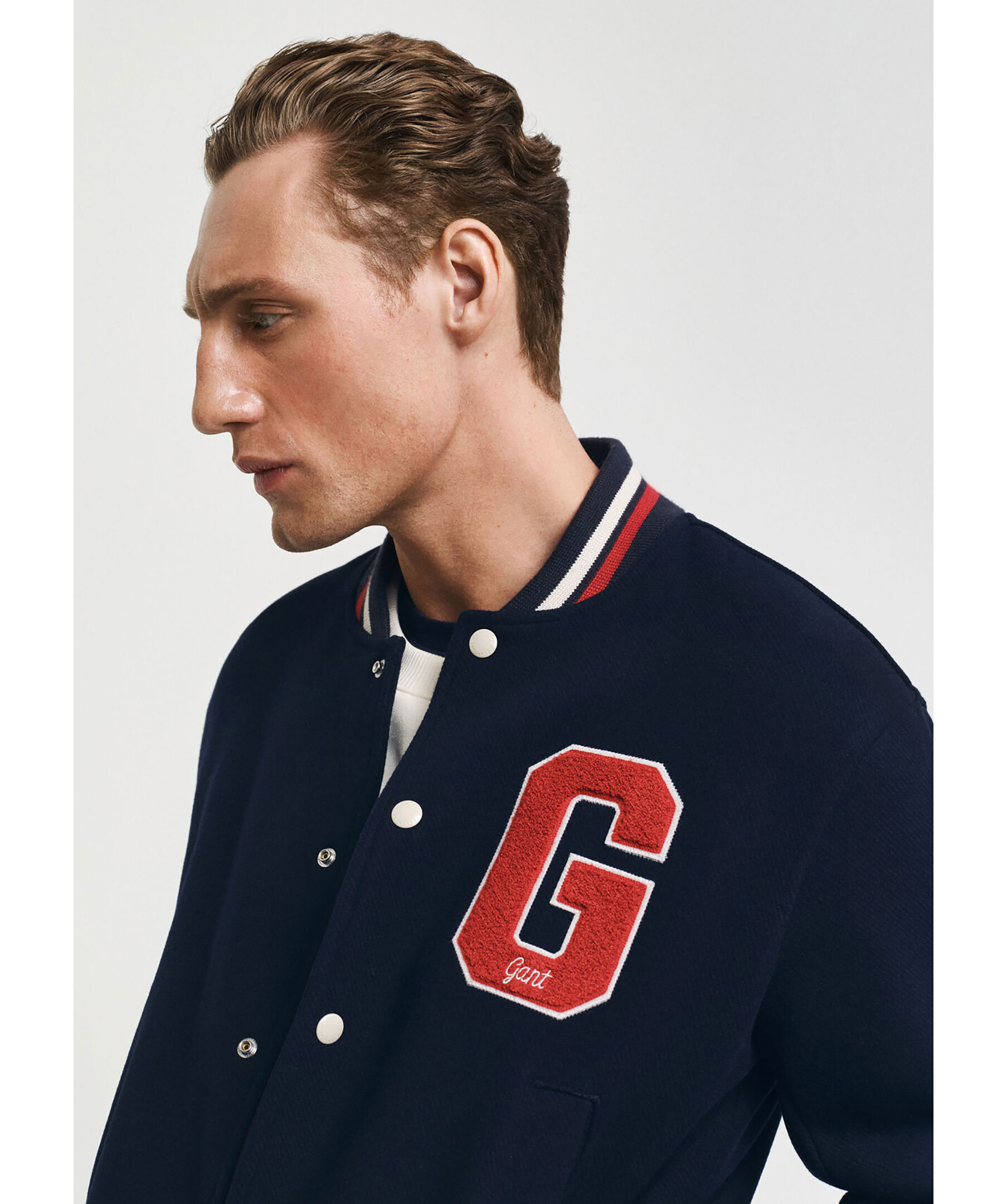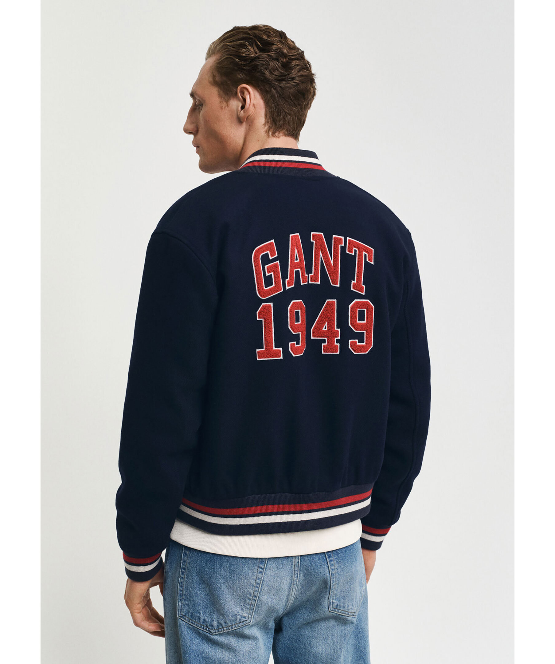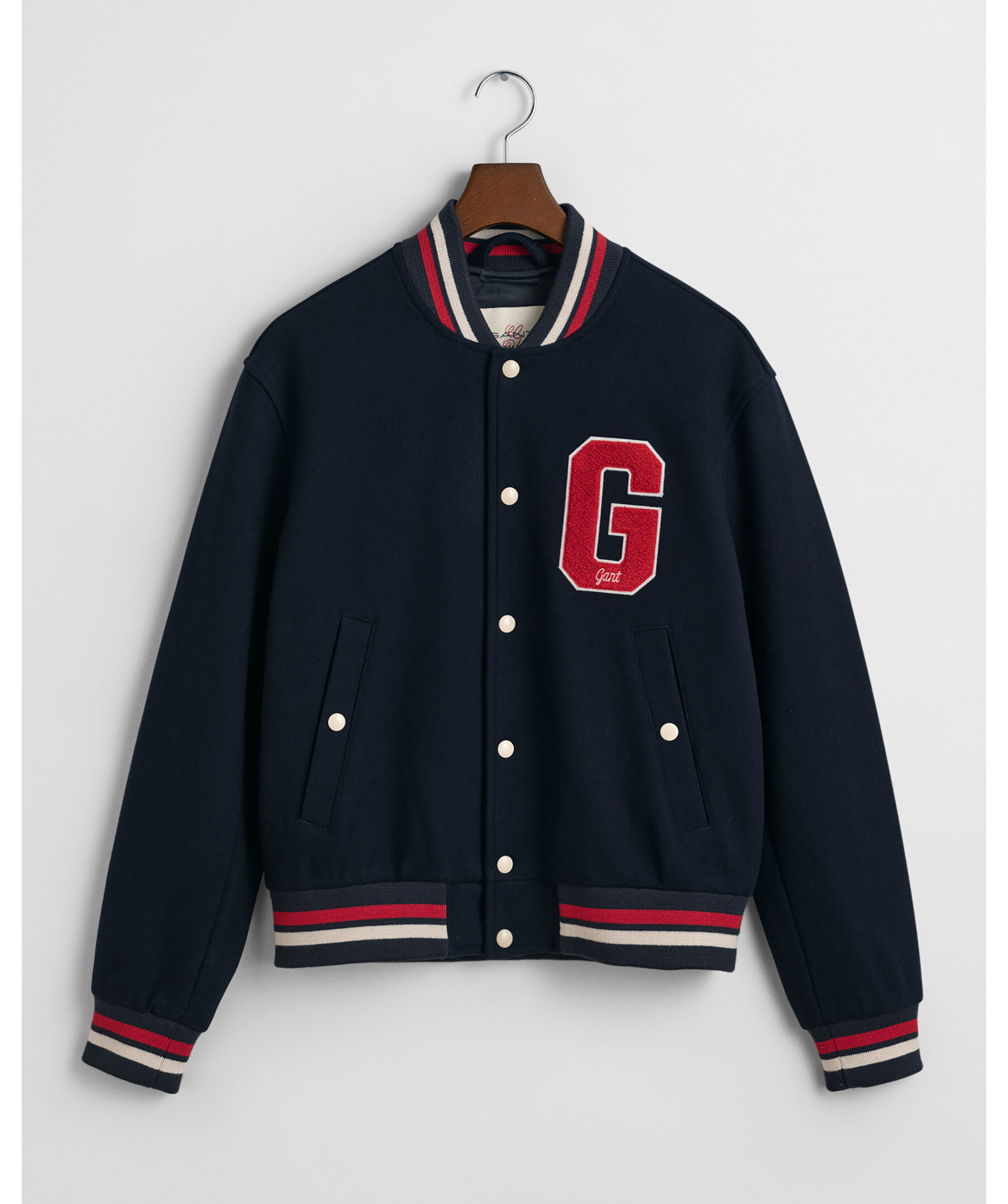Mörkblå collegejacka från Gant. Jackan är inspirerad av vintageplagg från GANT och har traditionella collegedetaljer som knäppning med tryckknappar fram, bomberkrage och randiga ribbstickade muddar. Den har två ytterfickor med knapp samt två innerfickor och GANT-märke på bröst och rygg. Tillverkad i en ullblandning.