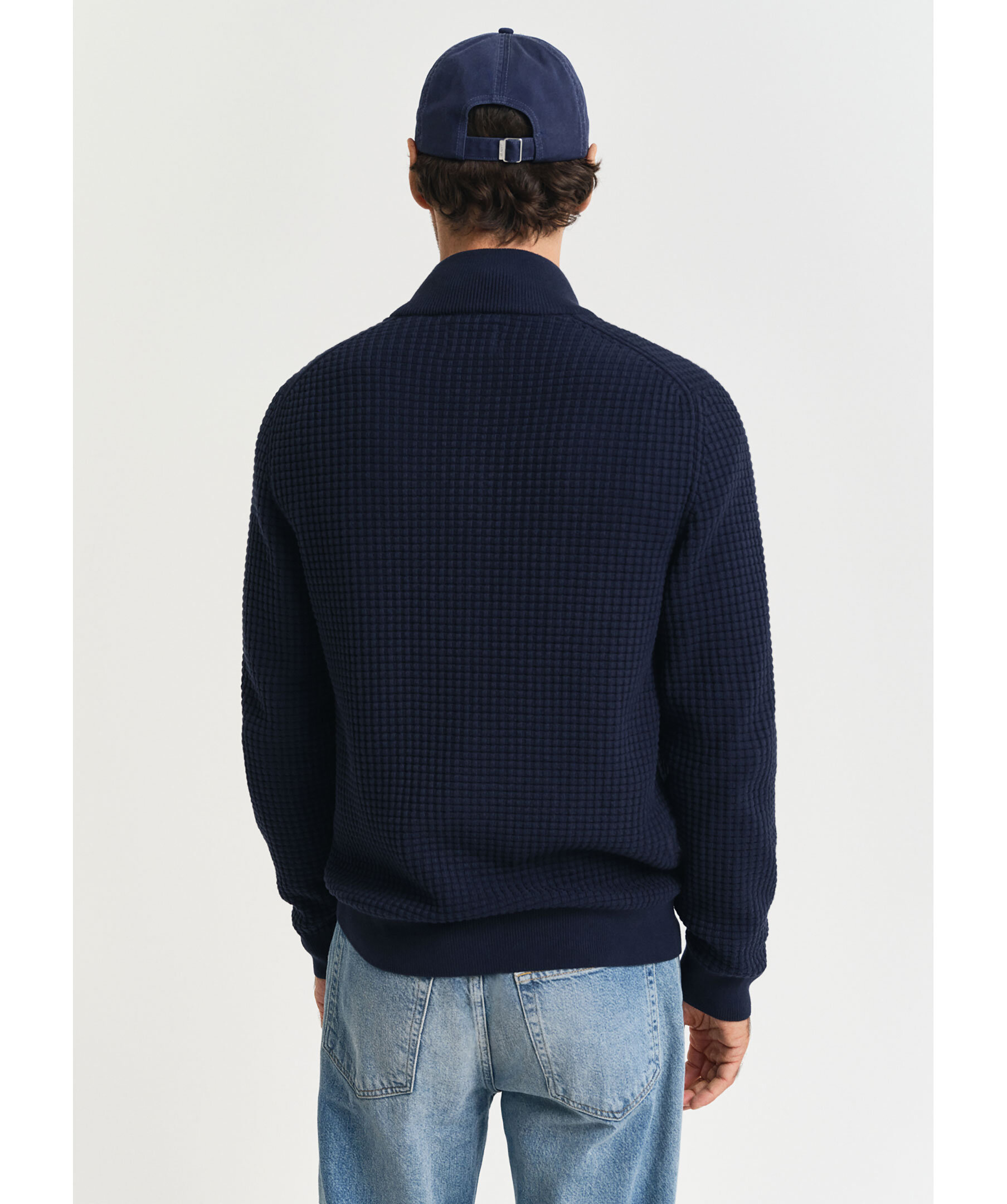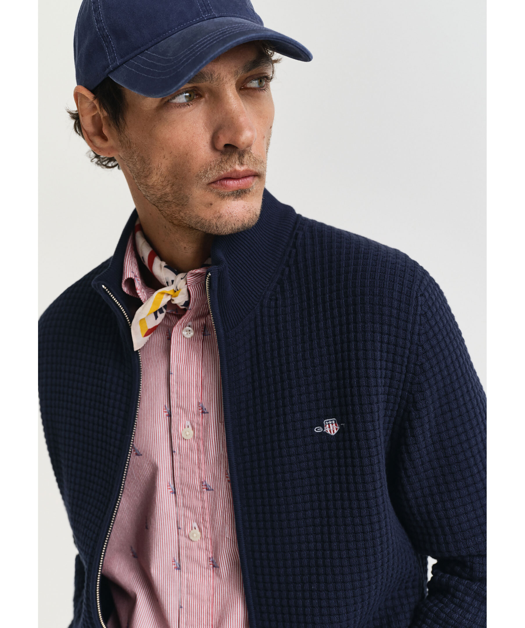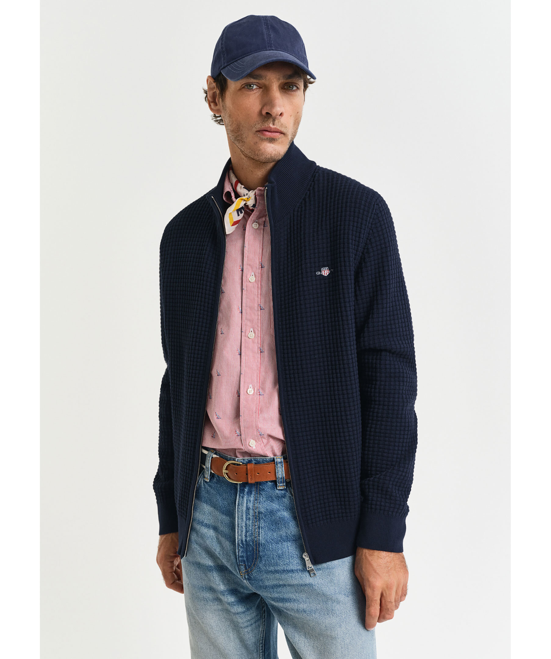 Mörkblå stickad cardigan från Gant. Tröjan har dragkedja fram, ribbstickad krage, samt tröj- och ärmslut. Liten broderad logotyp på vänster bröst. Tillverkad av bomull.