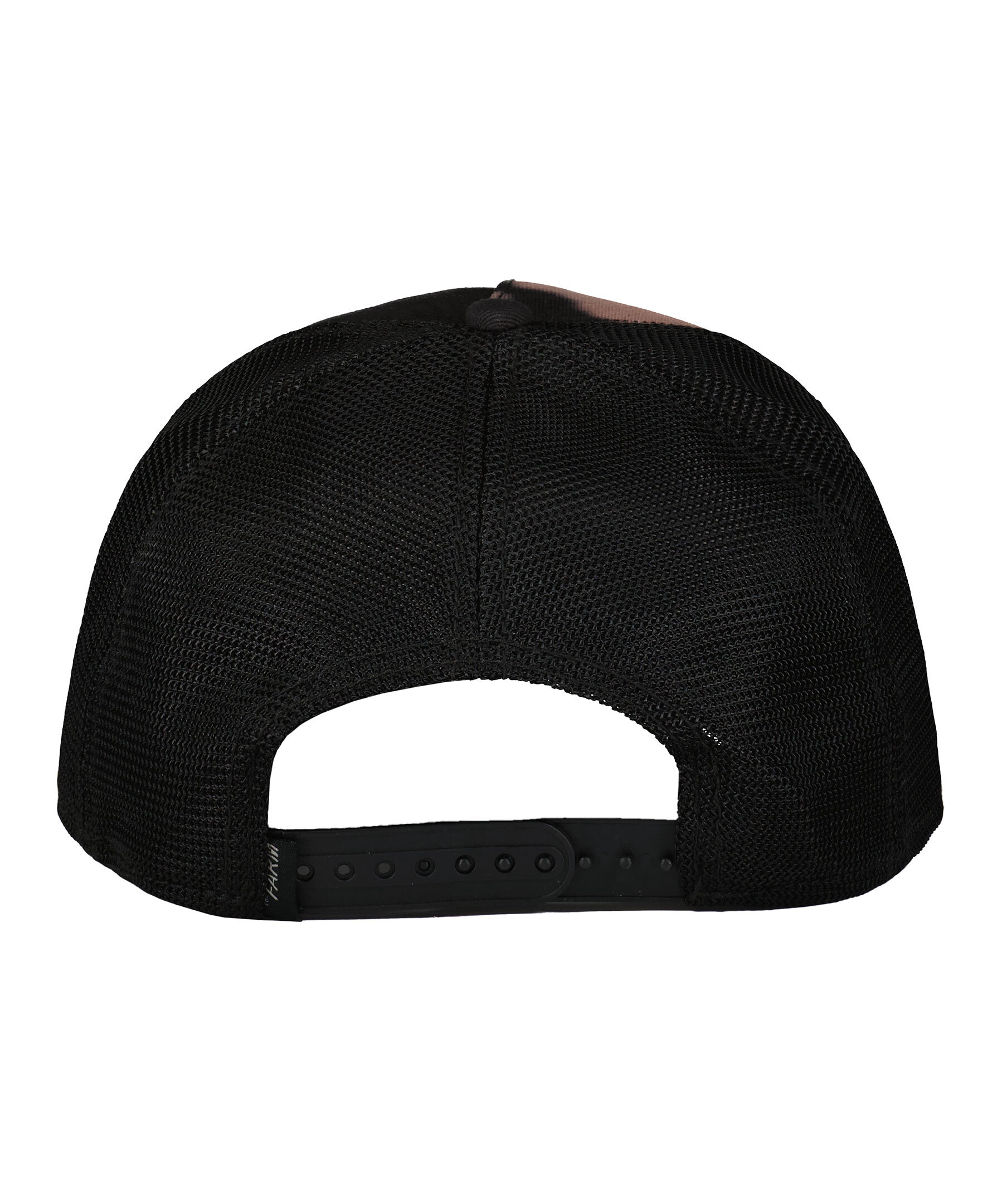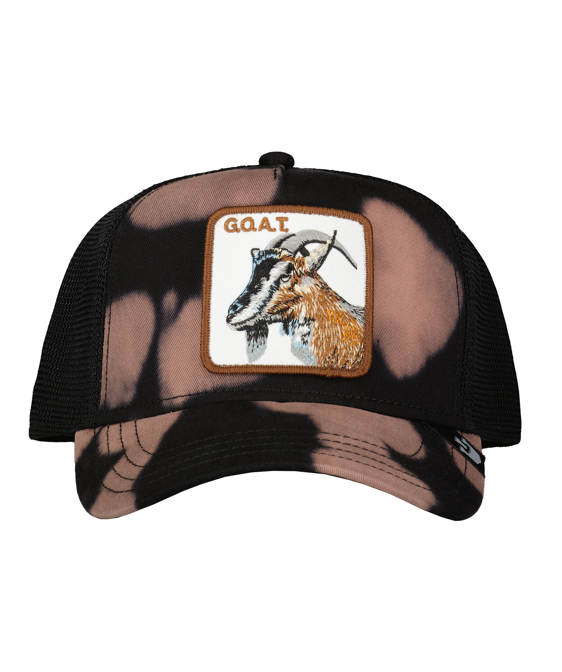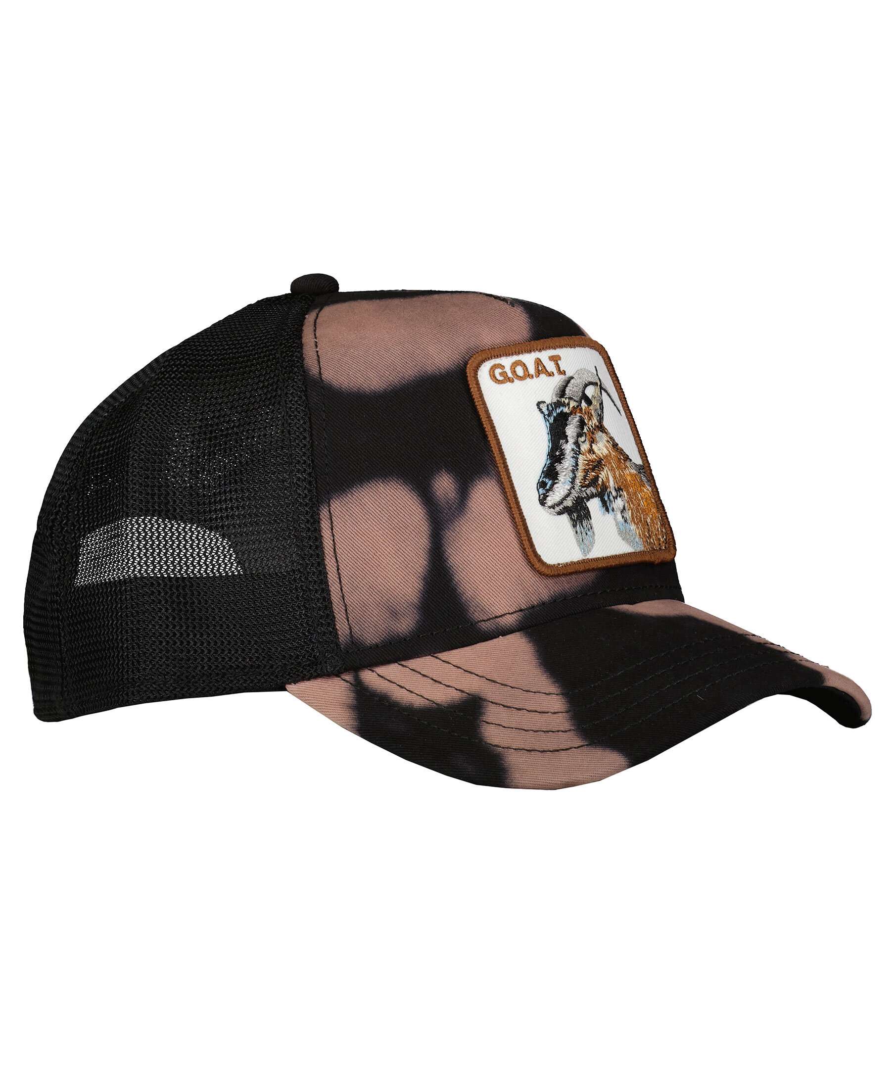 Svart keps med meshtyg i trucker-basebollmodell från Goorin Bros. Framsidan är mönstrad. Fyrkantig patch med en get framtill. Onesize storlek med ett justerbart 4-snap-in-rem, vilket betyder att storleksintervallet är 55 cm-61 cm med 58 cm i mitten. Ett bomullssvettband finns fastsytt på insidan. Tillverkad i en polyesterblandning.