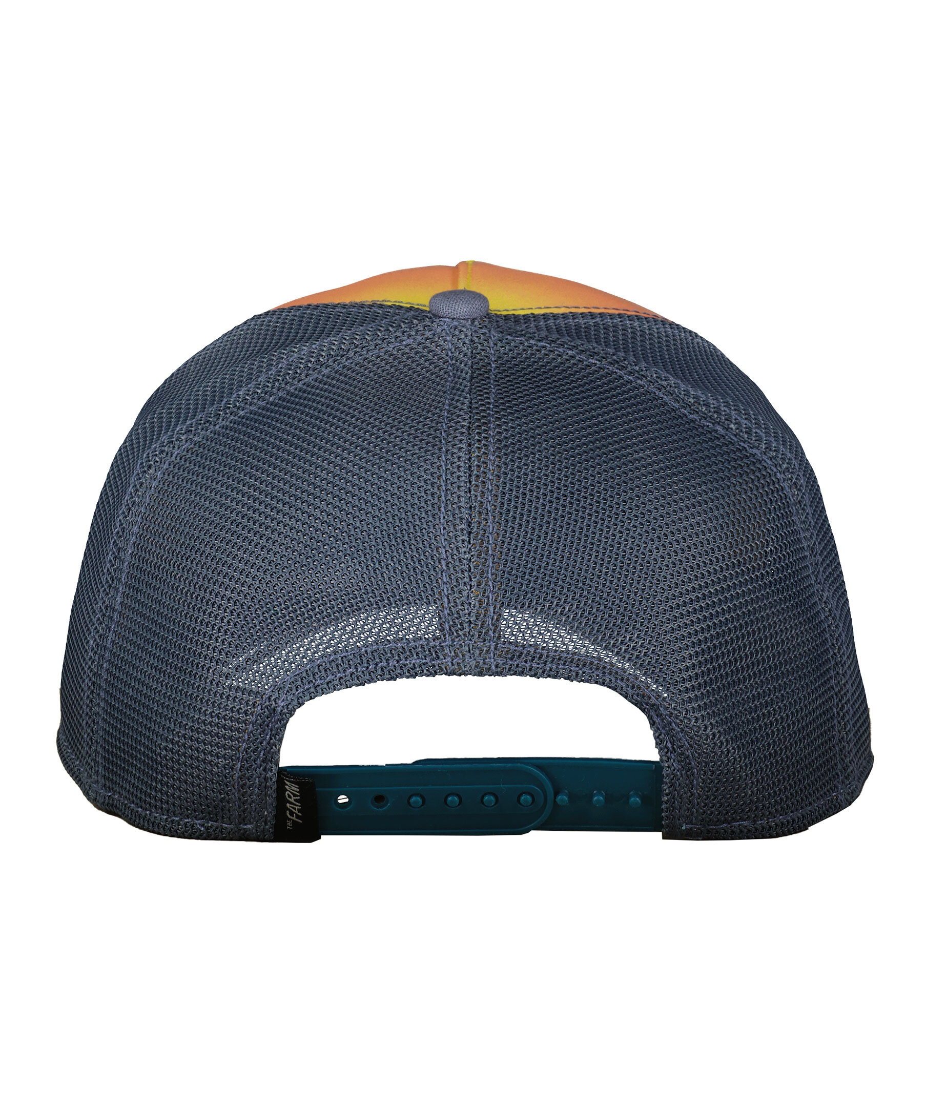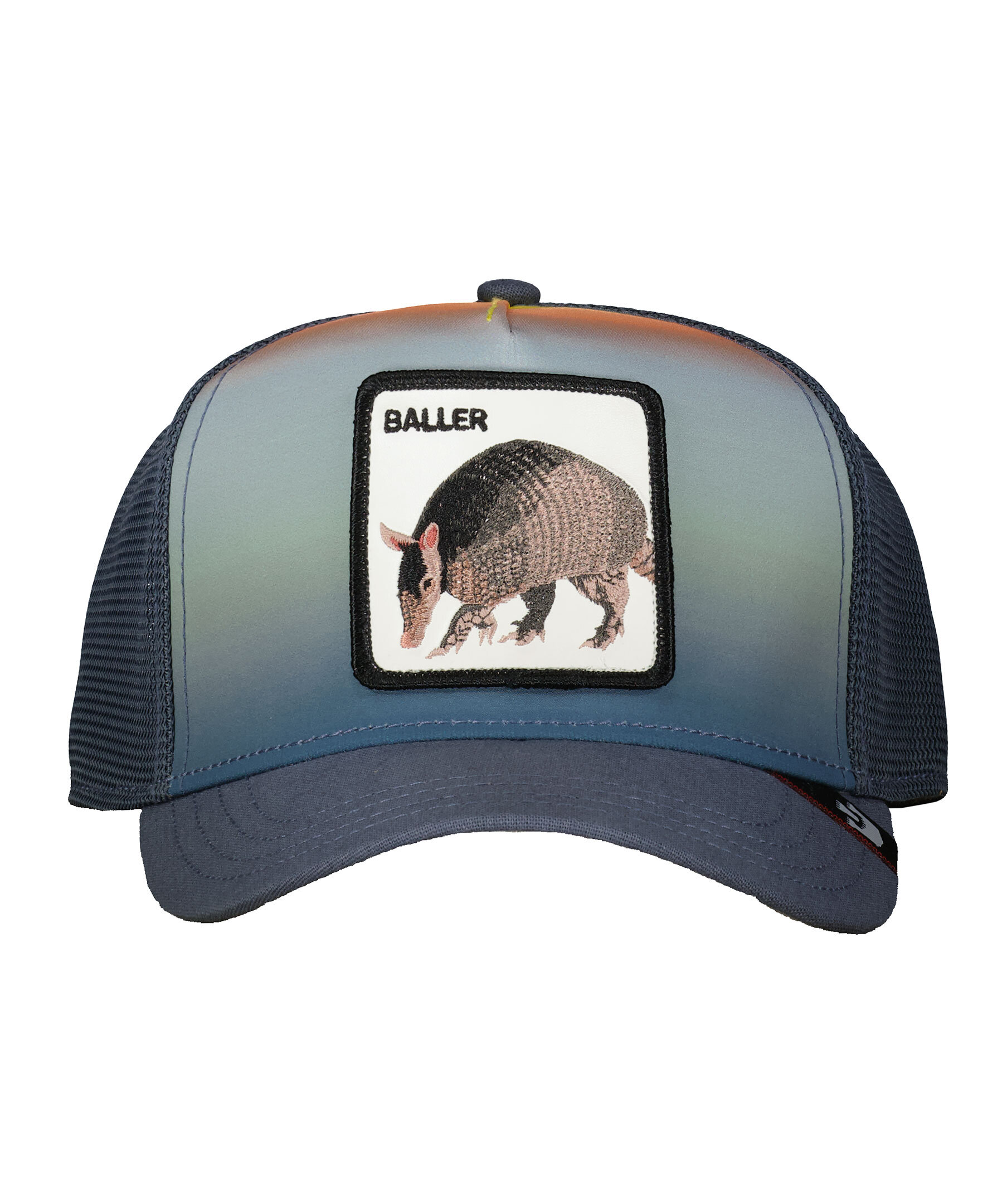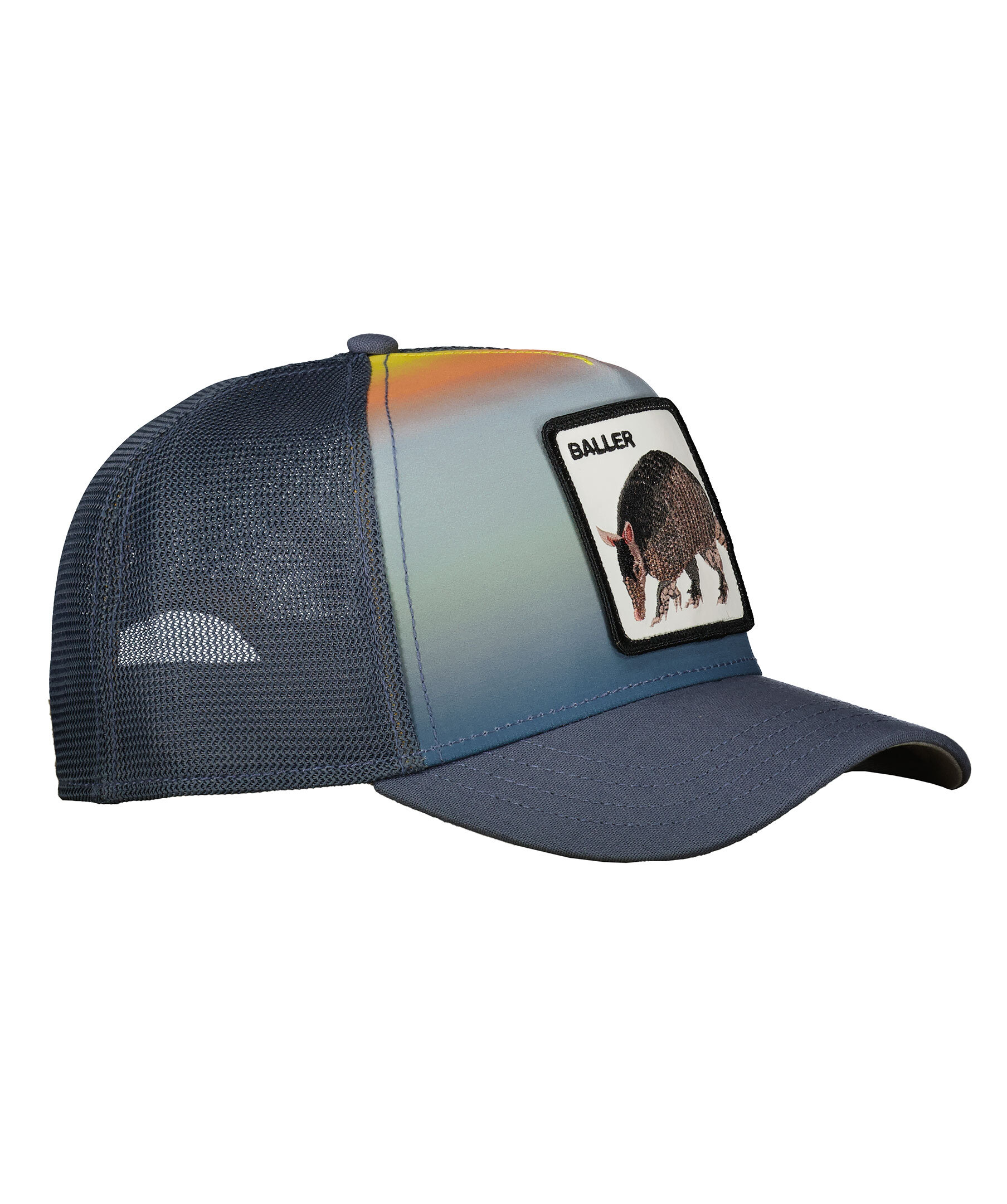 Blå keps med gul till blå fade på framsidan samt meshtyg i bak i trucker-basebollmodell från Goorin Bros. Fyrkantig patch med ett bältdjur framtill. Onesize storlek med ett justerbart 4-snap-in-rem, vilket betyder att storleksintervallet är 55 cm-61 cm med 58 cm i mitten. Tillverkad i en polyesterblandning.