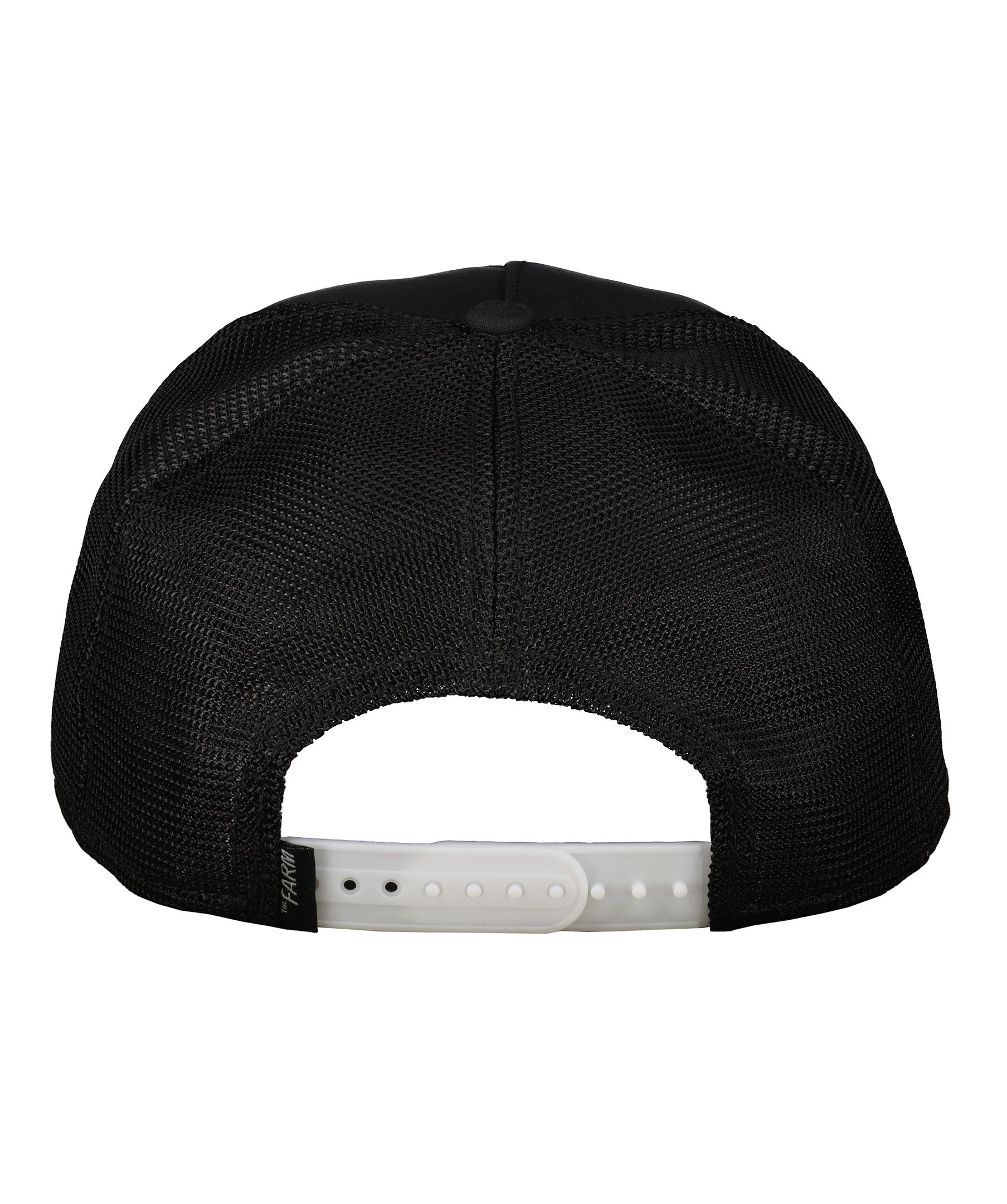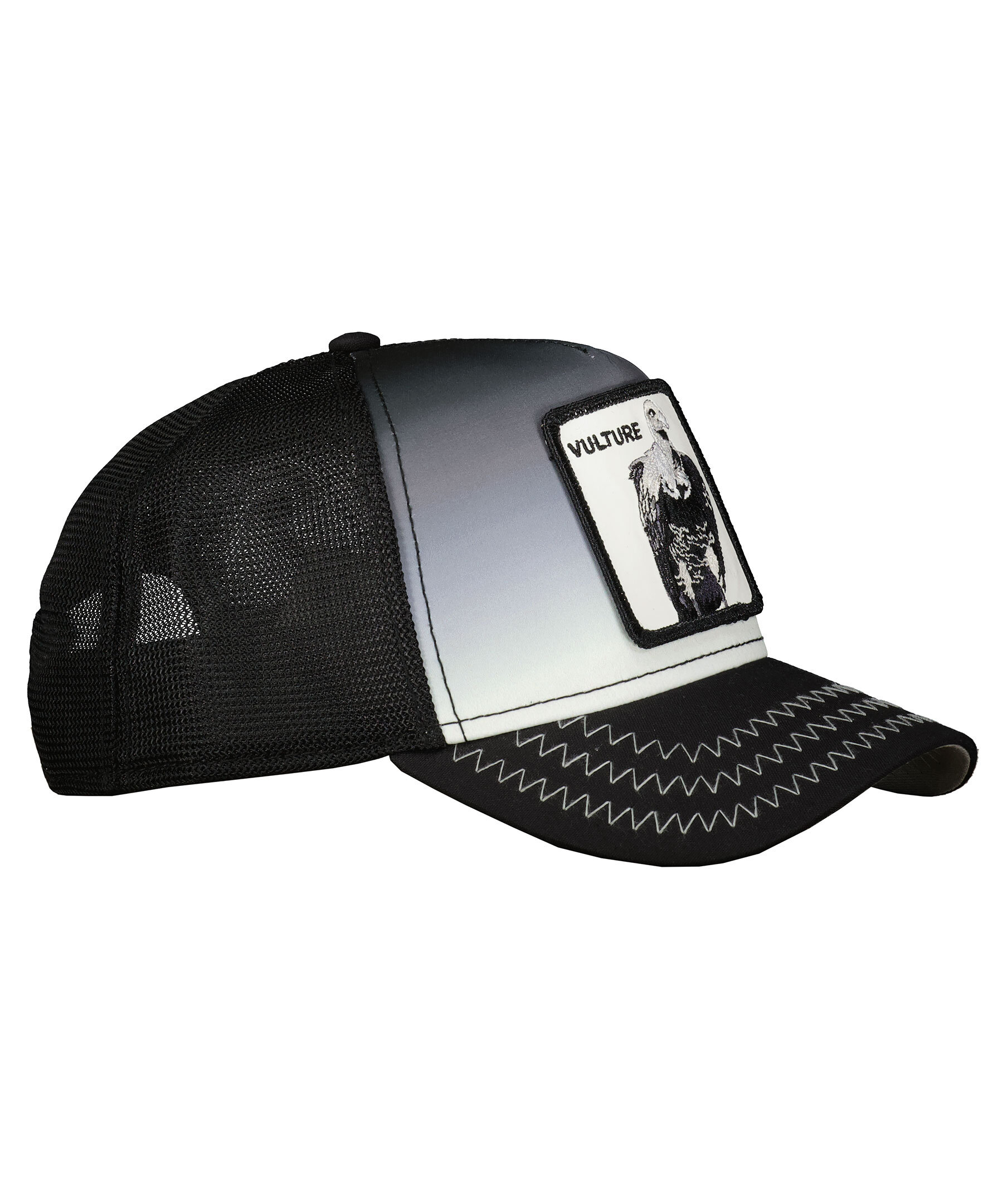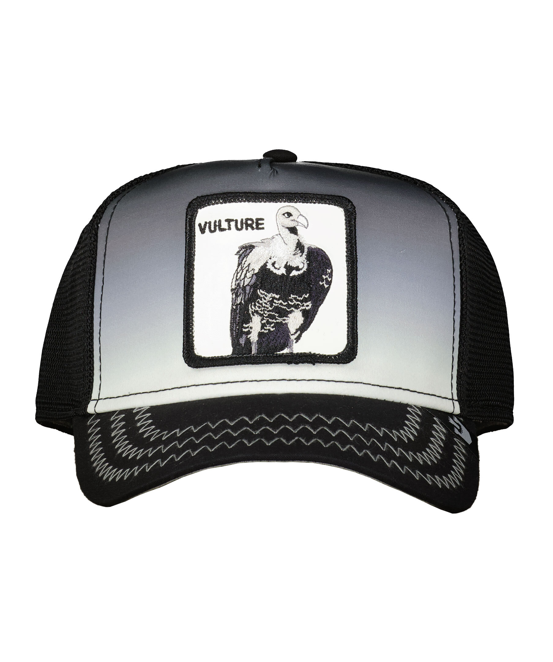 Svart keps med svart till vit fade på framsidan samt meshtyg i bak i trucker-basebollmodell från Goorin Bros. Fyrkantig patch med en gam framtill, vita sick-sakc sömmar på skärmen. Onesize storlek med ett justerbart 4-snap-in-rem, vilket betyder att storleksintervallet är 55 cm-61 cm med 58 cm i mitten. Tillverkad i en polyesterblandning.