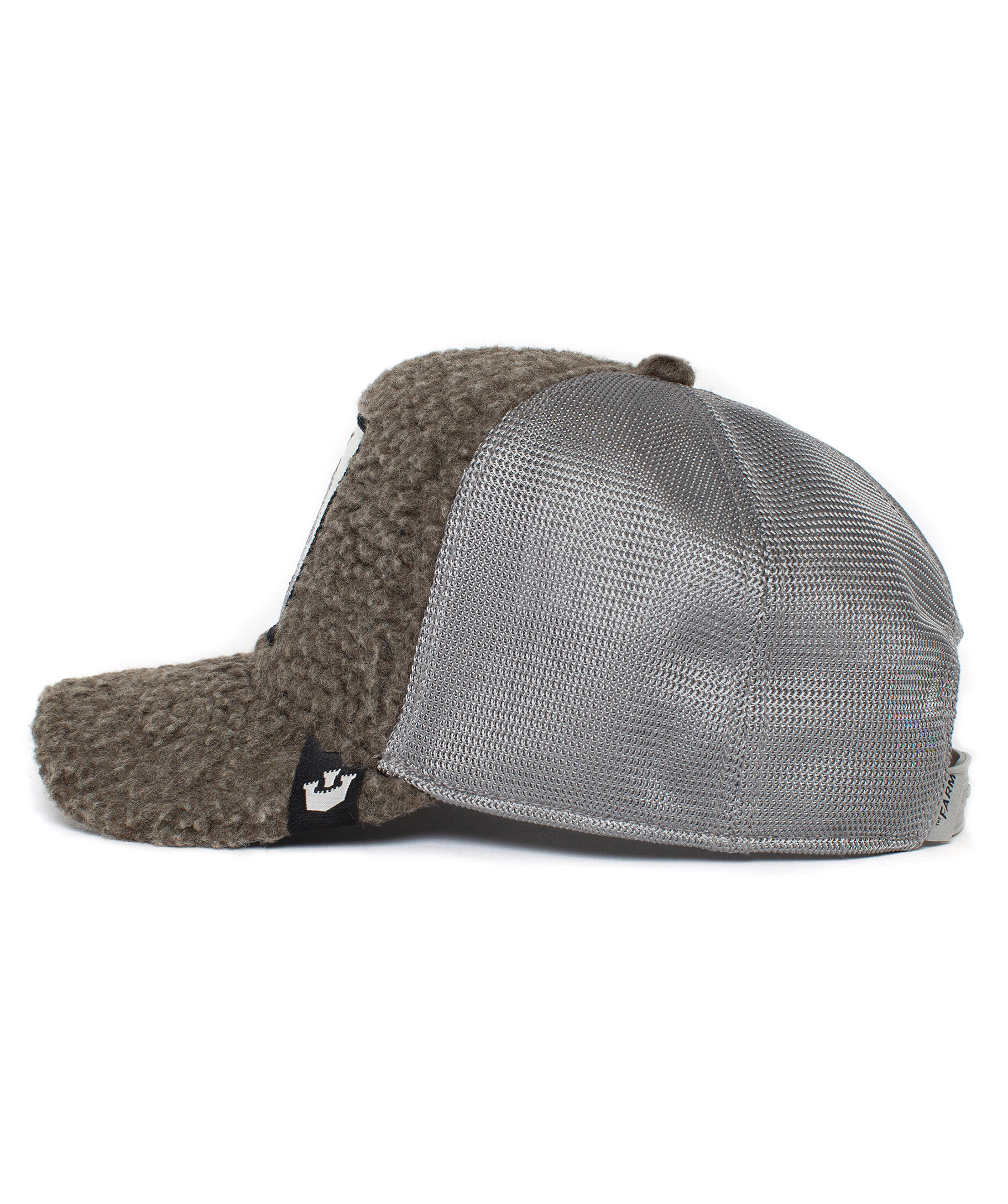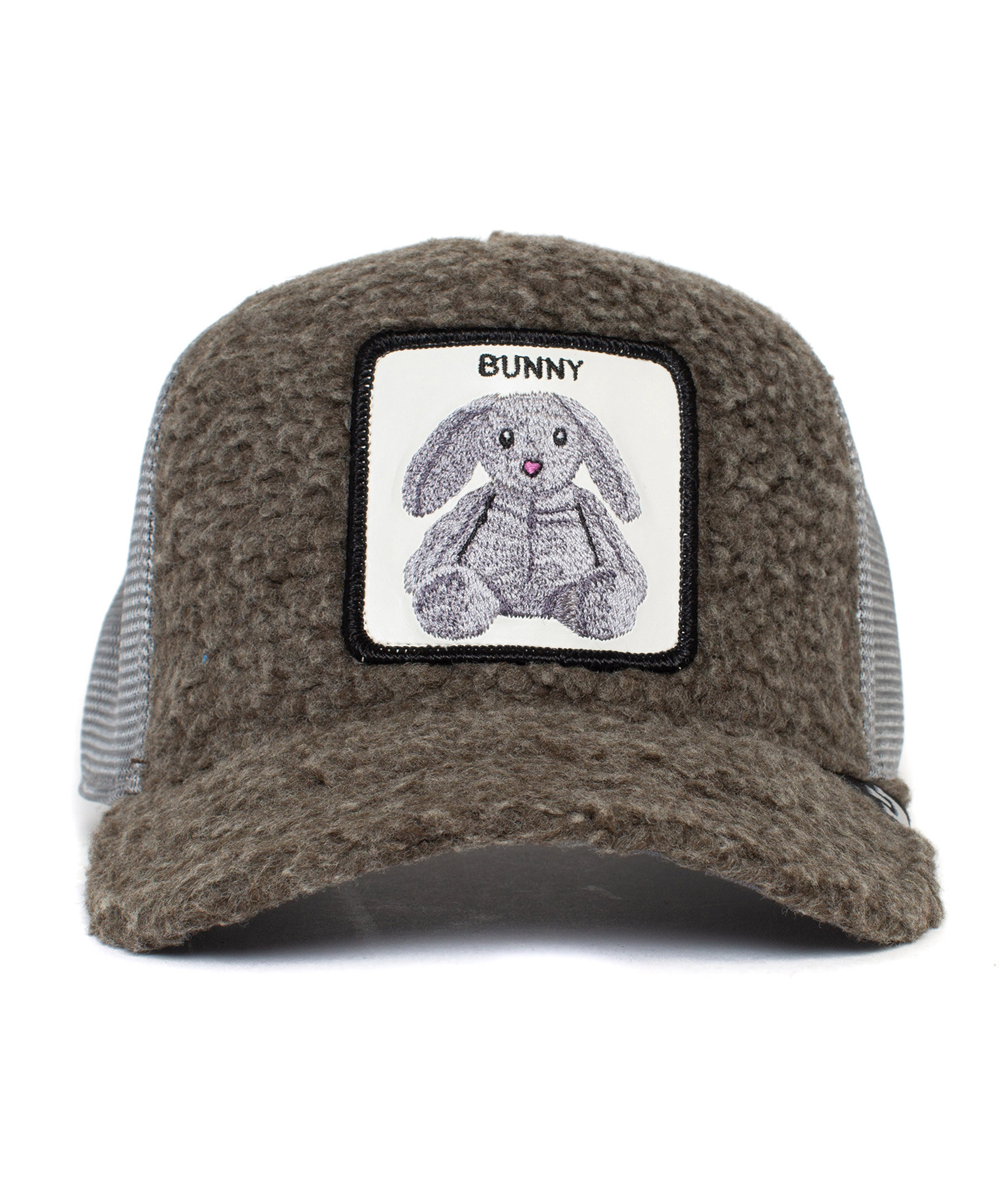 Grå keps i trucker-baseboll modell från Goorin Bros. Teddytyg och fyrkantig patch med en kanin framtill. Onesize storlek med ett justerbart 4-snap-in-rem, vilket betyder att storleksintervallet är 55 cm-61 cm med 58 cm i mitten. Ett bomullssvettband finns fastsytt på insidan. Tillverkad i polyester bak och polyuretan på framsidan.