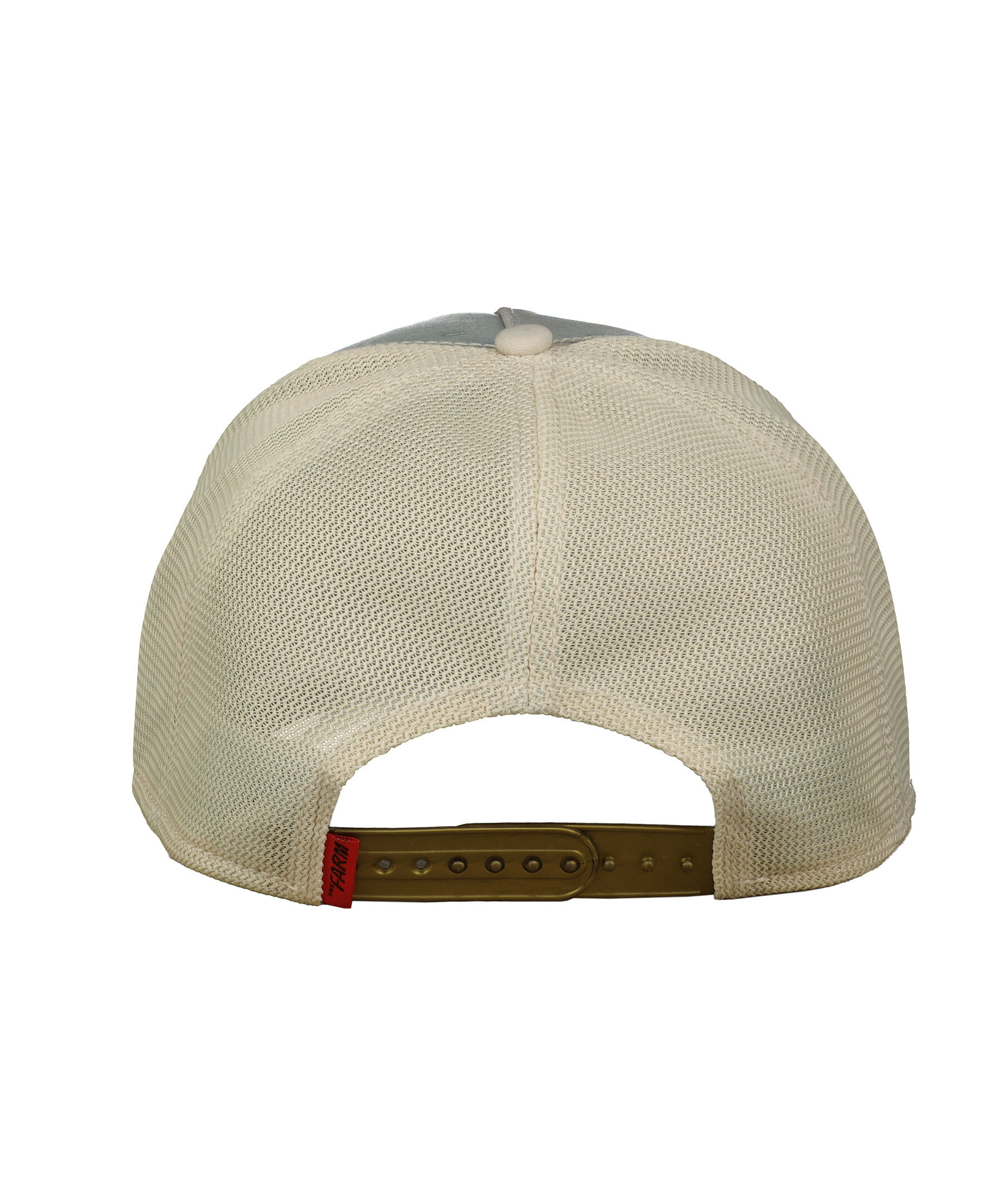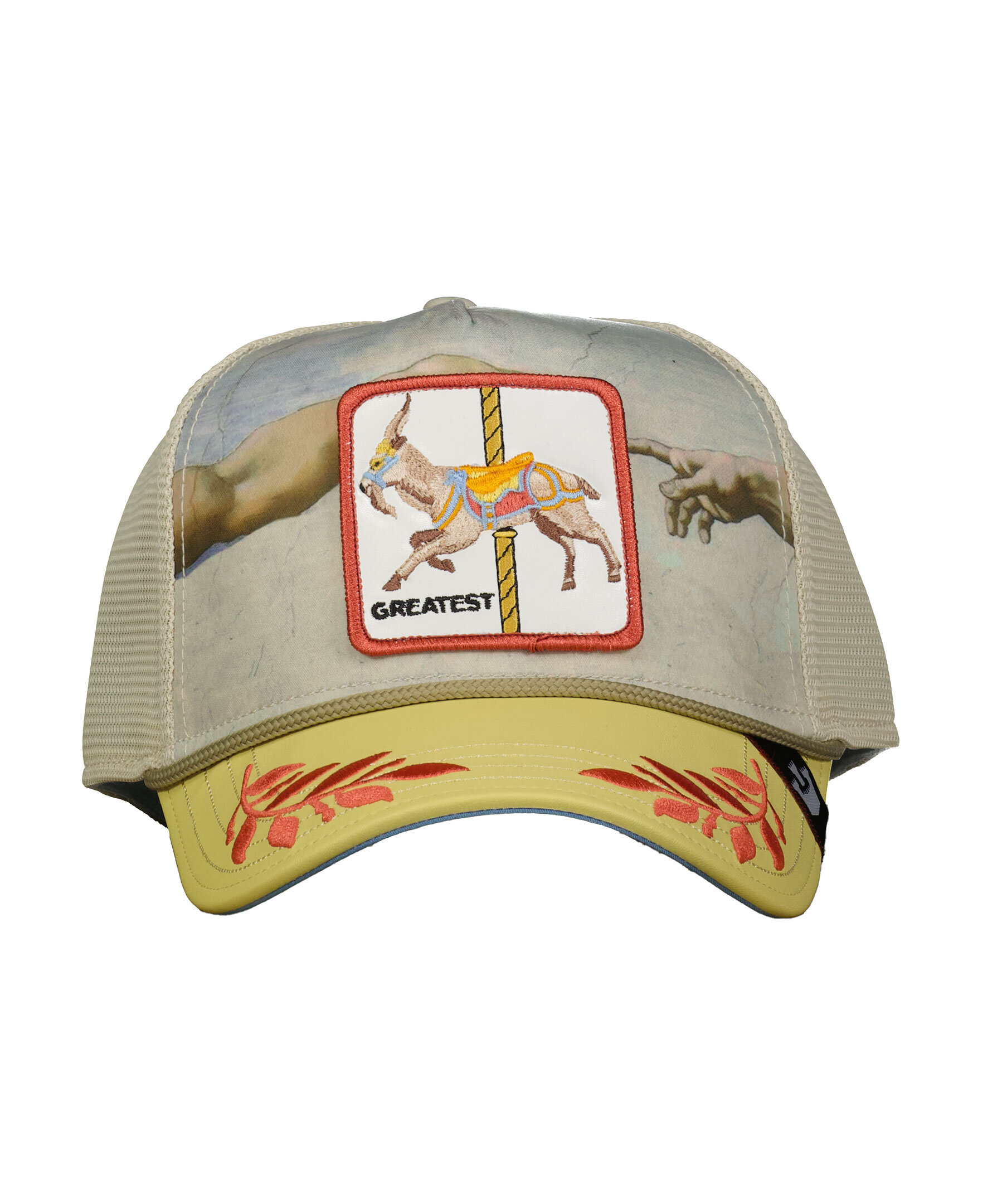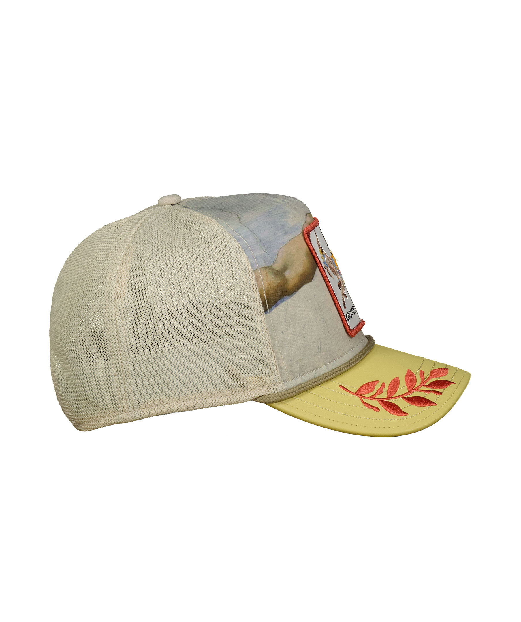 Gulbeige keps med meshtyg i trucker-basebollmodell från Goorin Bros. Fyrkantig patch med en get och text "Greatest". Broderade orangea löv på skärmen. Onesize storlek med ett justerbart 4-snap-in-rem. Tryck från Michelangelos skapelse "Adams skapelse" framtill. Ljusblått tyg undertill.