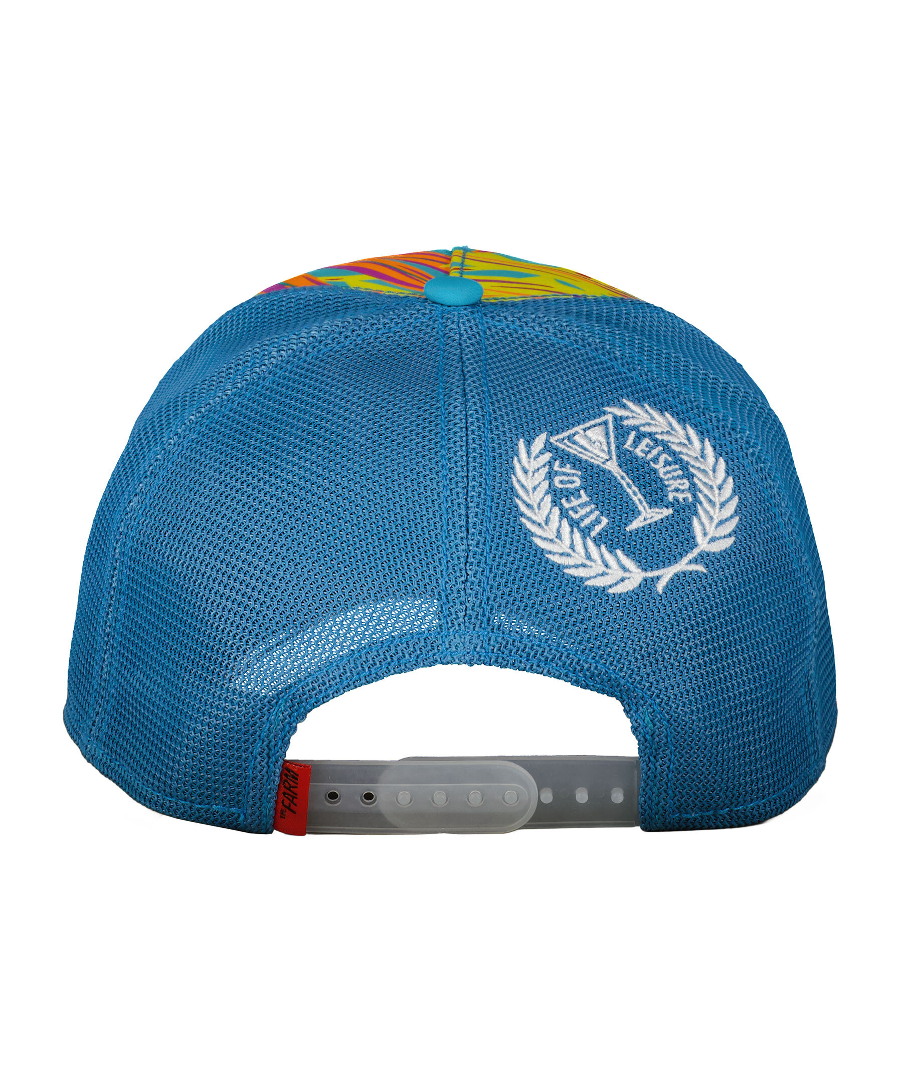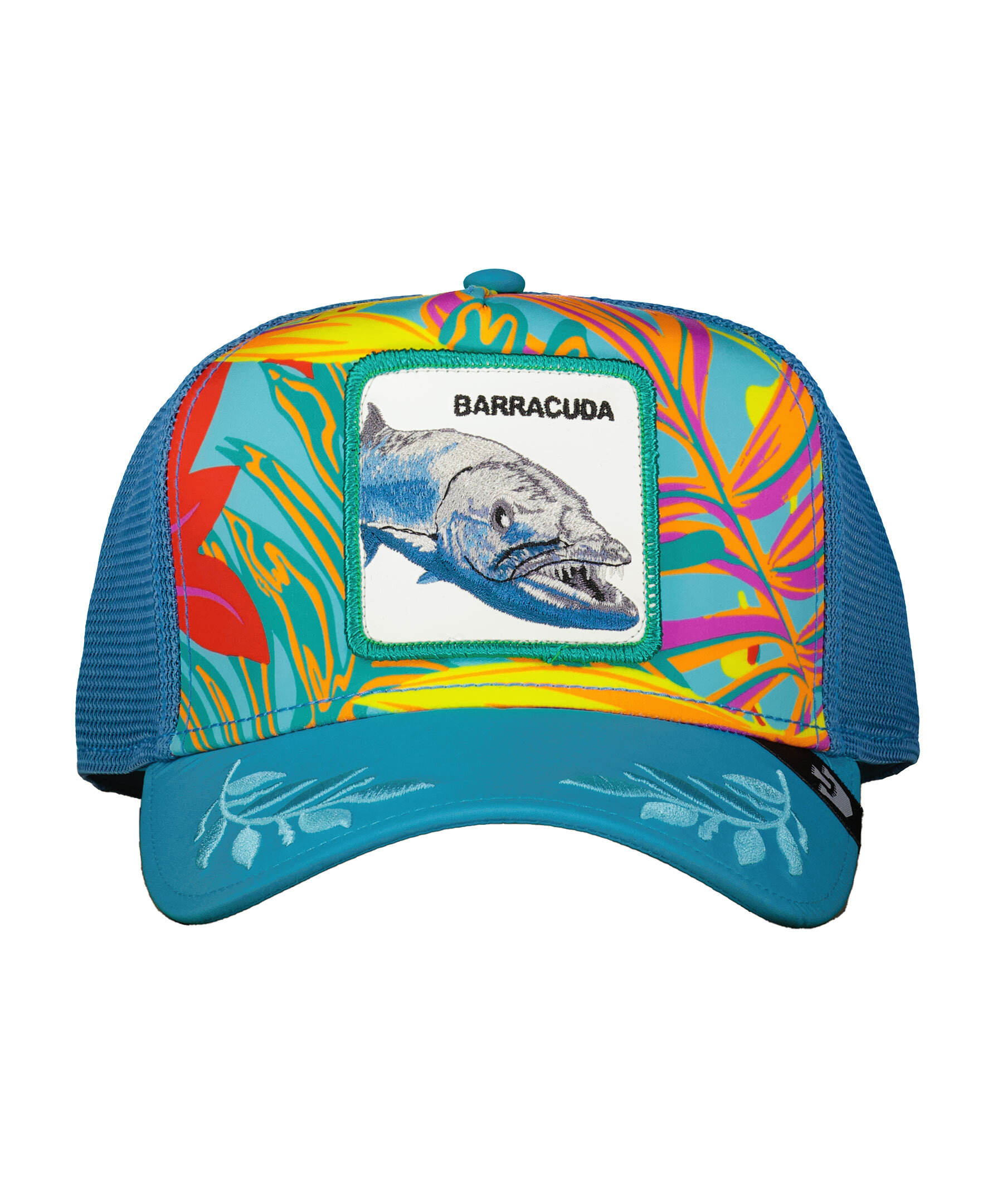Blå mönstrad keps med meshtyg i trucker-basebollmodell från Goorin Bros. Fyrkantig patch med en barracuda fisk framtill. Broderade löv på skärmen. Onesize storlek med ett justerbart 4-snap-in-rem, vilket betyder att storleksintervallet är 55 cm-61 cm med 58 cm i mitten. Tillverkad i 100% polyester.