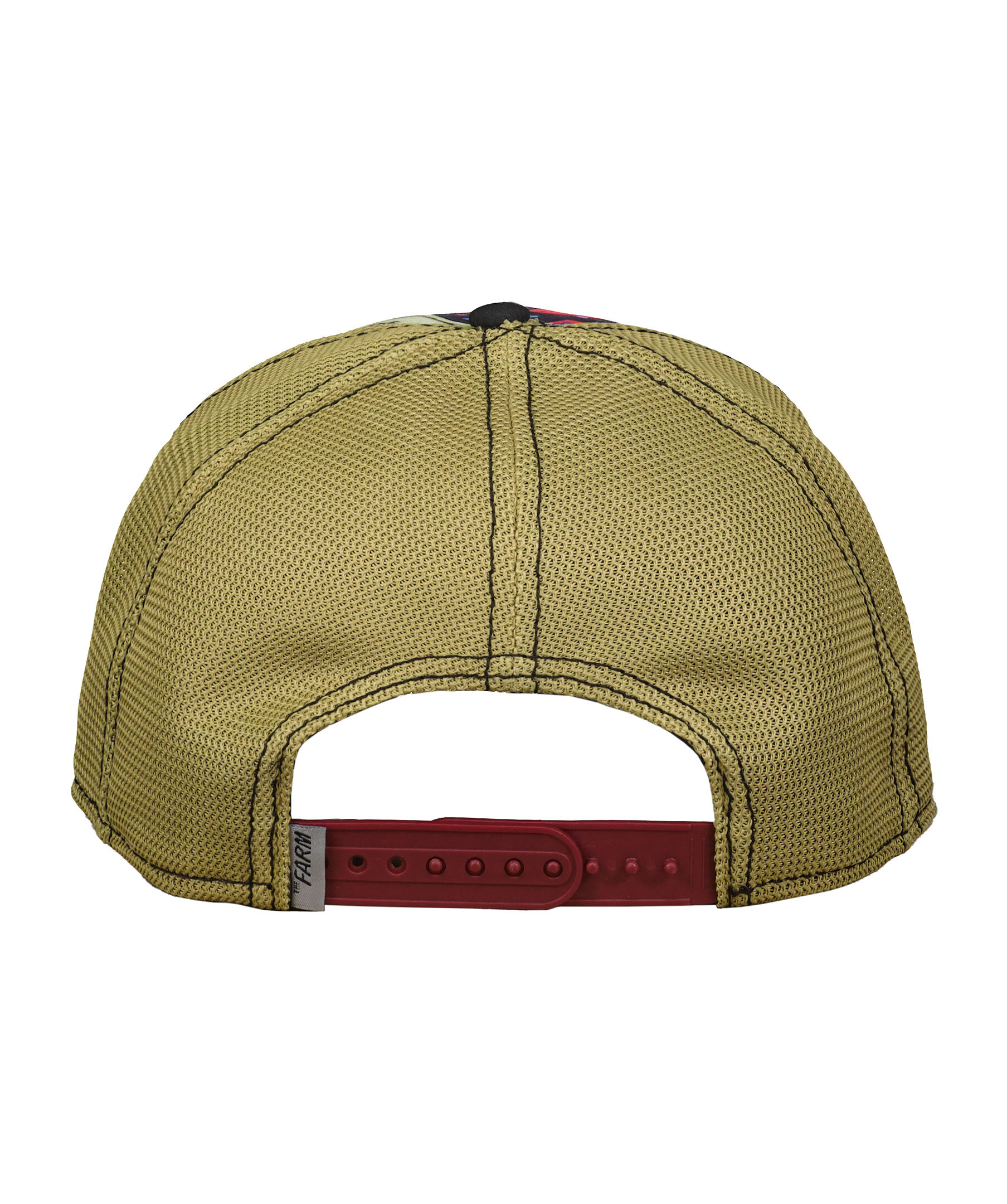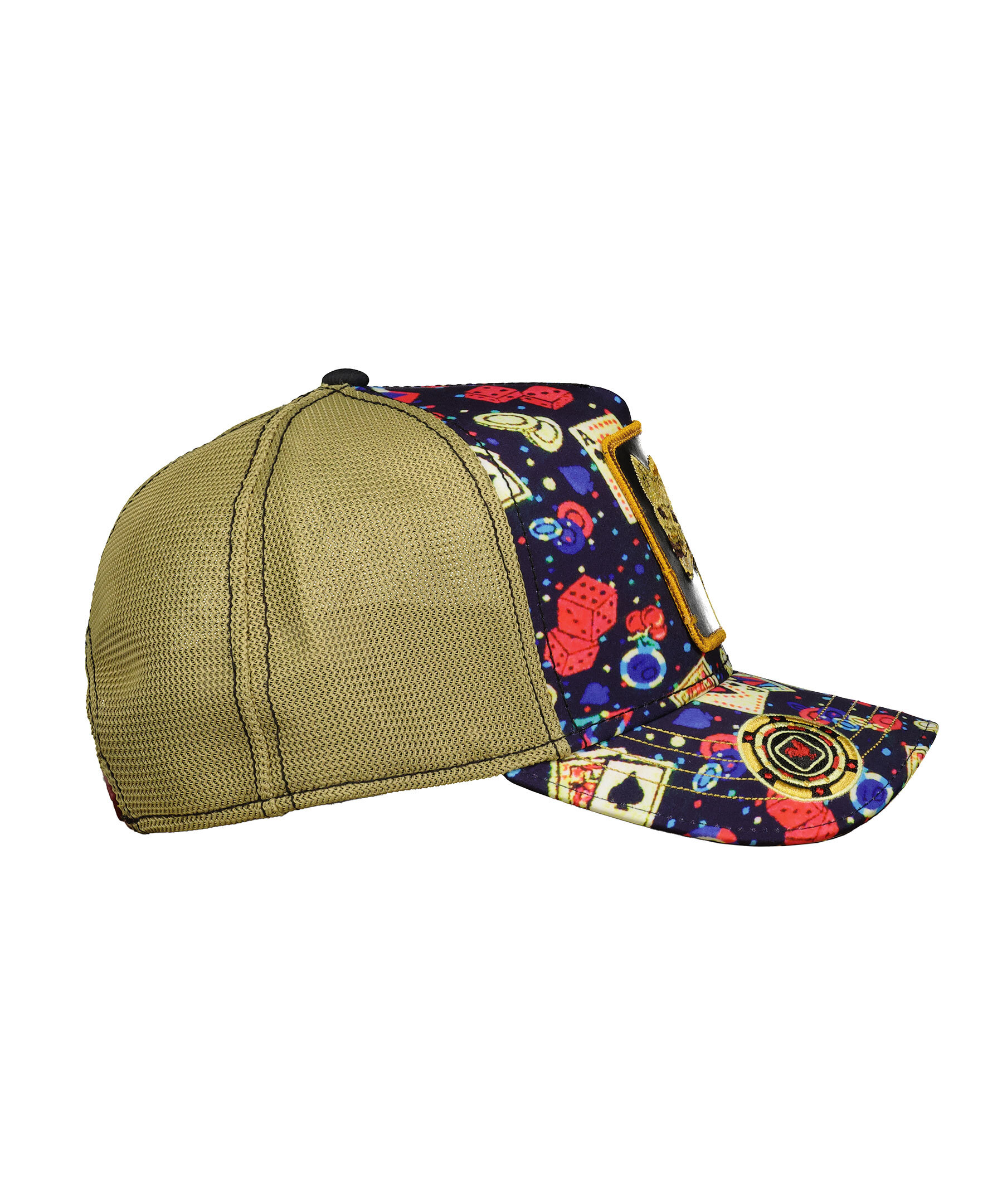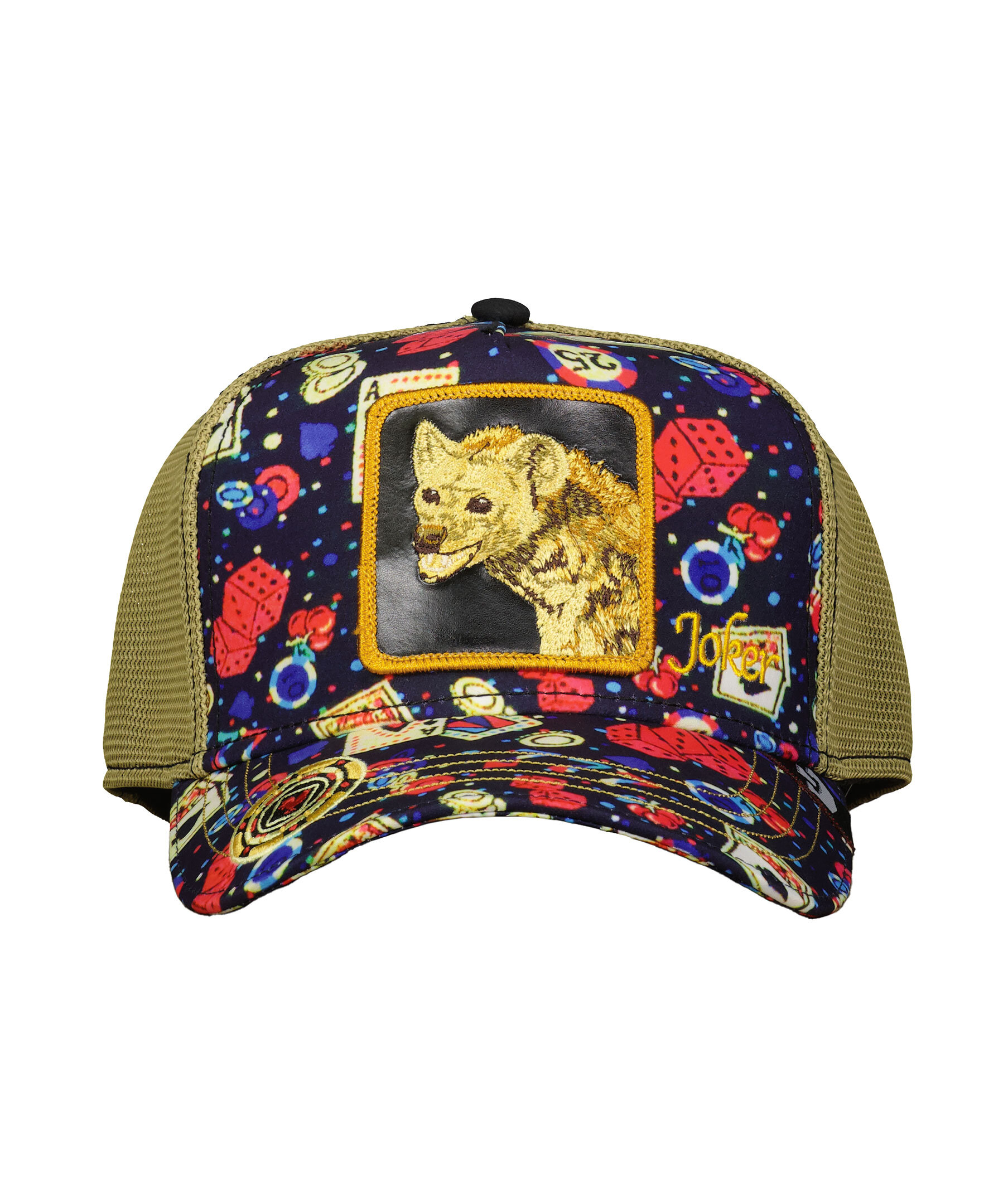 Grön keps med meshctyg i trucker-basebollmodell från Goorin Bros. Fyrkantig patch med en hyena. Tryck i mörk blått med spelmotiv i olika färger framtill. Broderat märke på skärm. Broderad text "Joker" framtill. Onesize modell med ett justerbart 4-snap-in-rem.