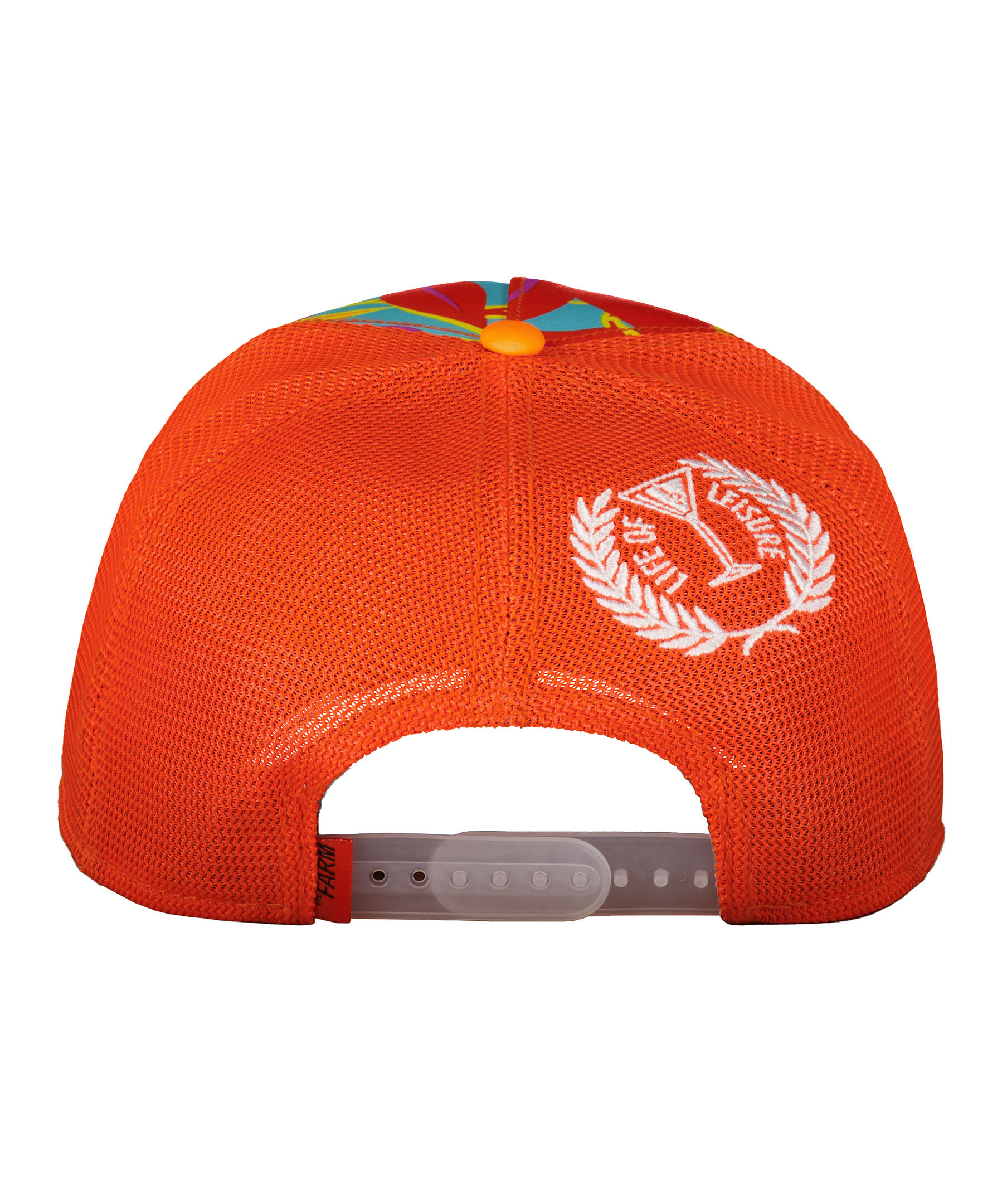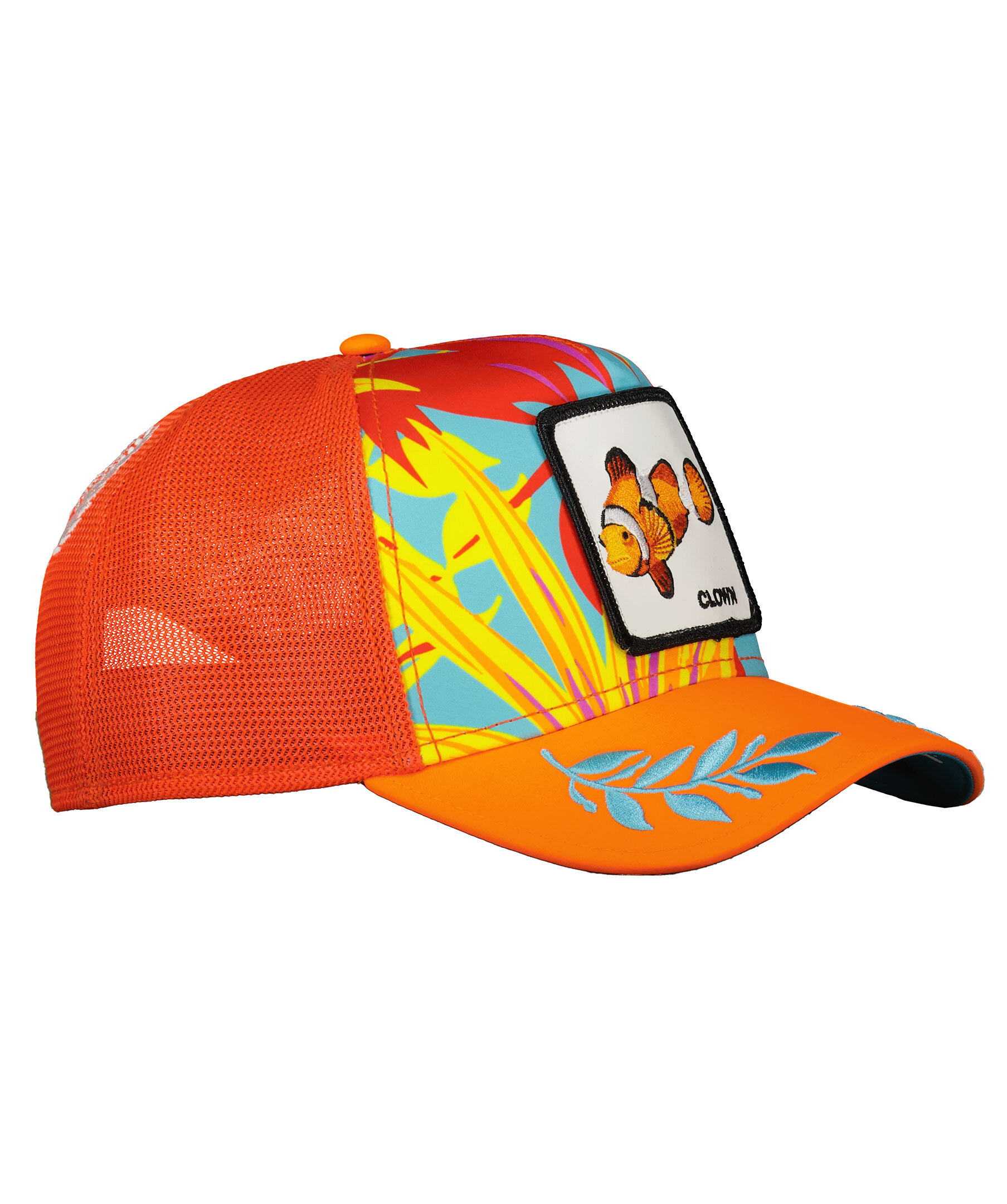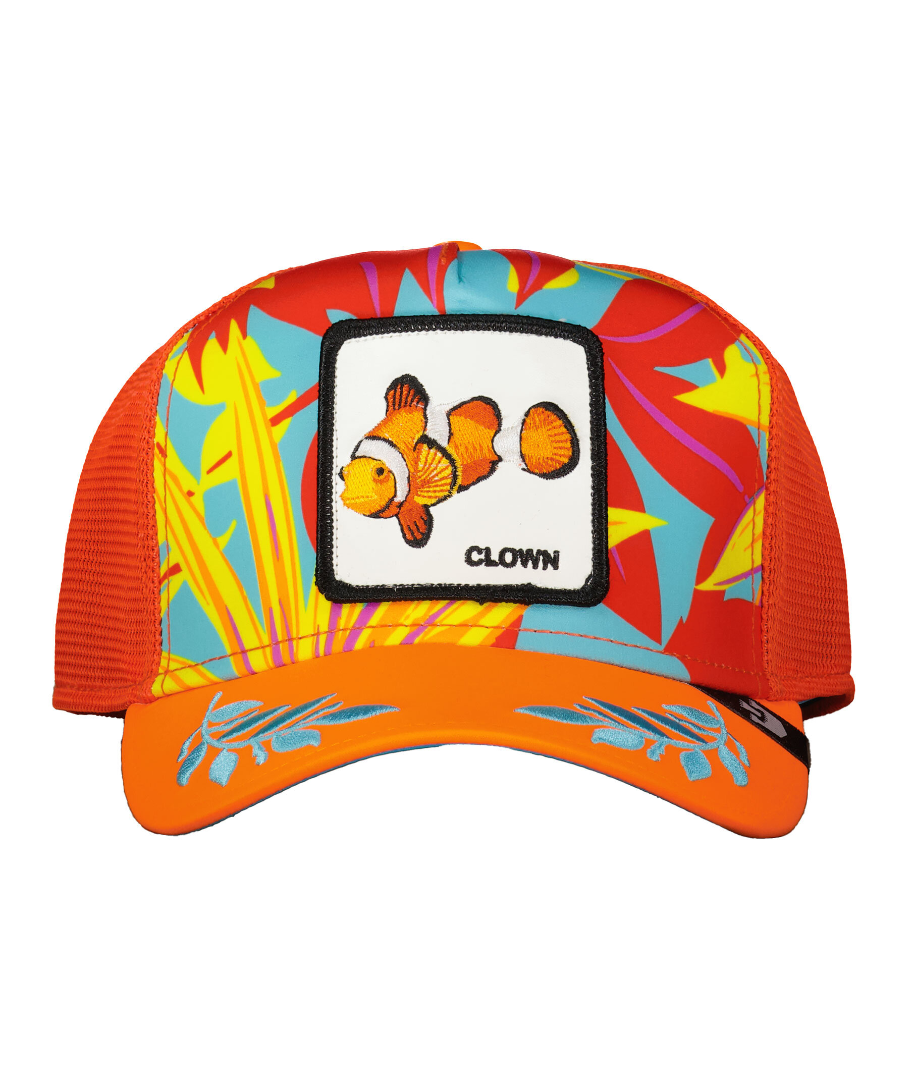 Rödorange mönstrad keps med meshtyg i trucker-basebollmodell från Goorin Bros. Fyrkantig patch med en clownfisk framtill. Broderade löv på skärmen. Onesize storlek med ett justerbart 4-snap-in-rem, vilket betyder att storleksintervallet är 55 cm-61 cm med 58 cm i mitten. Tillverkad i 100% polyester.