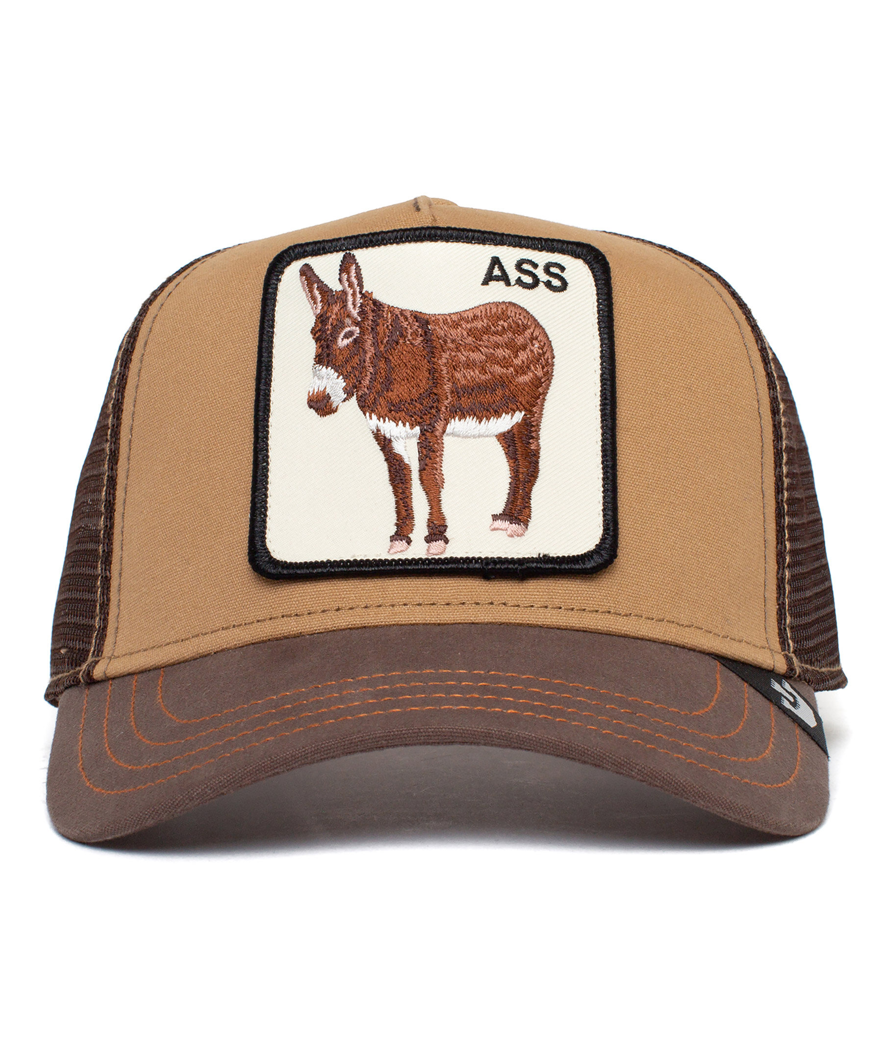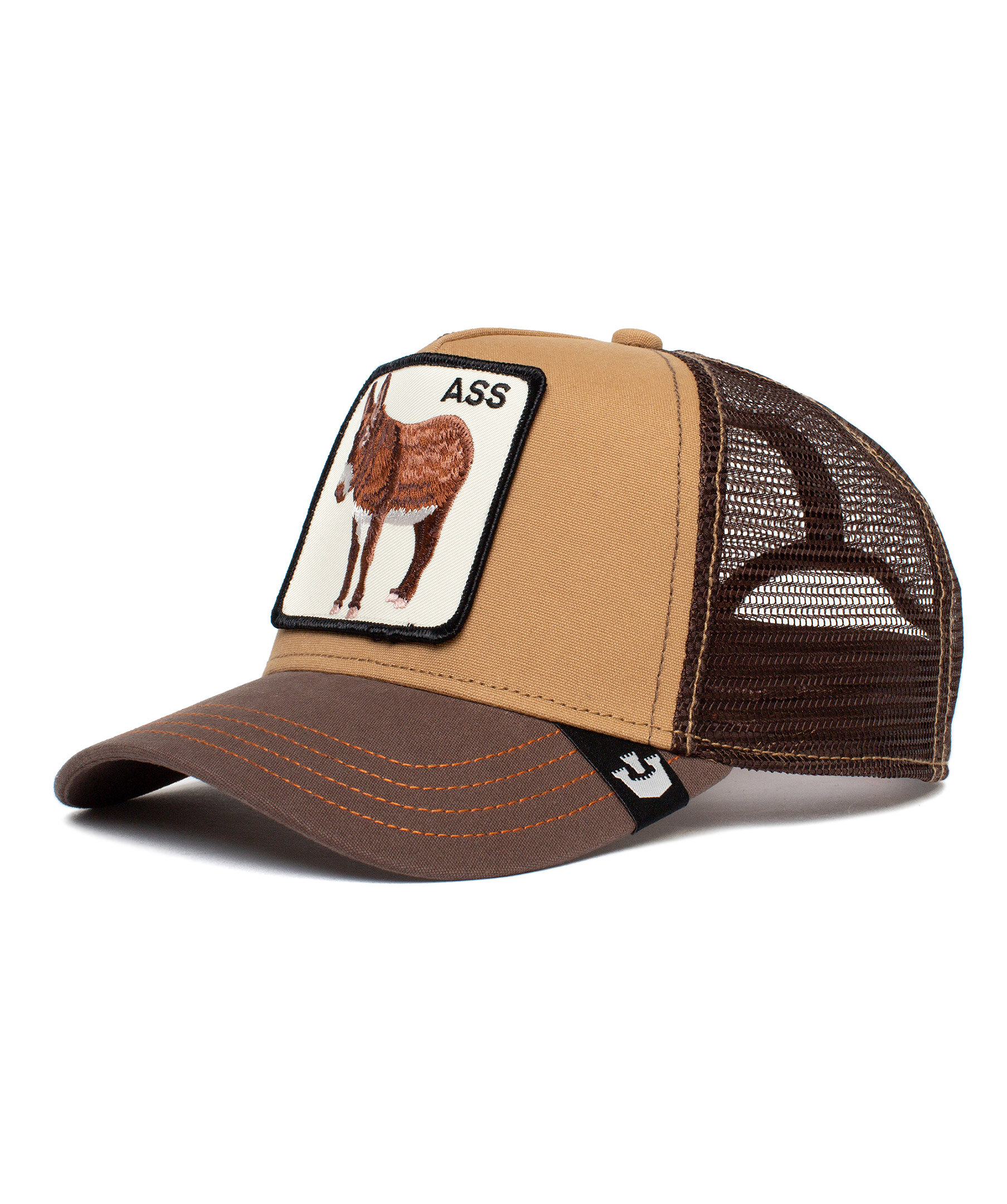 Brun keps i trucker-basebollmodell med fyrkantig patch med en Åsna framtill från Goorin Bros. Onesize storlek med ett justerbart 4-snap-in-rem, vilket betyder att storleksintervallet är 55 cm-61 cm med 58 cm i mitten. Ett bomullssvettband finns fastsytt på insidan. Tillverkad i en polyesterblandning.