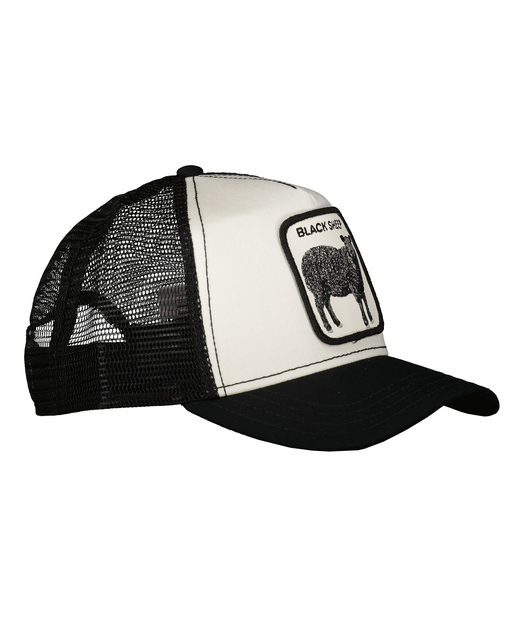 Vit keps med svart skärm och meshtyg i trucker-basebollmodell från Goorin Bros. Fyrkantig patch med ett får framtill. Onesize storlek med ett justerbart 4-snap-in-rem, vilket betyder att storleksintervallet är 55 cm-61 cm med 58 cm i mitten. Ett bomullssvettband finns fastsytt på insidan. Tillverkad i en polyesterblandning.