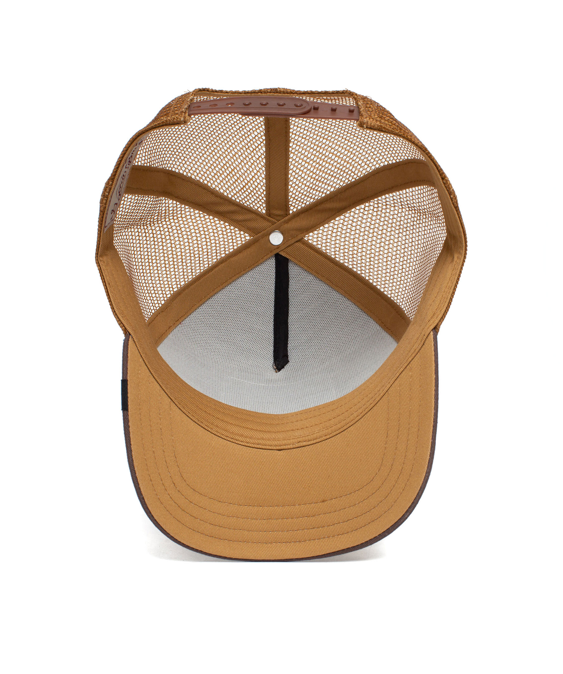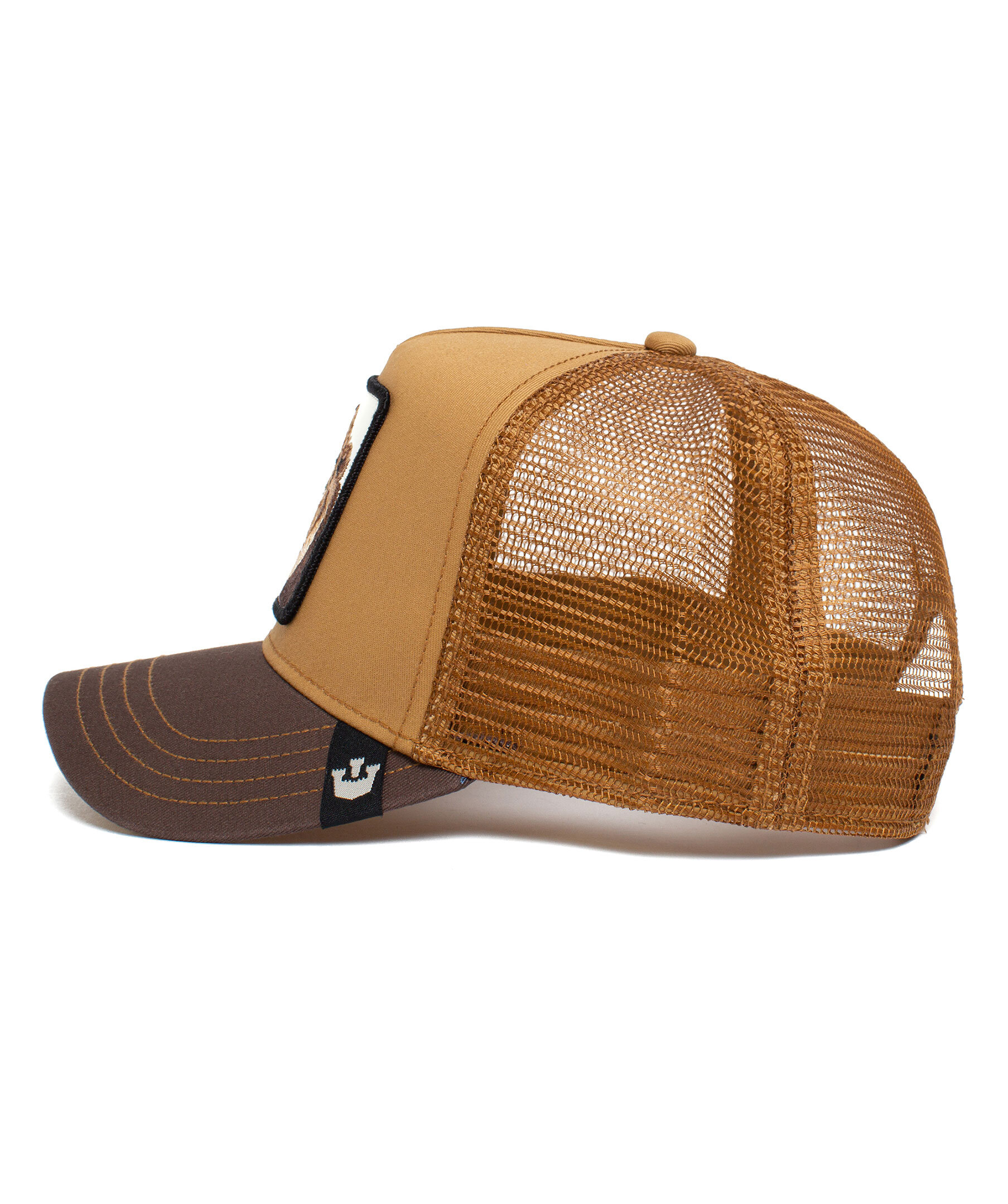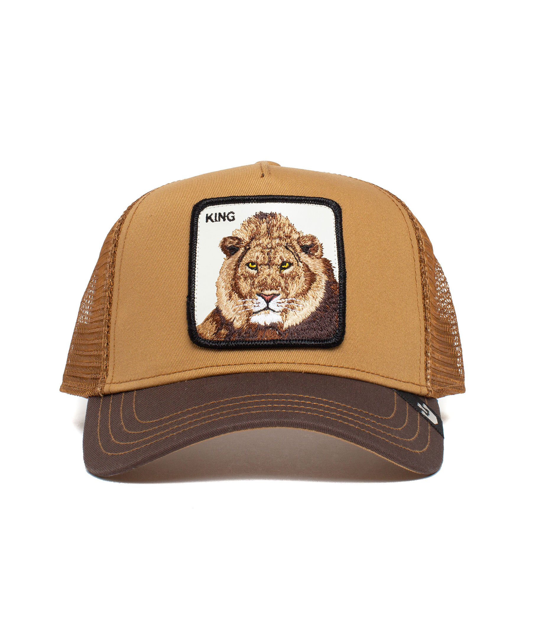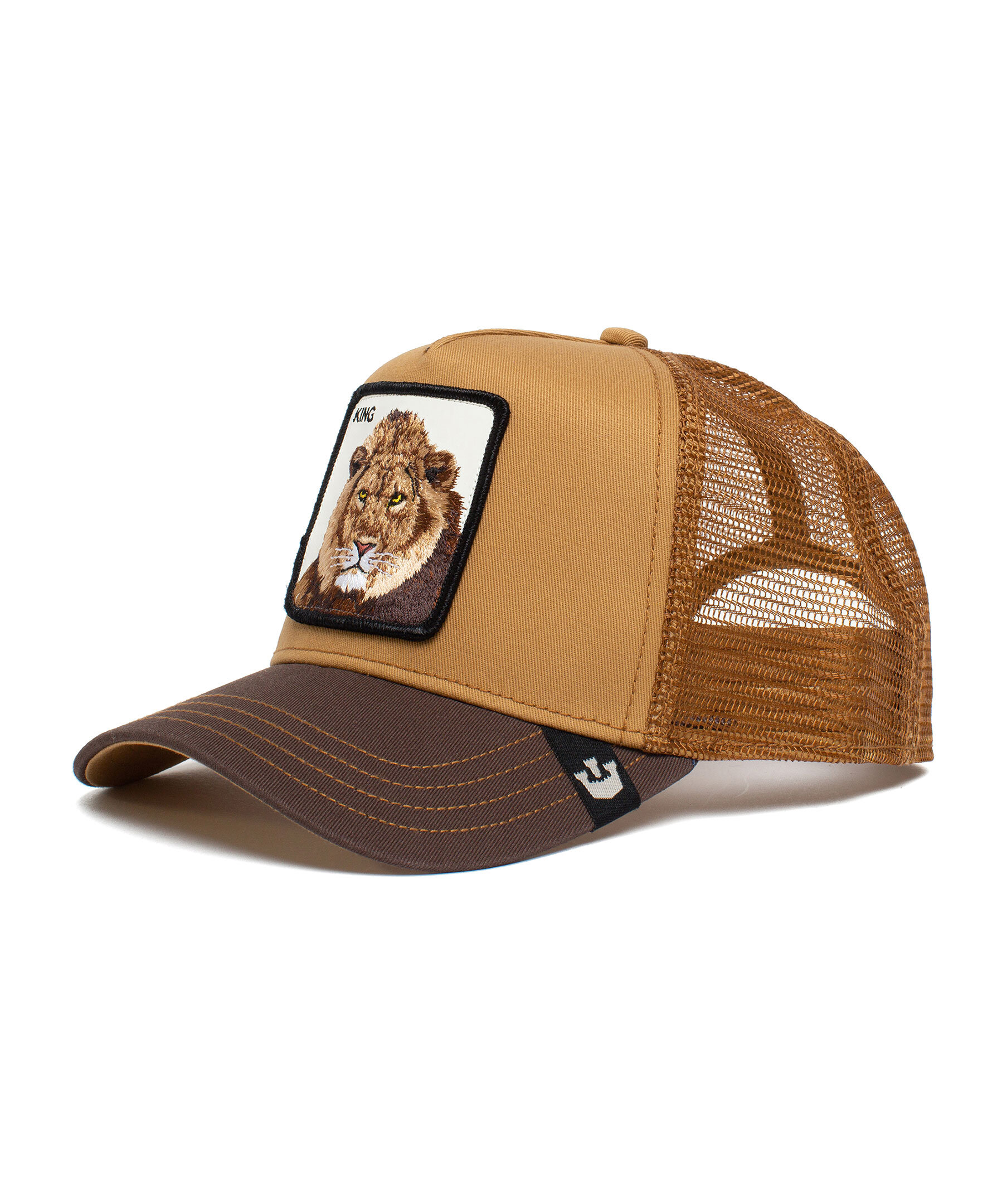 Beige och brun keps i trucker-basebollmodell med fyrkantig patch med ett lejon framtill från Goorin Bros. Onesize storlek med ett justerbart 4-snap-in-rem, vilket betyder att storleksintervallet är 55 cm-61 cm med 58 cm i mitten. Ett bomullssvettband finns fastsytt på insidan. Tillverkad i polyester bak och polyuretan på framsidan.