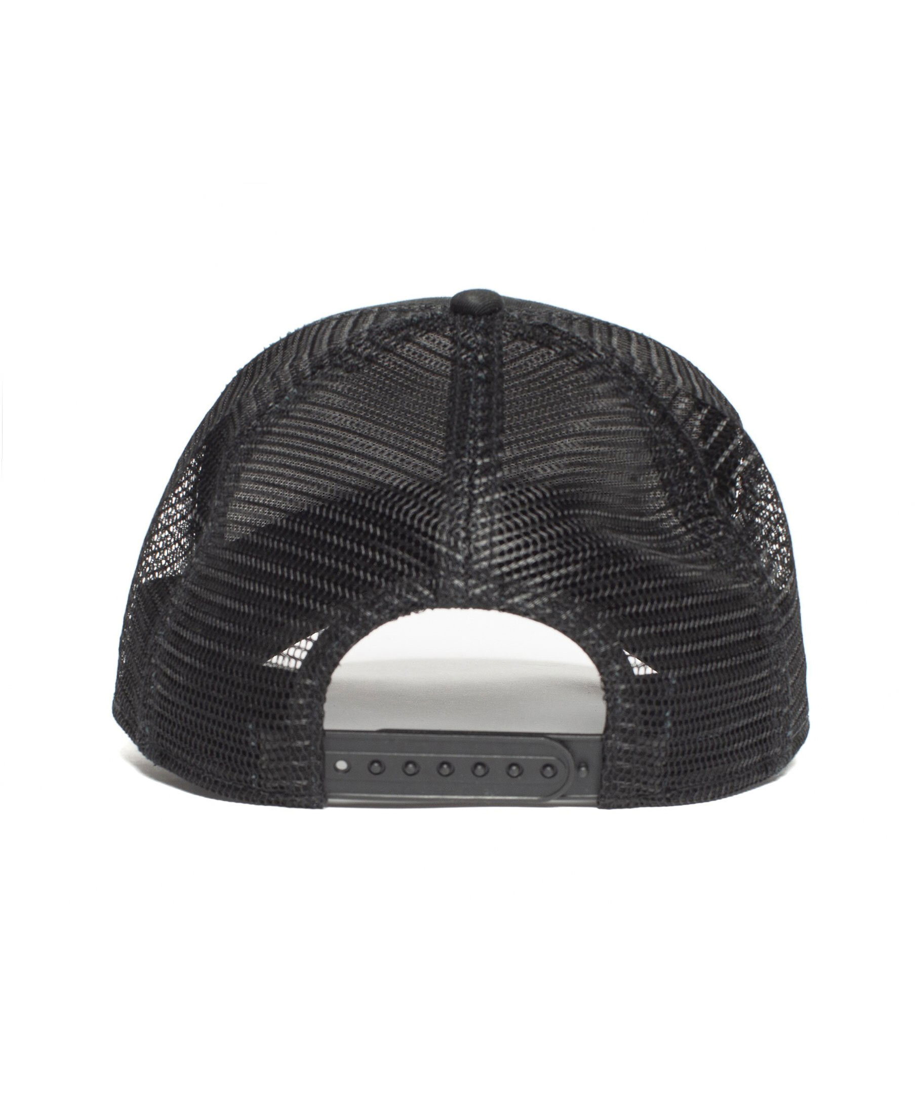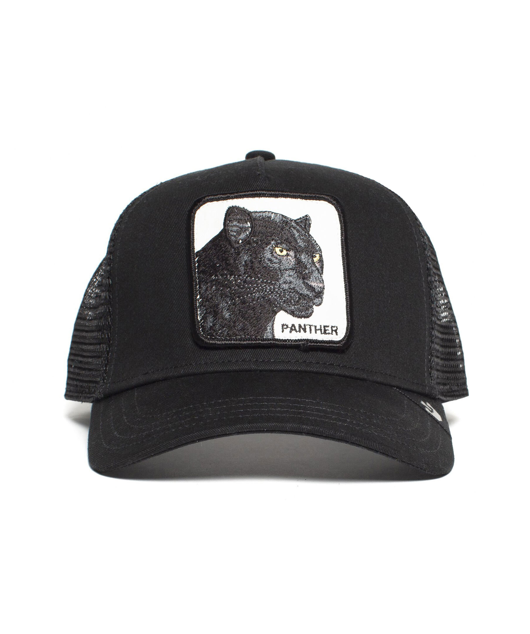 Svart keps i trucker-basebollmodell med fyrkantig patch med en Panter framtill från Goorin Bros. Onesize storlek med ett justerbart 4-snap-in-rem, vilket betyder att storleksintervallet är 55 cm-61 cm med 58 cm i mitten. Ett bomullssvettband finns fastsytt på insidan. Tillverkad i polyester bak och polyuretan på framsidan.