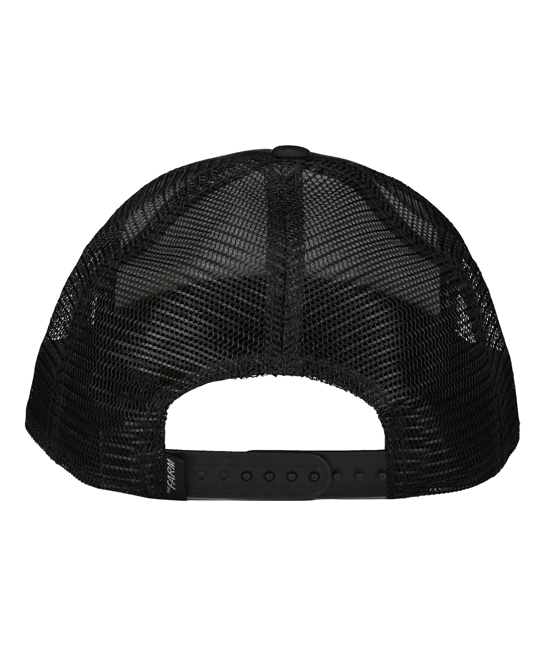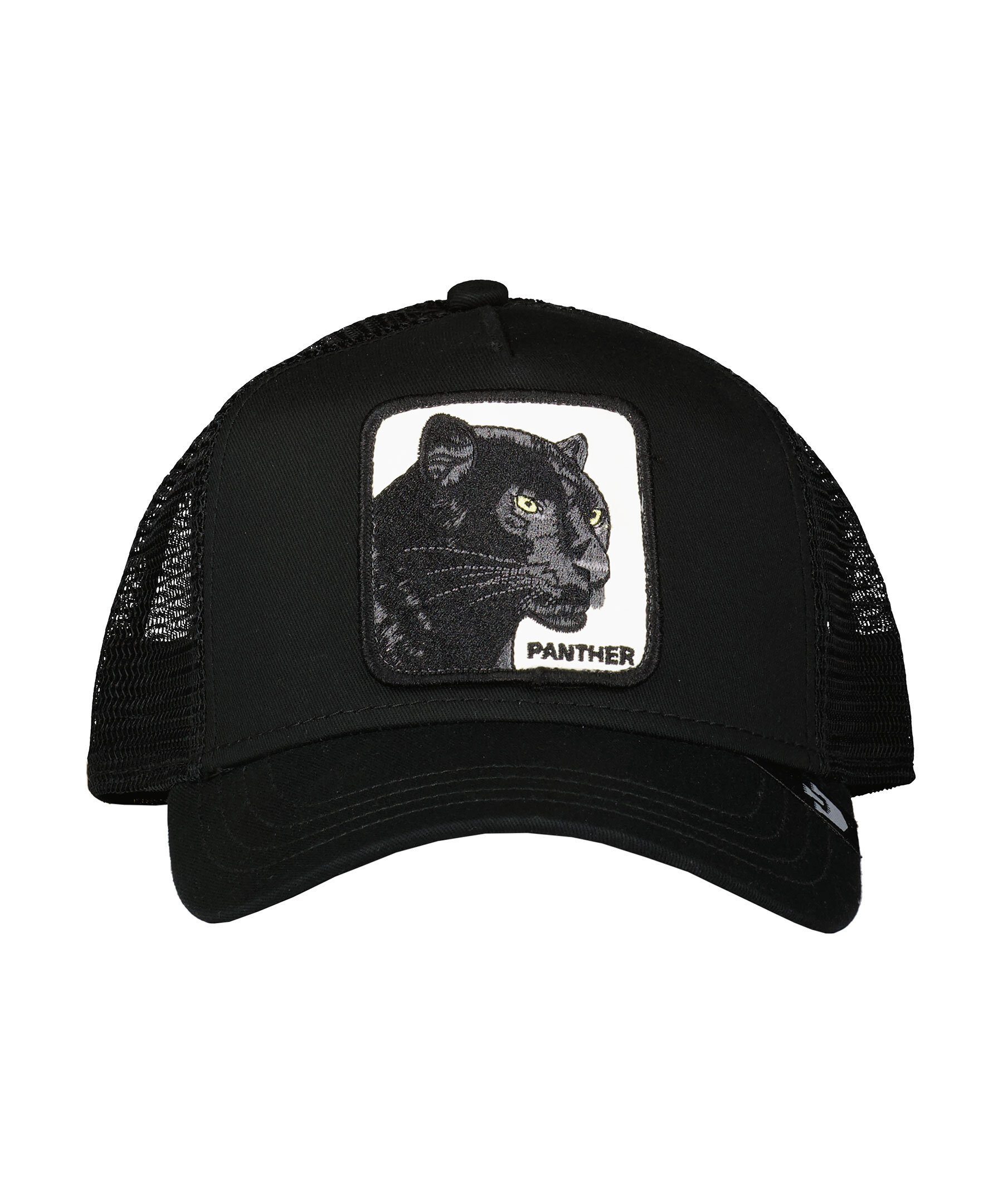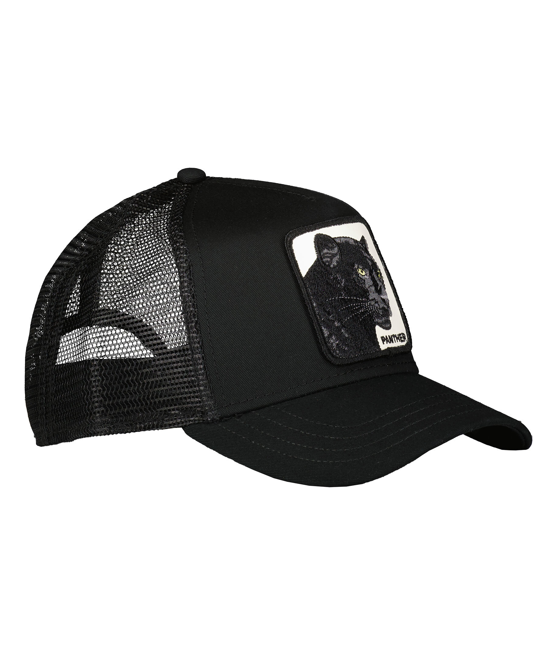 Svart keps med meshtyg i trucker-basebollmodell från Goorin Bros. Fyrkantig patch med en panter framtill. Onesize storlek med ett justerbart 4-snap-in-rem, vilket betyder att storleksintervallet är 55 cm-61 cm med 58 cm i mitten. Ett bomullssvettband finns fastsytt på insidan. Tillverkad i en polyesterblandning.