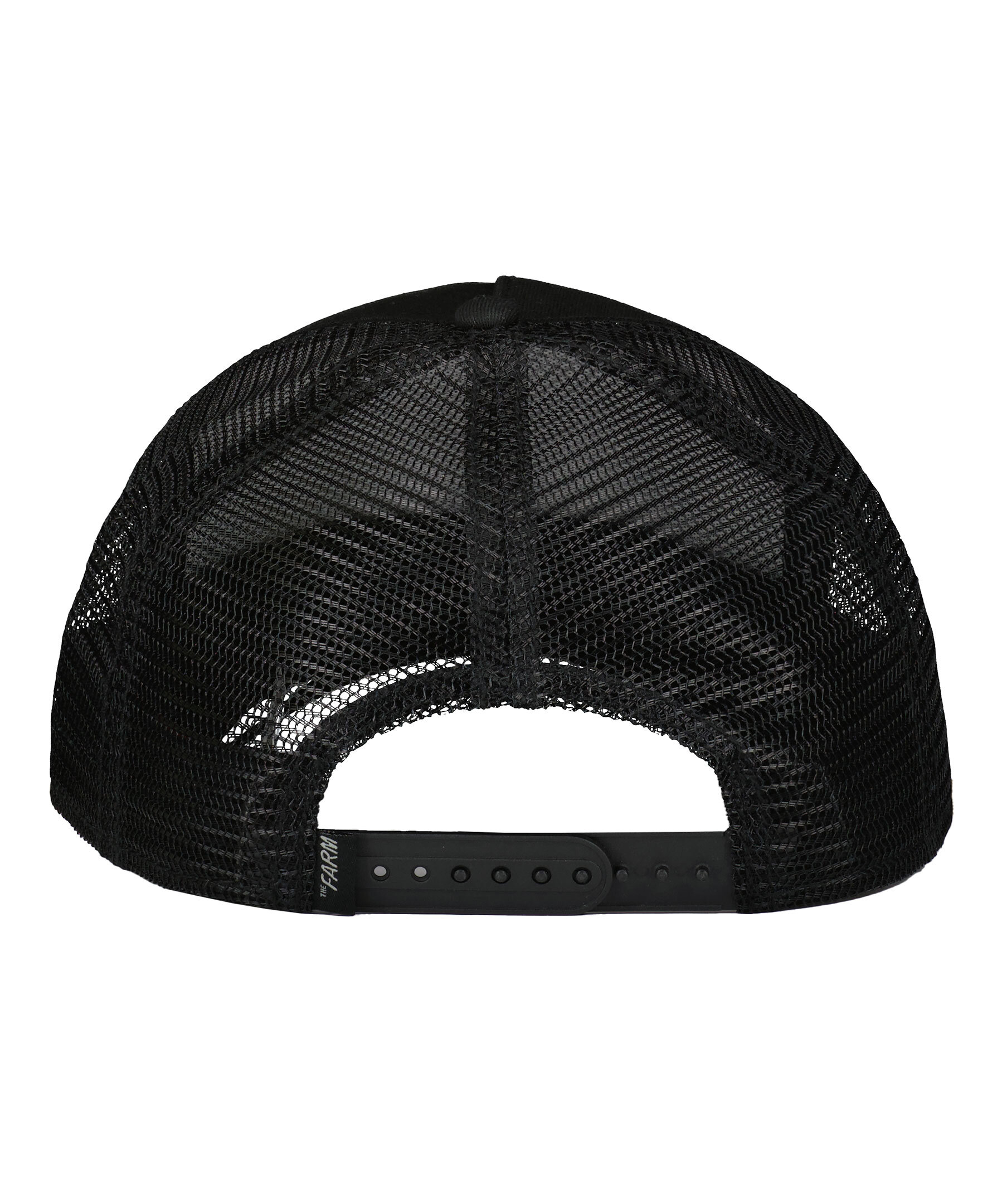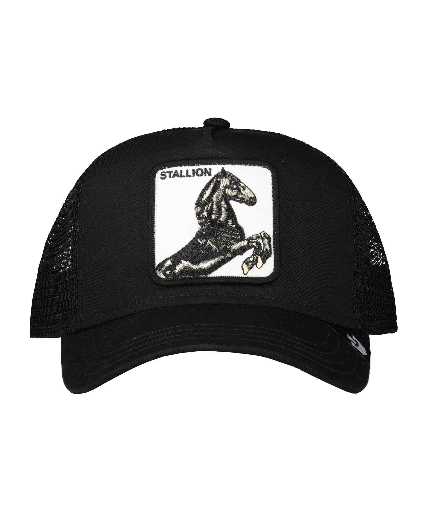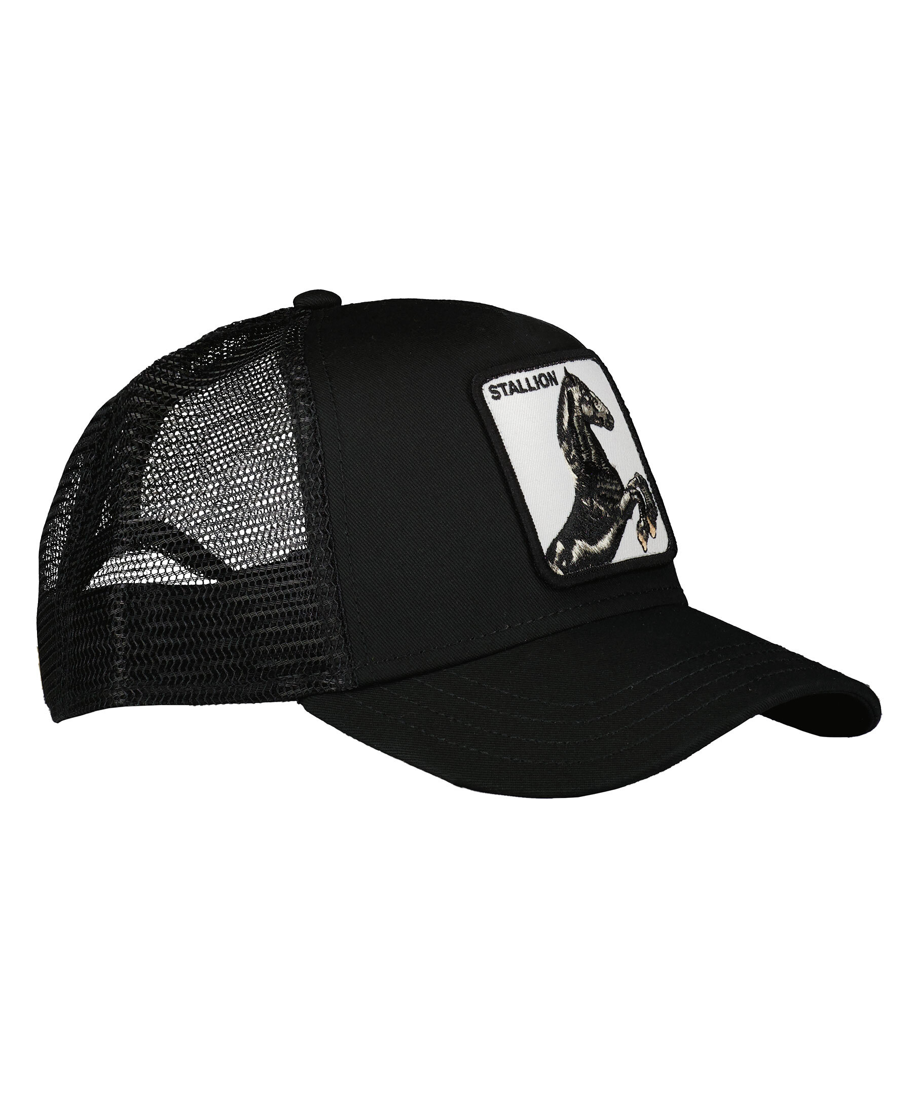 Svart keps i trucker-basebollmodell med fyrkantig patch med ett hästmotiv framtill från Goorin Bros. Onesize storlek med ett justerbart 4-snap-in-rem, vilket betyder att storleksintervallet är 55 cm-61 cm med 58 cm i mitten. Ett bomullssvettband finns fastsytt på insidan. Tillverkad i en polyesterblandning.