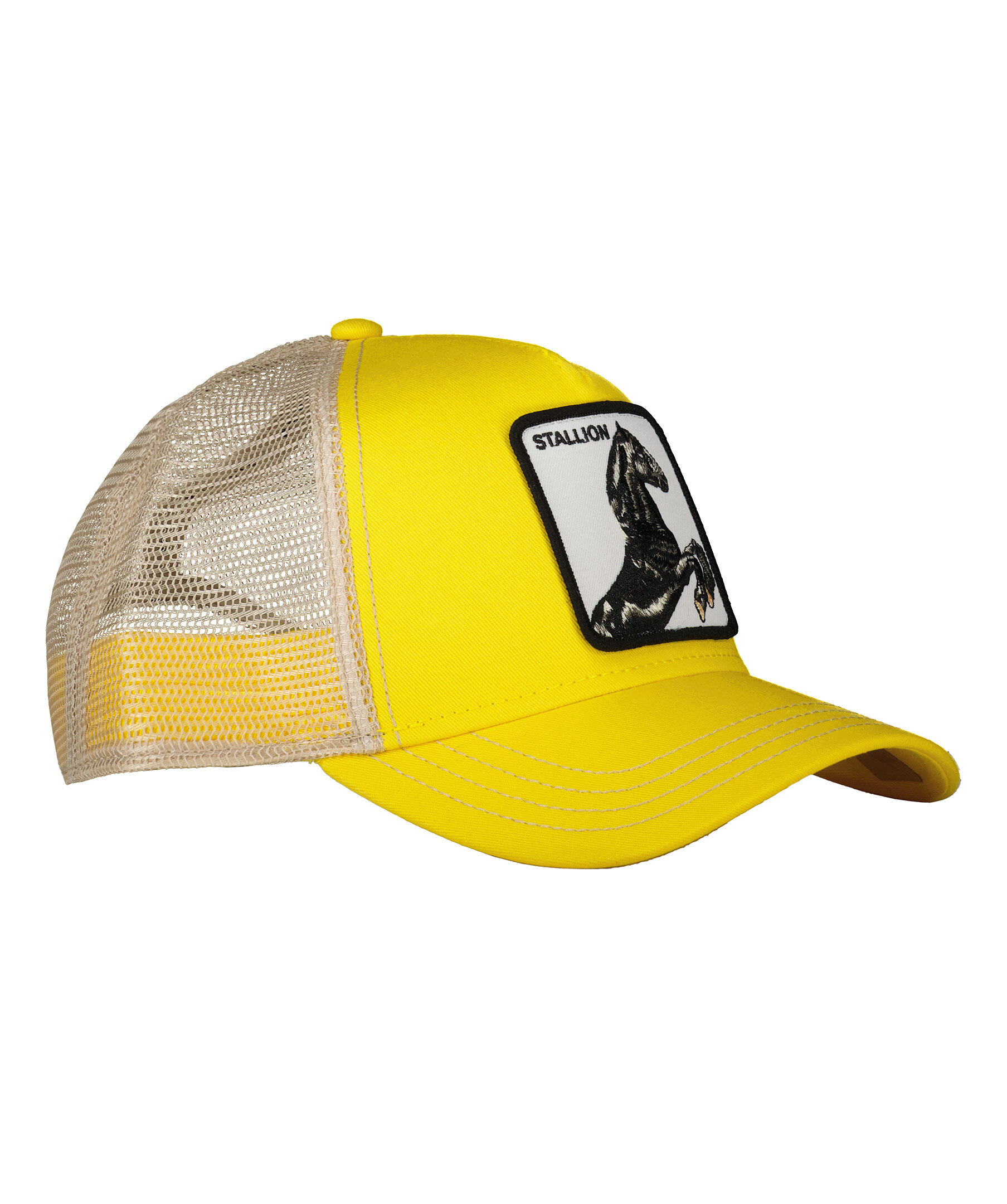Gul keps i trucker-basebollmodell med fyrkantig patch med ett hästmotiv framtill från Goorin Bros. Onesize storlek med ett justerbart 4-snap-in-rem, vilket betyder att storleksintervallet är 55 cm-61 cm med 58 cm i mitten. Ett bomullssvettband finns fastsytt på insidan. Tillverkad i en polyesterblandning.