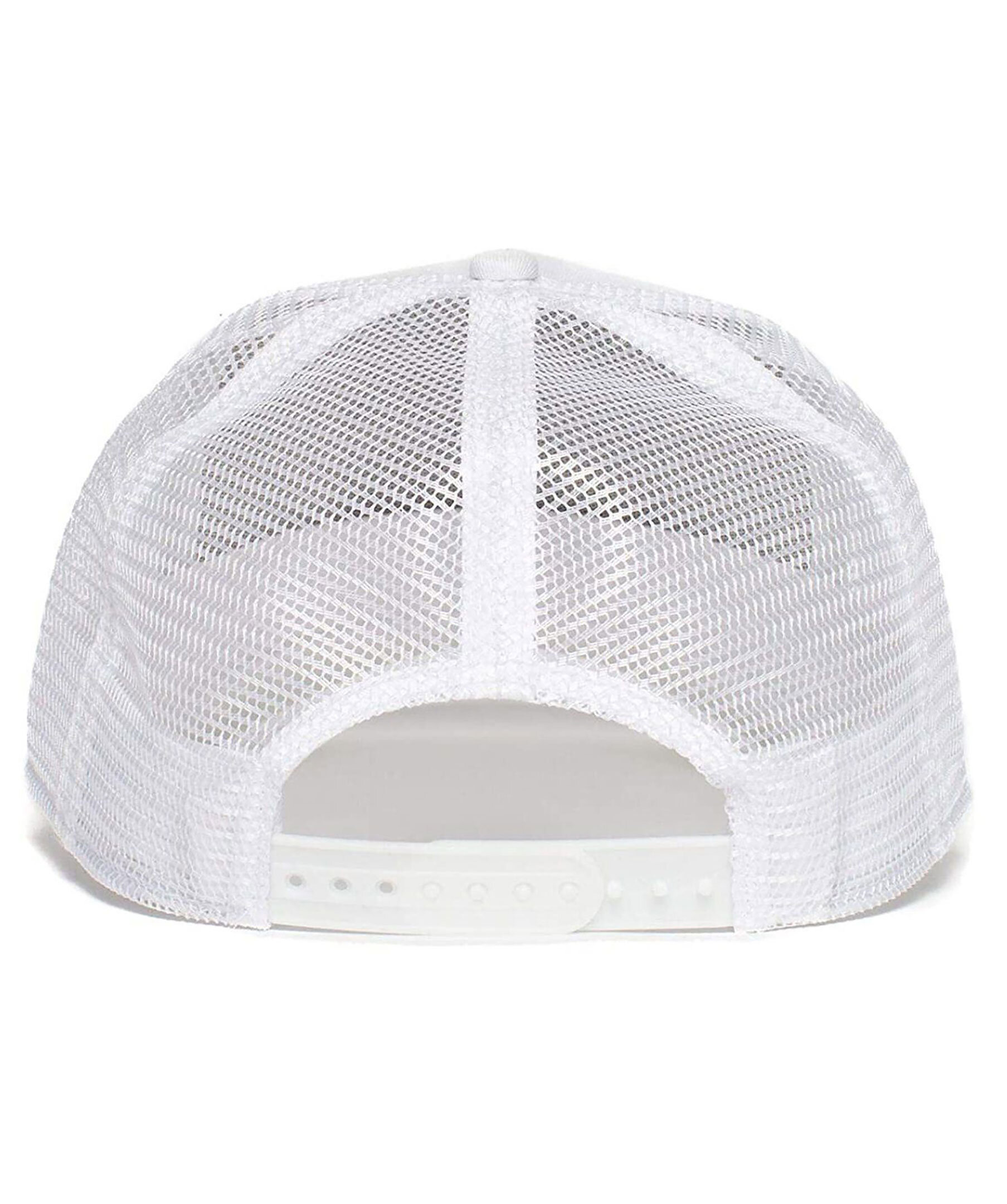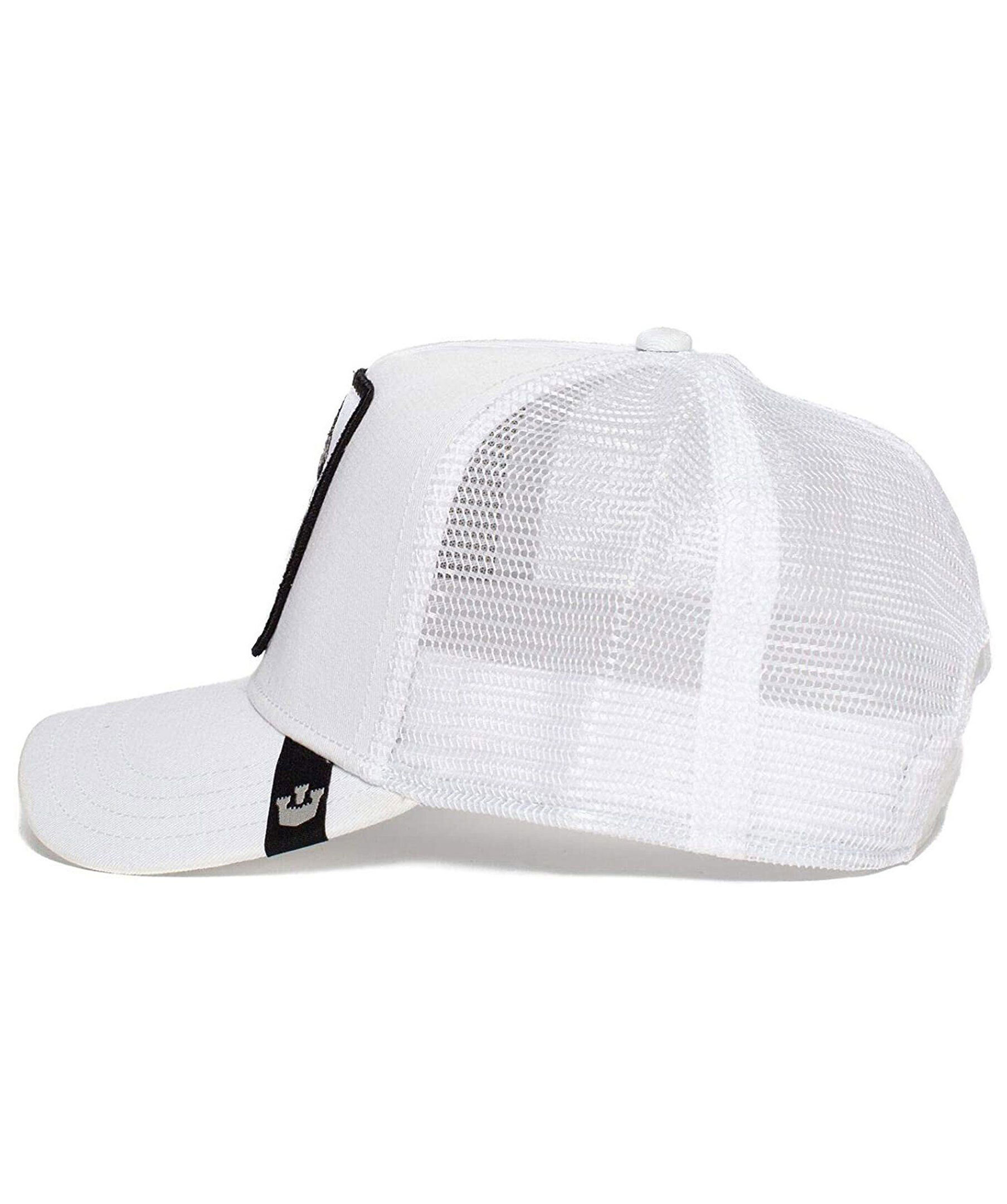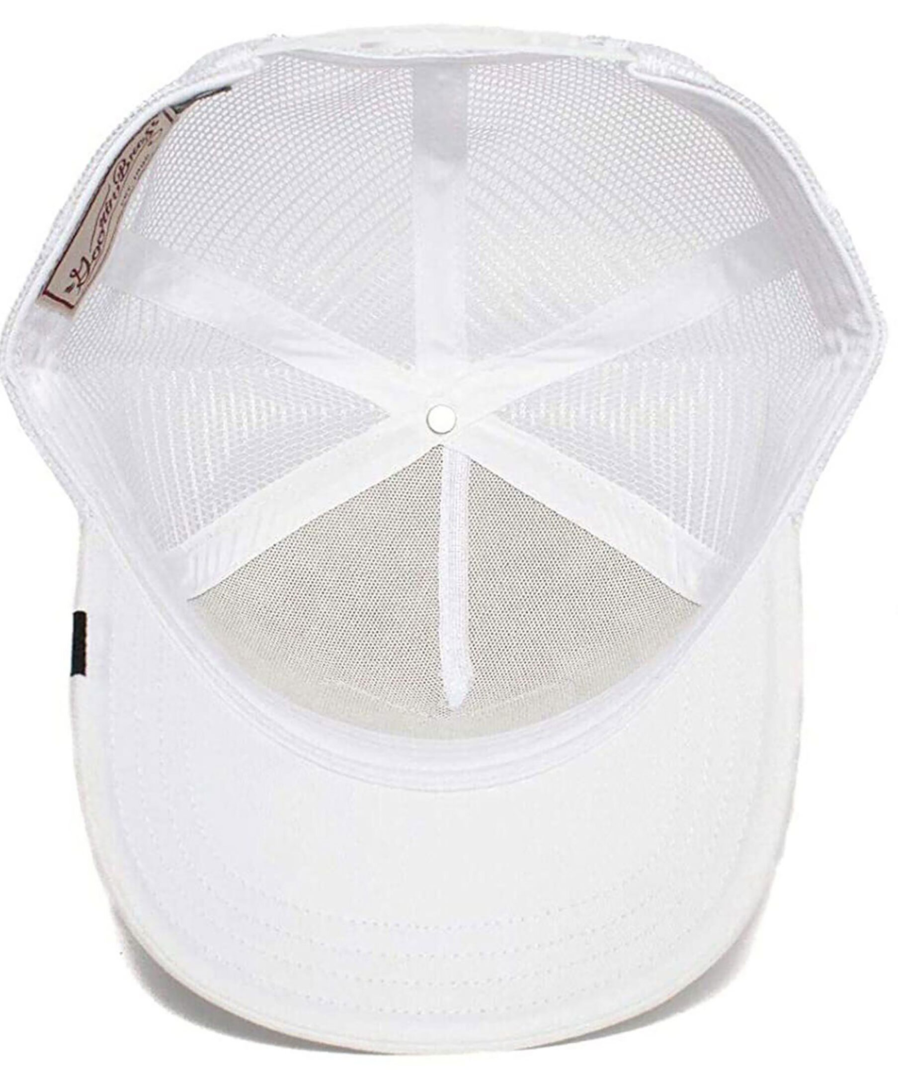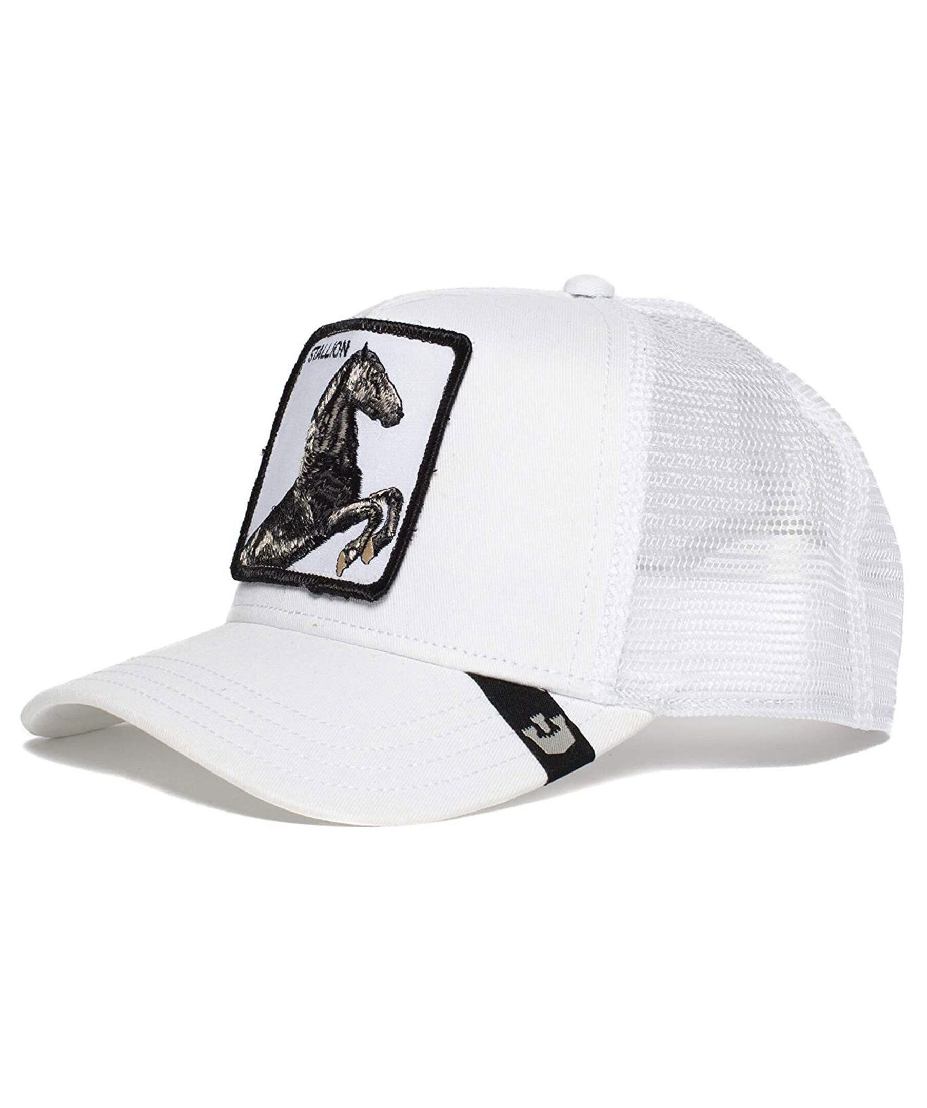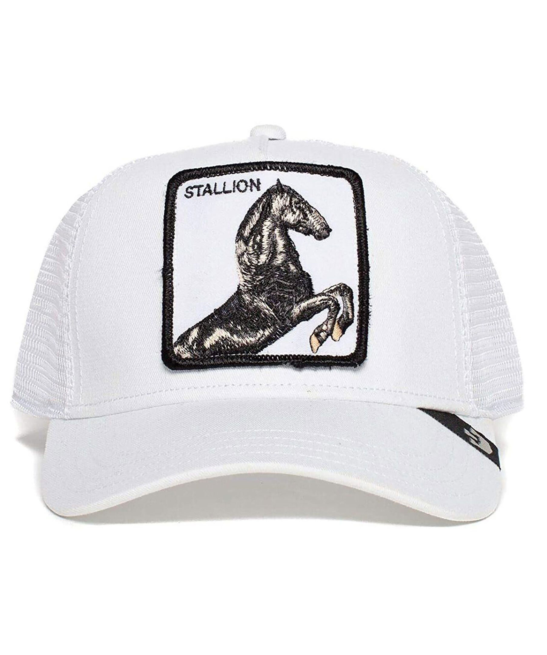 Vit keps i trucker-basebollmodell med fyrkantig patch med en Häst framtill från Goorin Bros. Onesize storlek med ett justerbart 4-snap-in-rem, vilket betyder att storleksintervallet är 55 cm-61 cm med 58 cm i mitten. Ett bomullssvettband finns fastsytt på insidan. Tillverkad i polyester bak och polyuretan på framsidan.