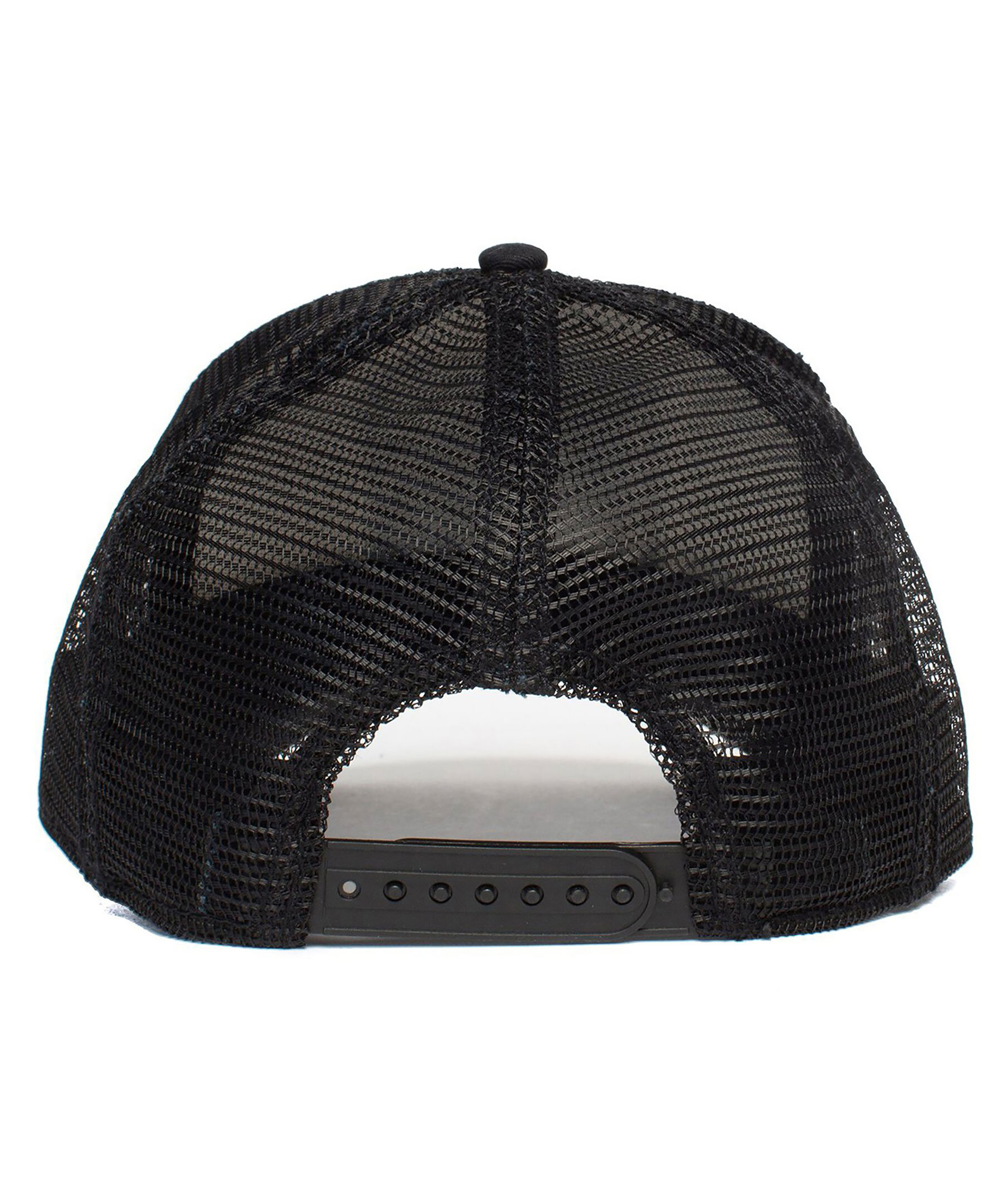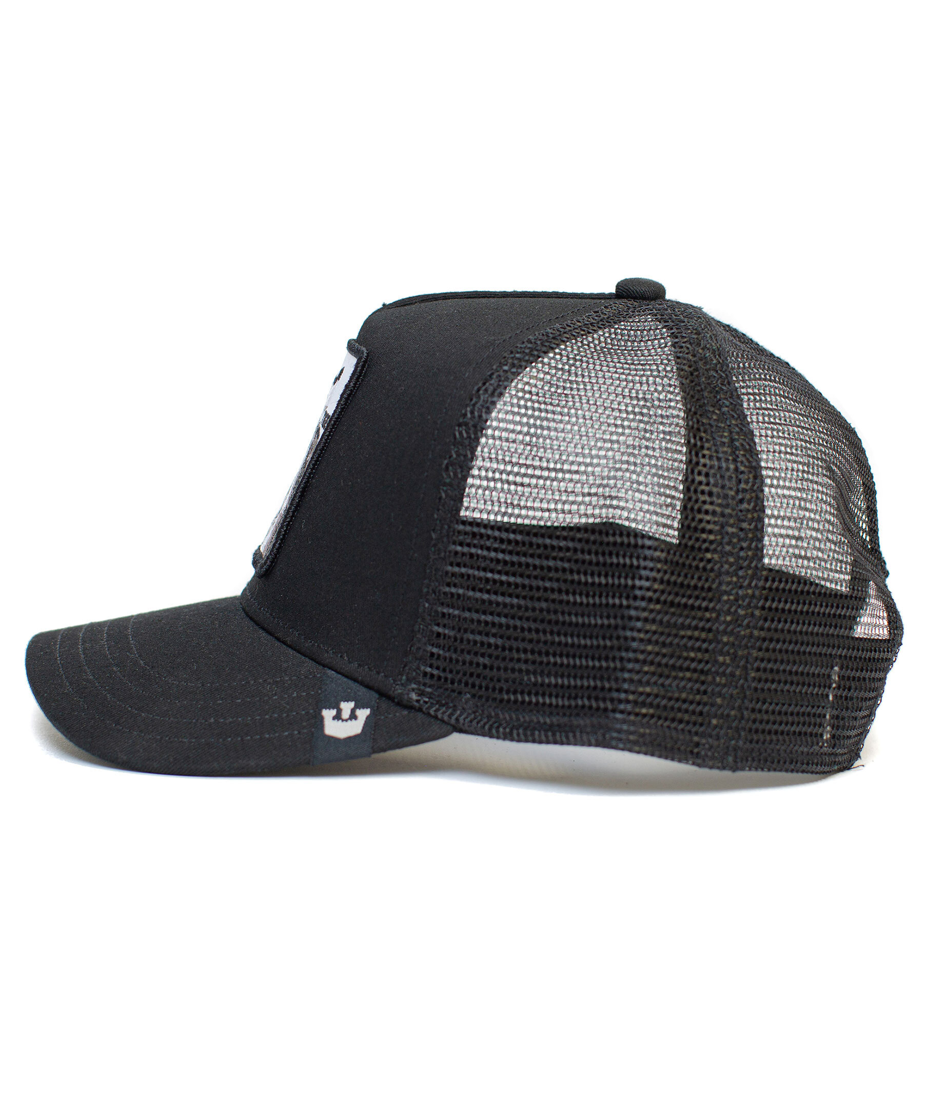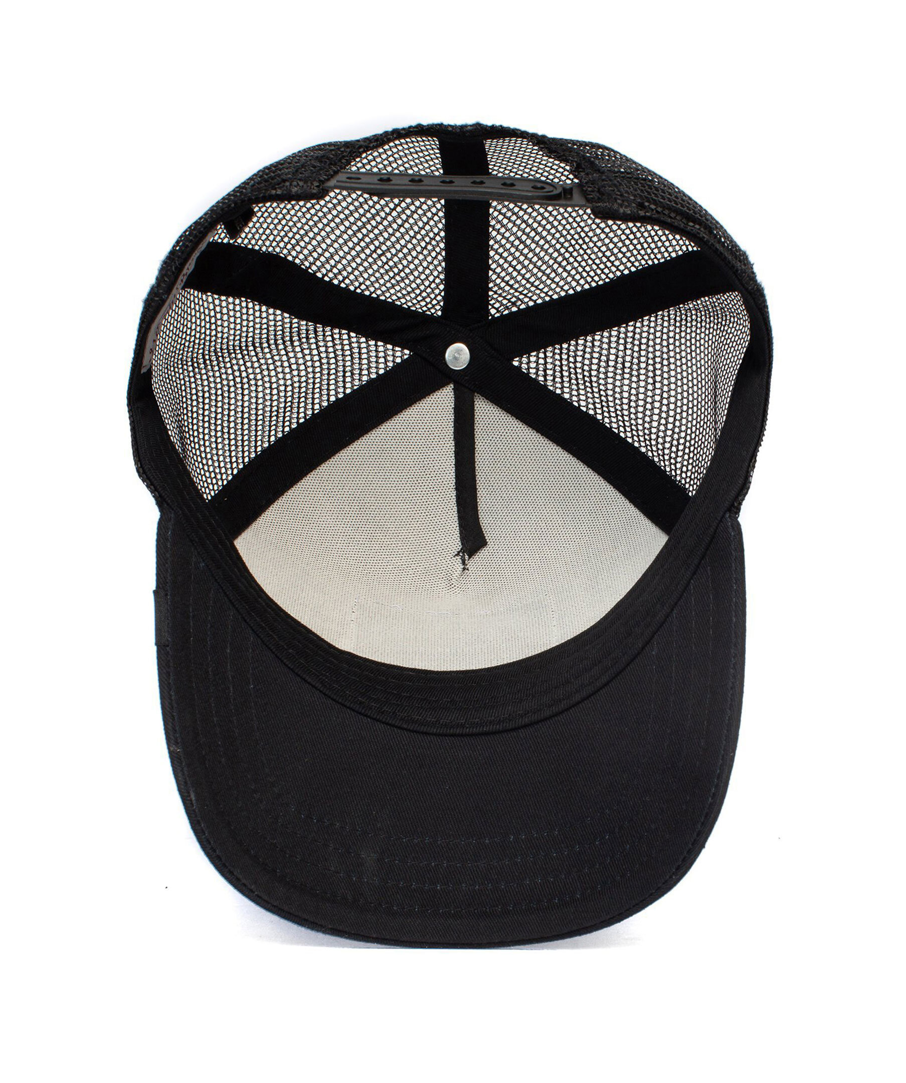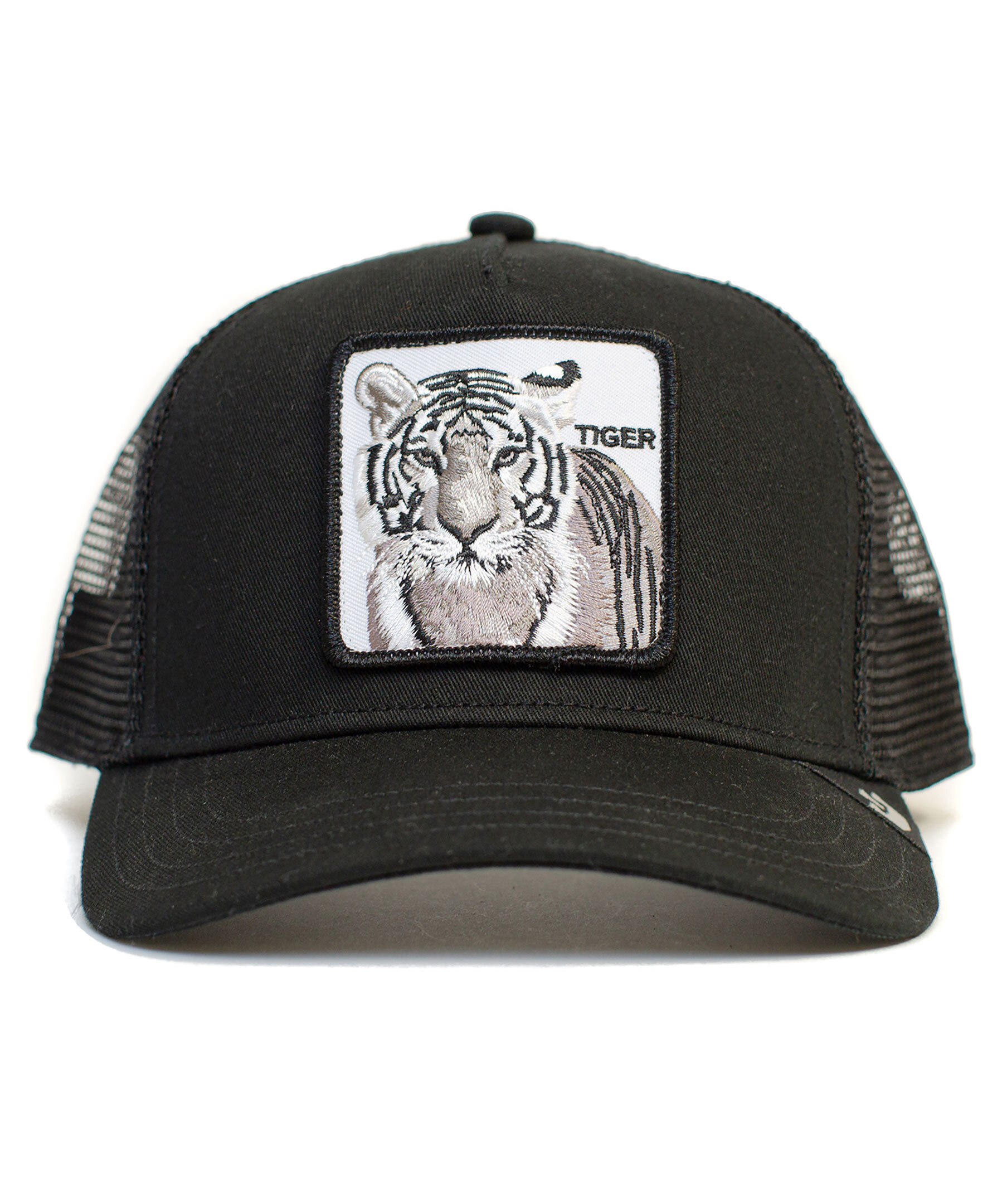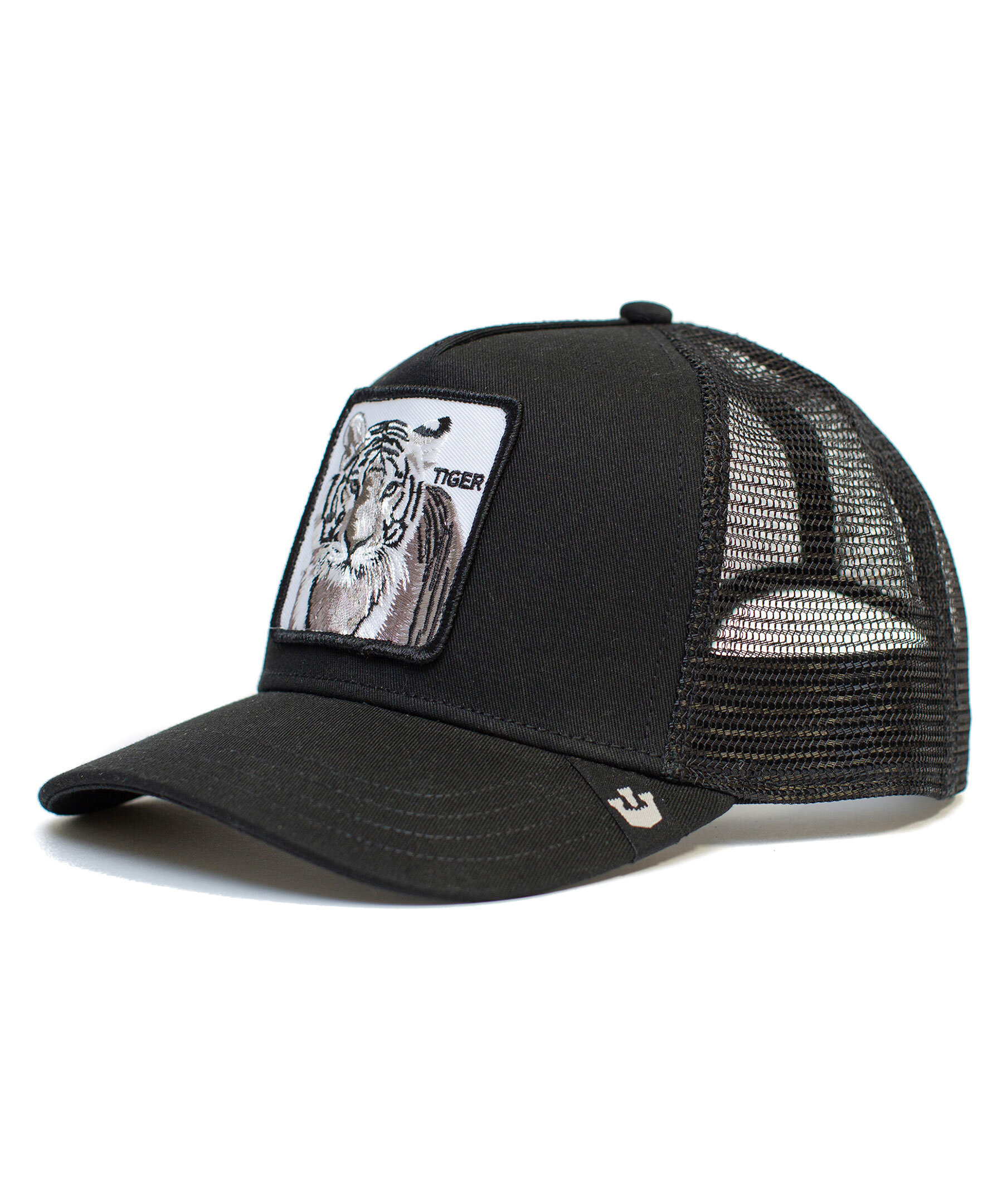 Svart keps i trucker-basebollmodell med fyrkantig patch med en vit tiger på framtill, från Goorin Bros. Onesize storlek med ett justerbart 4-snap-in-rem, vilket betyder att storleksintervallet är 55 cm-61 cm med 58 cm i mitten. Ett bomullssvettband finns fastsytt på insidan. Tillverkad i polyester bak och polyuretan på framsidan.