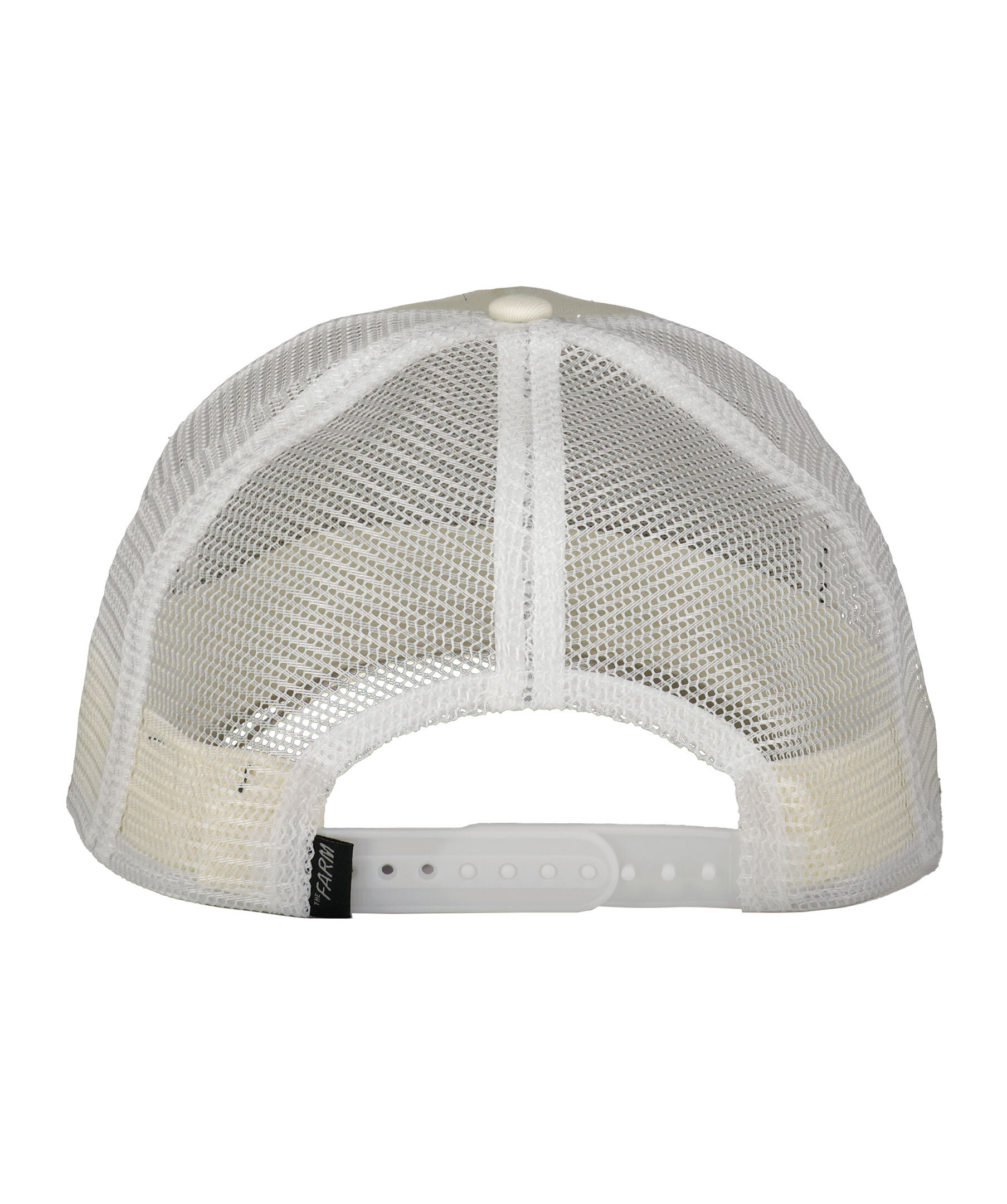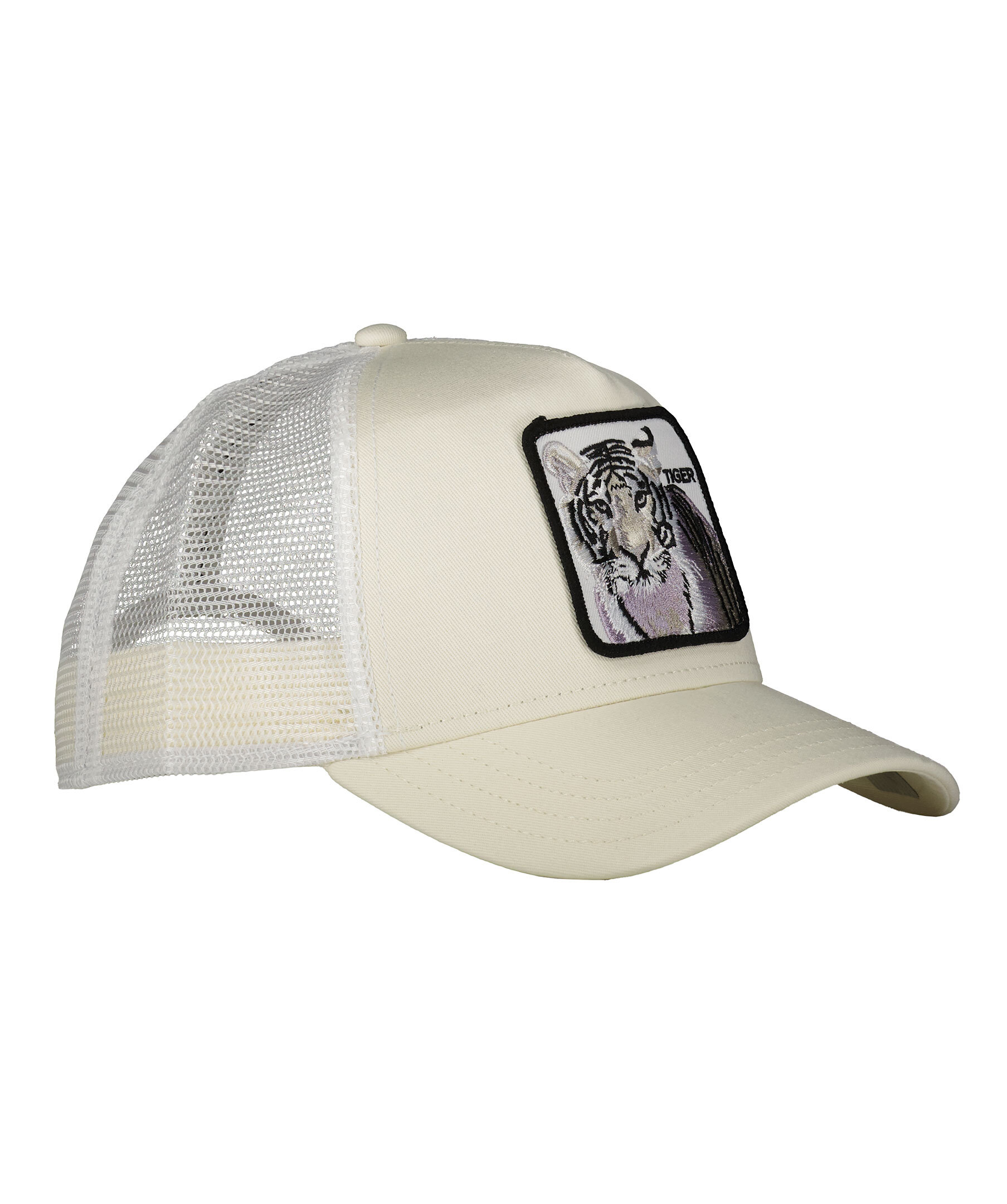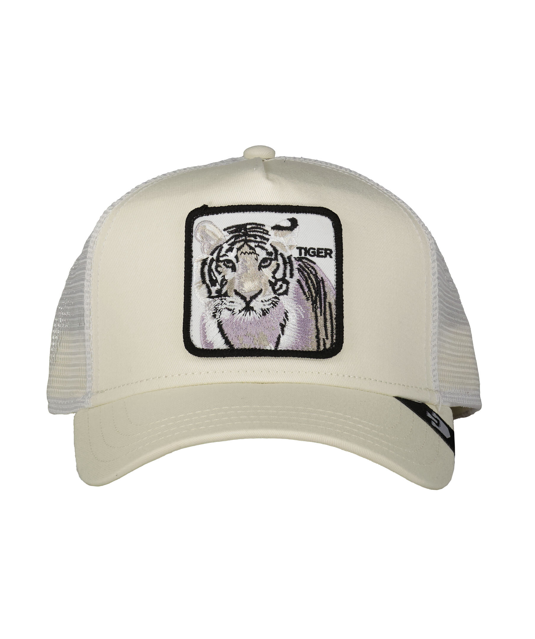 Vit keps med meshtyg i trucker-basebollmodell från Goorin Bros. Fyrkantig patch med en tiger framtill. Onesize storlek med ett justerbart 4-snap-in-rem, vilket betyder att storleksintervallet är 55 cm-61 cm med 58 cm i mitten. Ett bomullssvettband finns fastsytt på insidan. Tillverkad i en polyesterblandning.