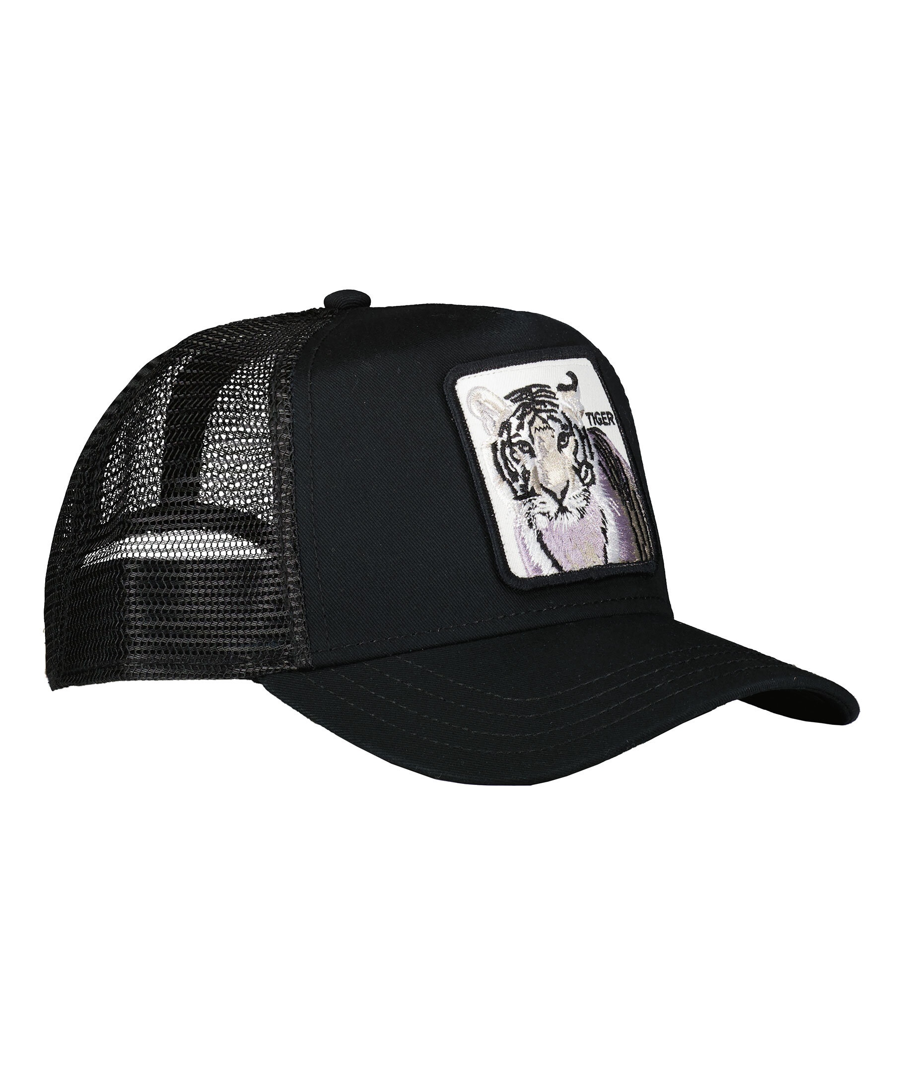 Svart keps med meshtyg i trucker-basebollmodell från Goorin Bros. Fyrkantig patch med en tiger framtill. Onesize storlek med ett justerbart 4-snap-in-rem, vilket betyder att storleksintervallet är 55 cm-61 cm med 58 cm i mitten. Ett bomullssvettband finns fastsytt på insidan. Tillverkad i en polyesterblandning.