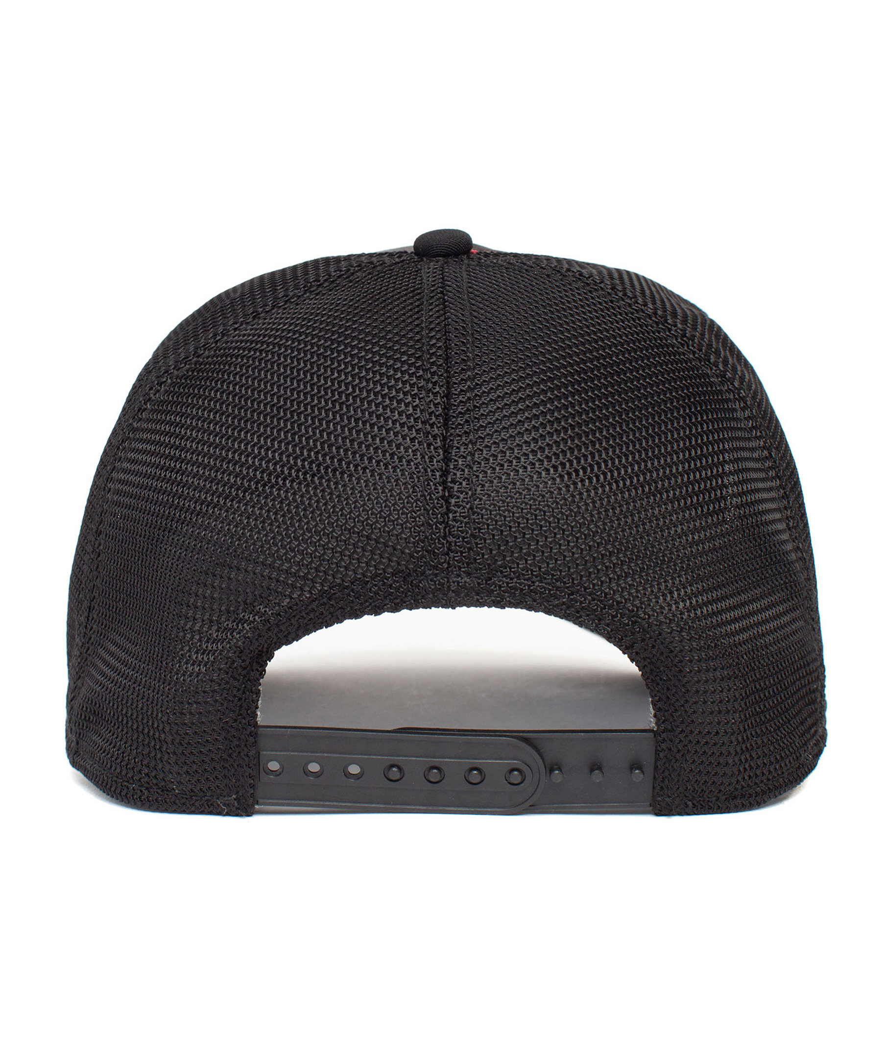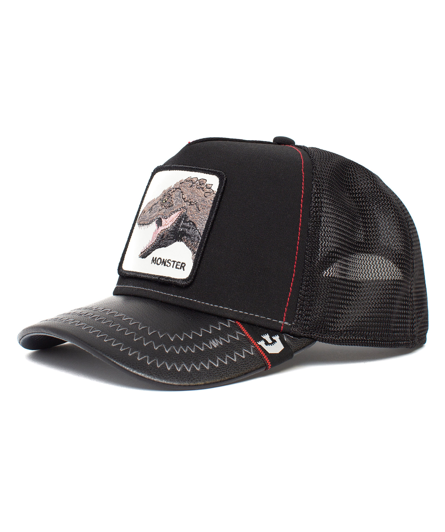 Svart keps i trucker-baseboll modell från Goorin Bros. Skärm i svart läder med vita zick zack sömmar, röda kontrastsömmar och fyrkantig patch med en dinosaurie framtill. Onesize storlek med ett justerbart 4-snap-in-rem, vilket betyder att storleksintervallet är 55 cm-61 cm med 58 cm i mitten. Ett bomullssvettband finns fastsytt på insidan. Tillverkad i polyester bak och polyuretan på framsidan.
