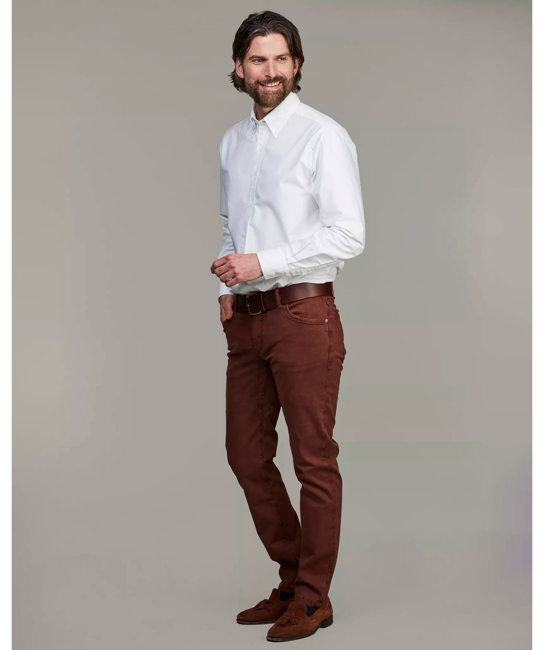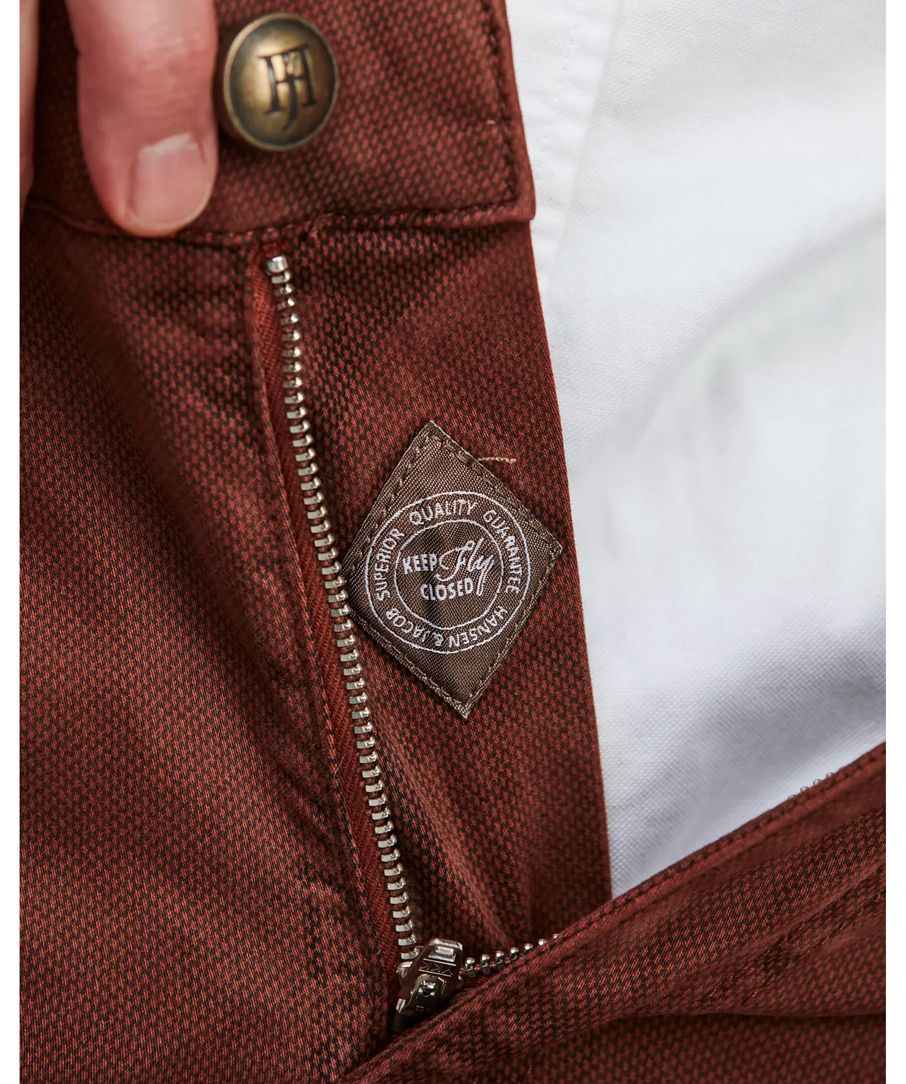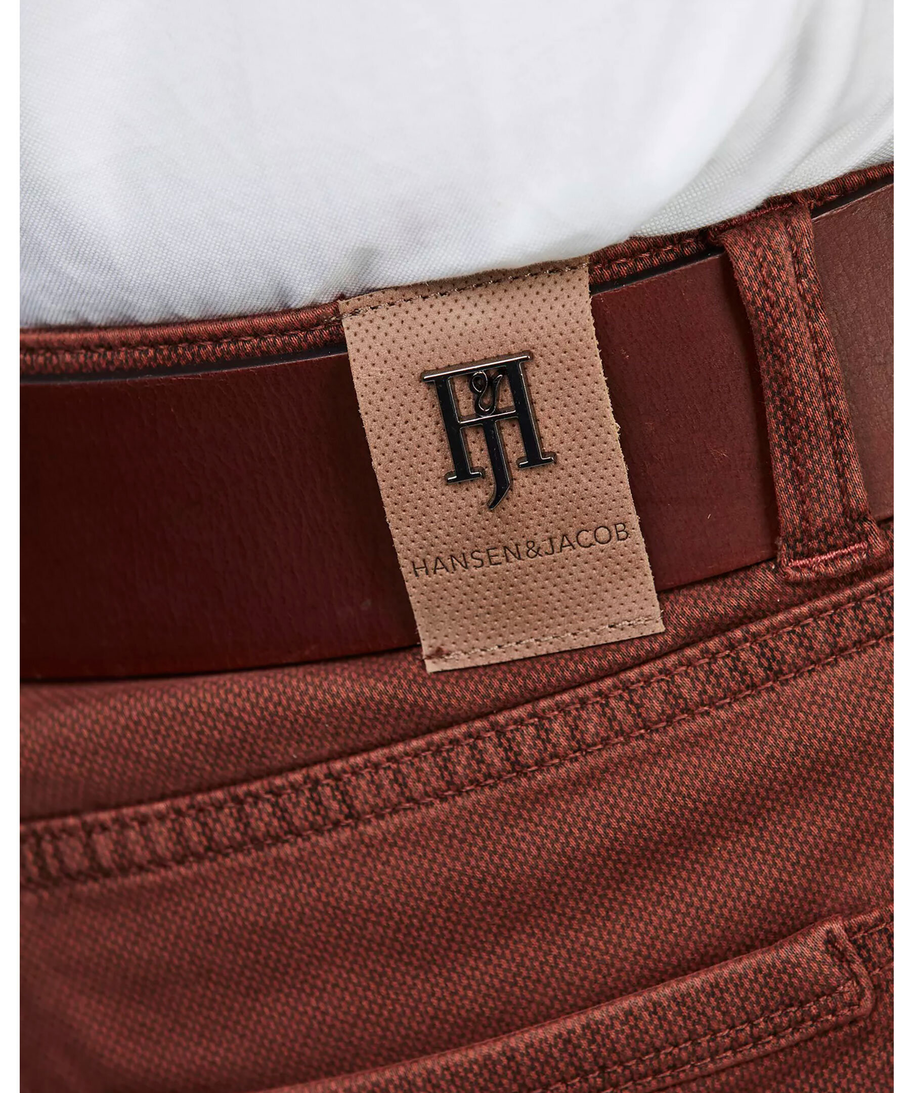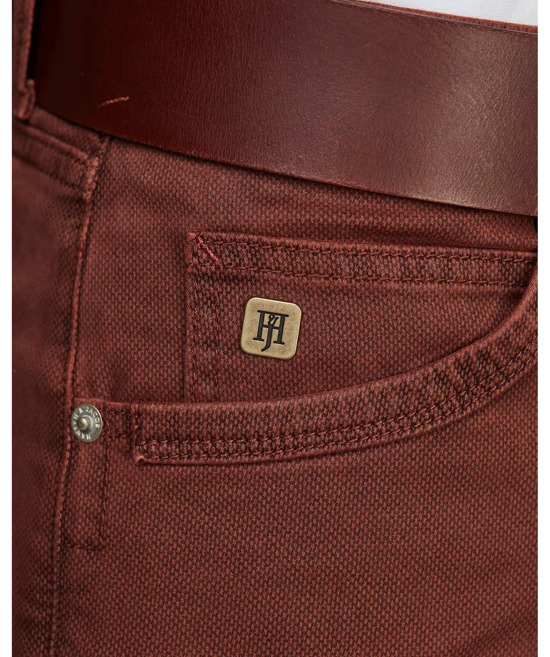 Röda femficksbyxor från Hansen & Jacob med modern design och klassisk siluett. Byxorna är tillverkade i stretchigt tyg med printad yta och har förstärkt grenparti samt förstärkta fickor för extra hållbarhet. Passformen är specifikt utformad med låg midja fram och högre baktill för optimal komfort och stil.