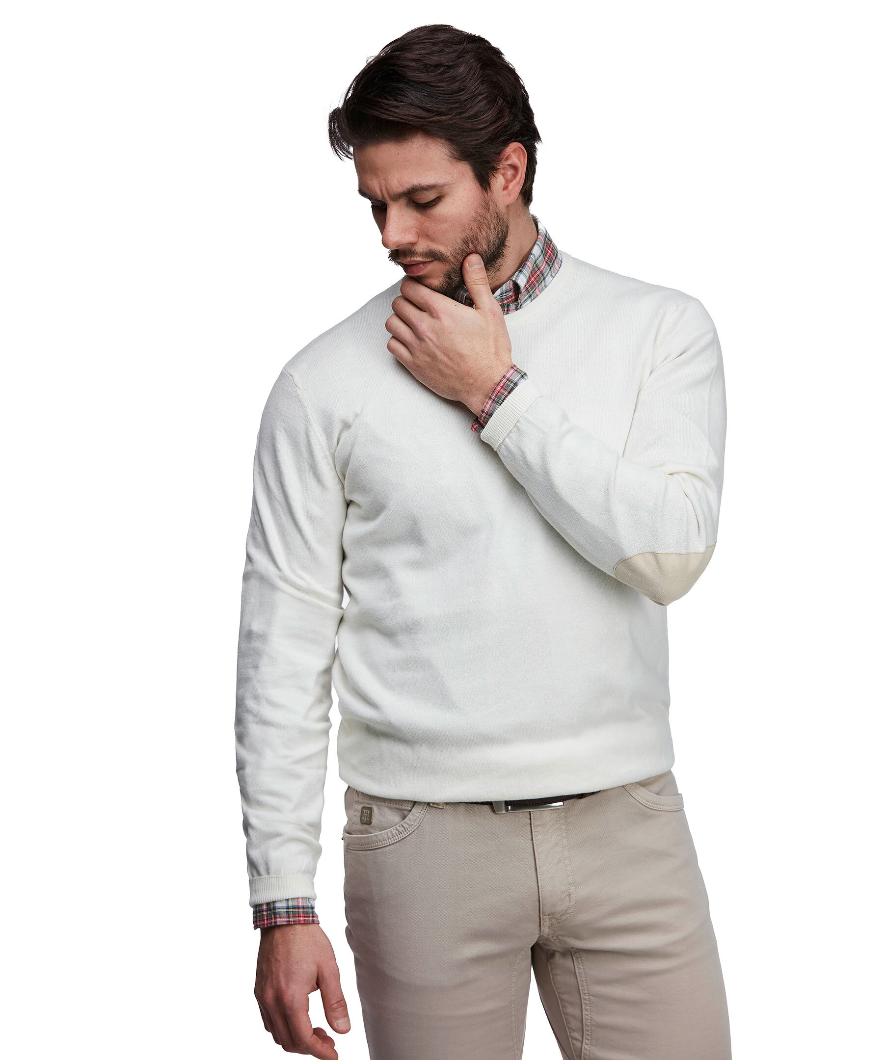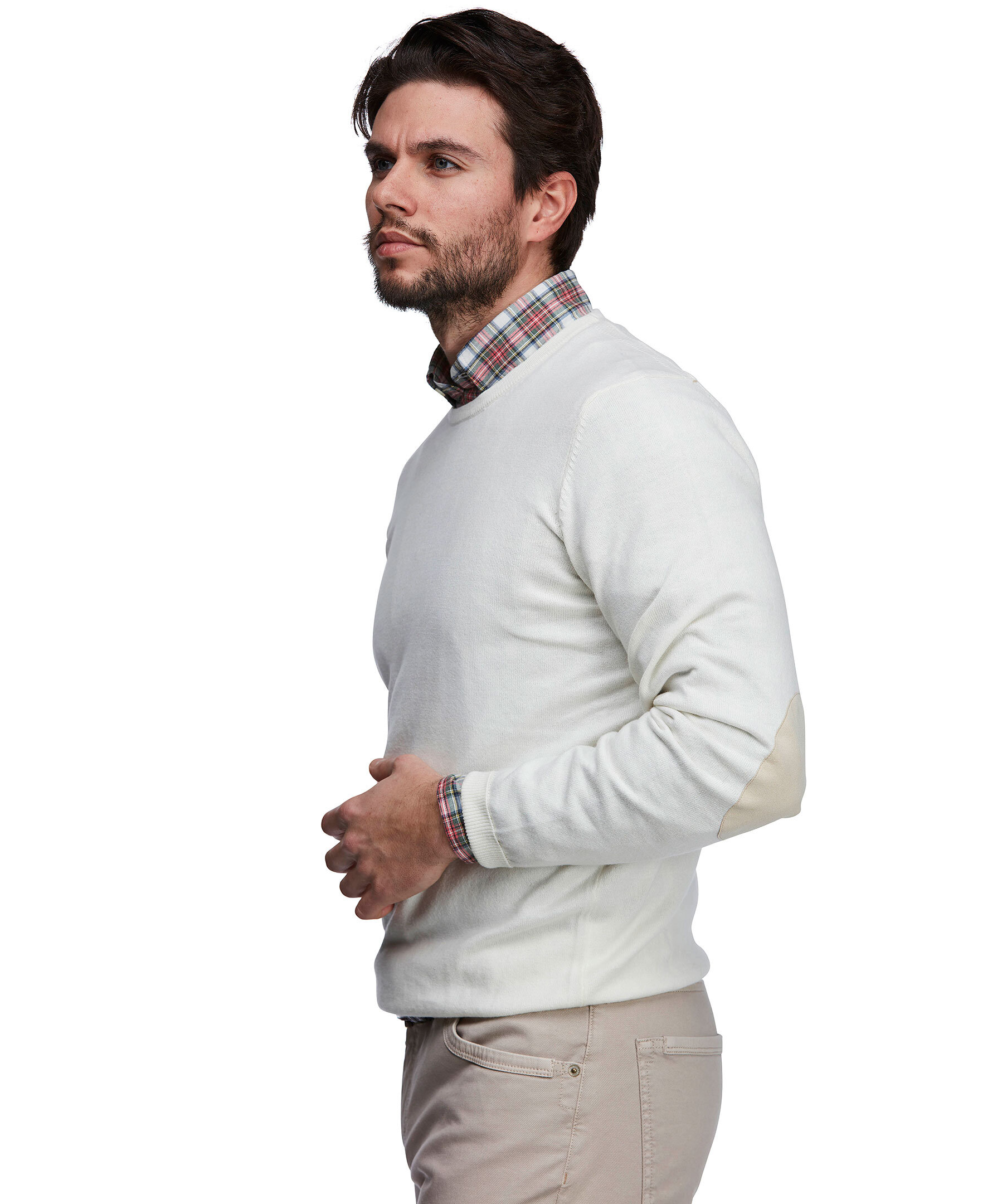 Denna klassiskt tunnstickade tröjan tillverkad av bomull och kashmir har alltid varit en storsäljare hos oss och i år finns den i fler färgen än någonsin. Den mjuka kvaliteten passar perfekt till dig som söker den bästa känslan i ett stickat plagg utan att du skall känna dig för varm. I nacken sitter en liten logga och självklart har den våra karakteristiska ”x-söm" detaljer på axelpartiet. Ärmlapparna är tillverkade i det mjuka mocka liknande materialet alcantara.