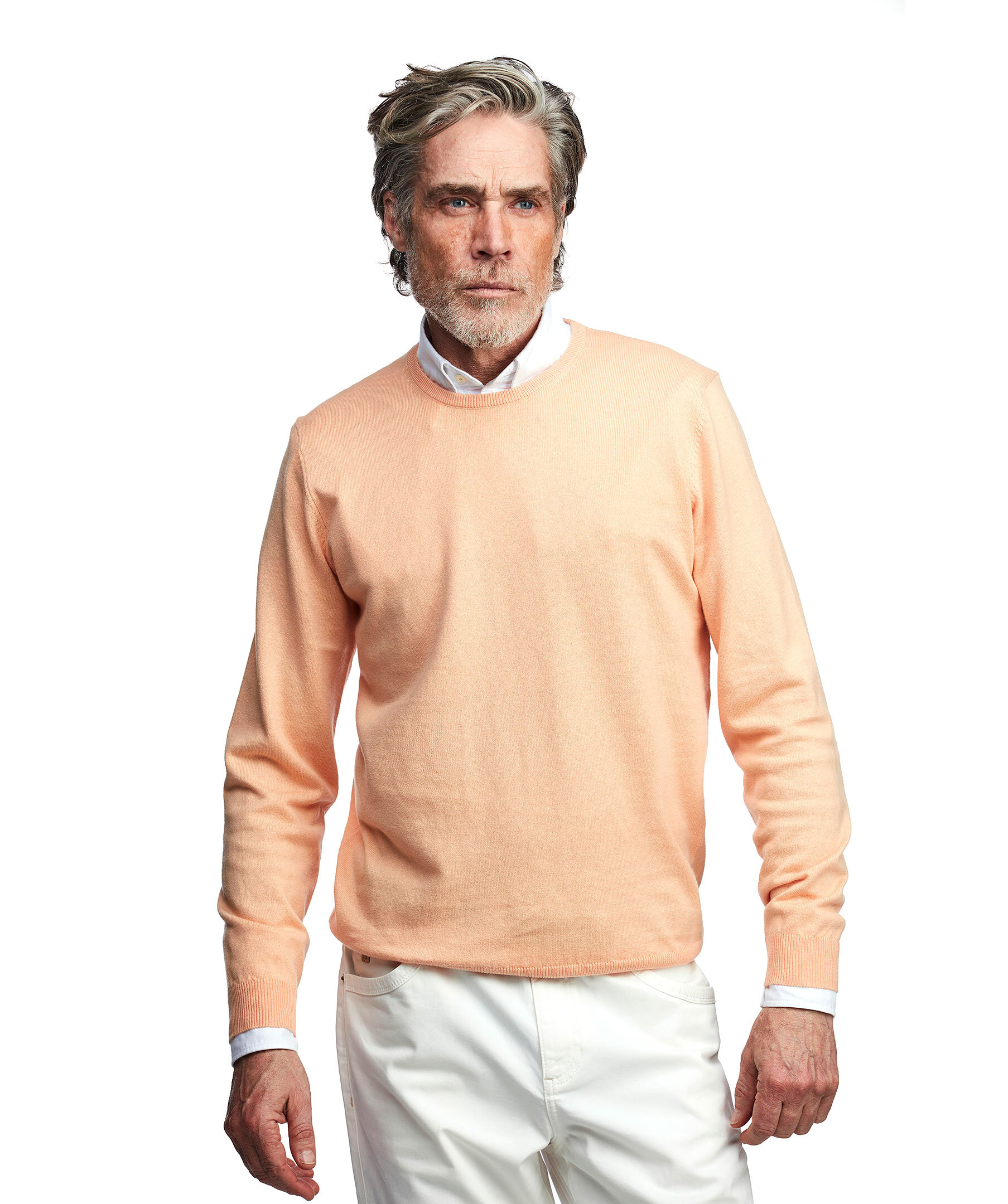 Denna klassiskt tunnstickade tröjan är tillverkad av den finaste bomullen och tillsammans med den exklusiva blandningen av kashmir skapar detta en otrolig behaglig känsla. Tröjan har en ribbstickad rund-halsad krage, nederkant och muddar som en klassisk touch. Denna har alltid varit en storsäljare hos oss och i år finns den i fler färger än någonsin. Den mjuka kvaliteten passar perfekt till dig som söker den bästa känslan i ett stickat plagg utan att du skall känna dig för varm. I nacken sitter en liten logga och självklart har den våra karakteristiska ”x-söm" detaljer på axelpartiet. Ärmlapparna är tillverkade i det mjuka mocka liknande materialet alcantara.