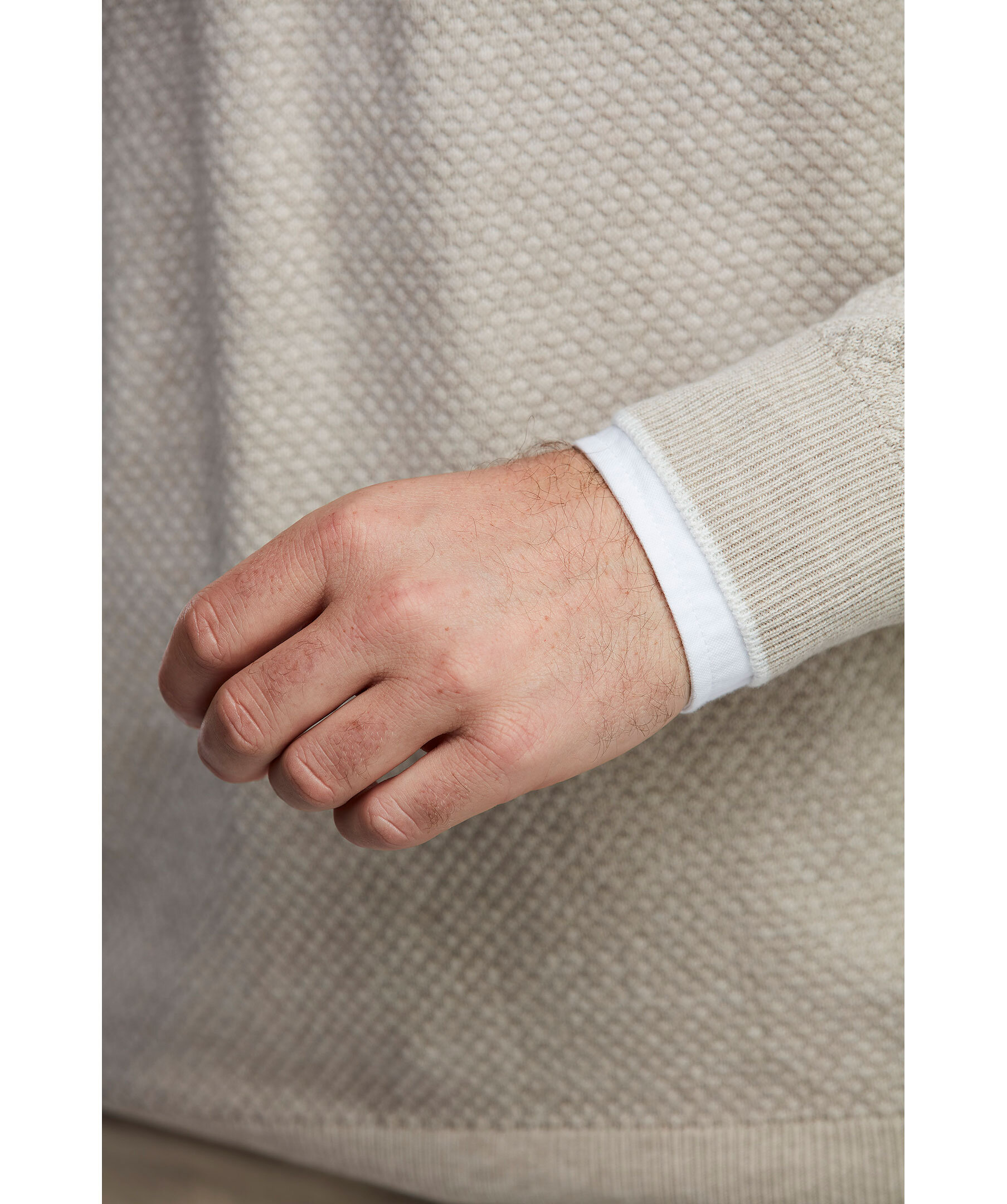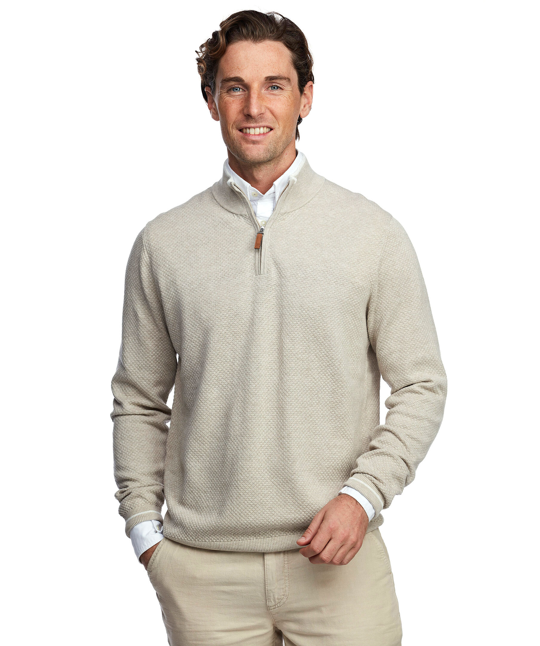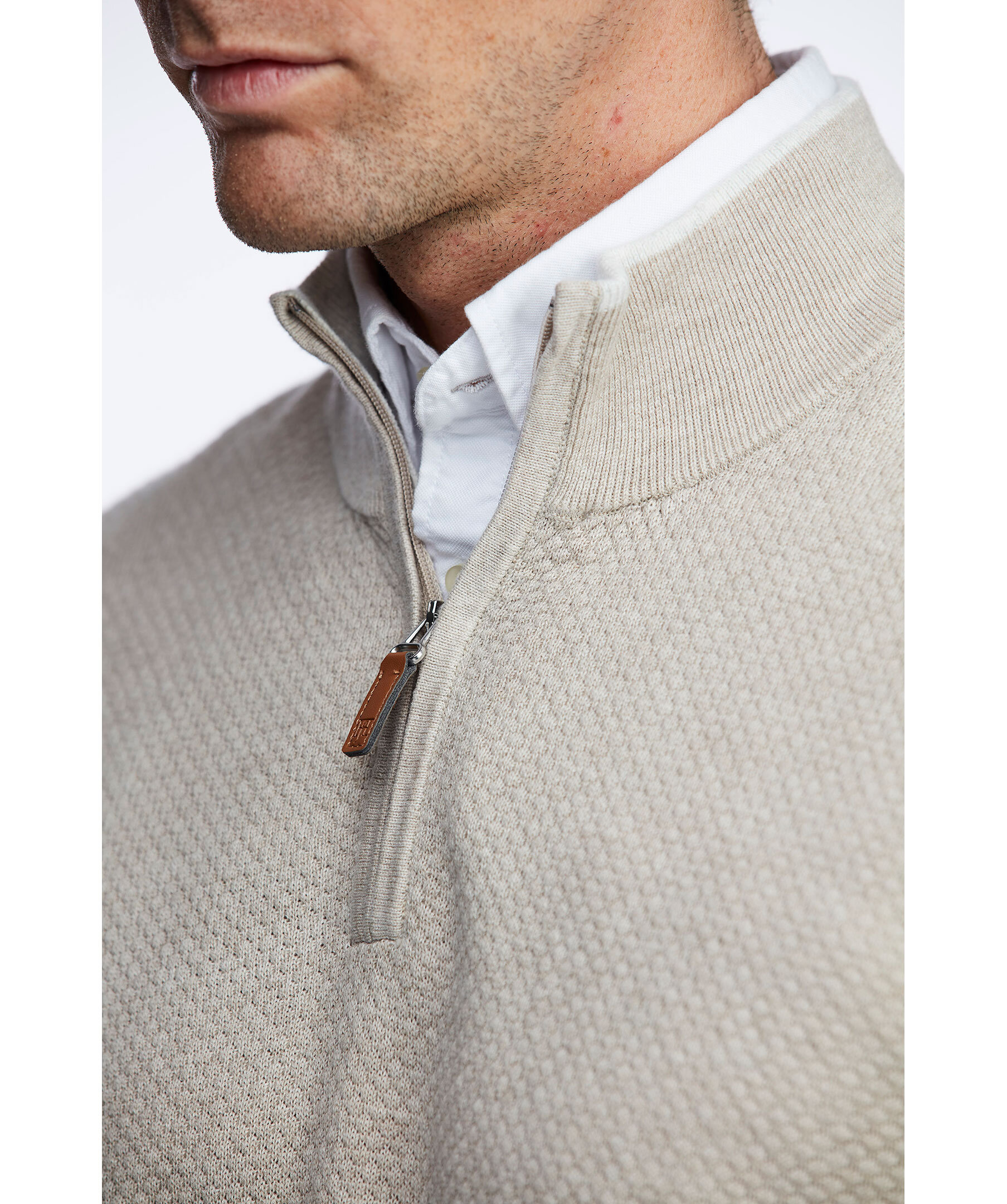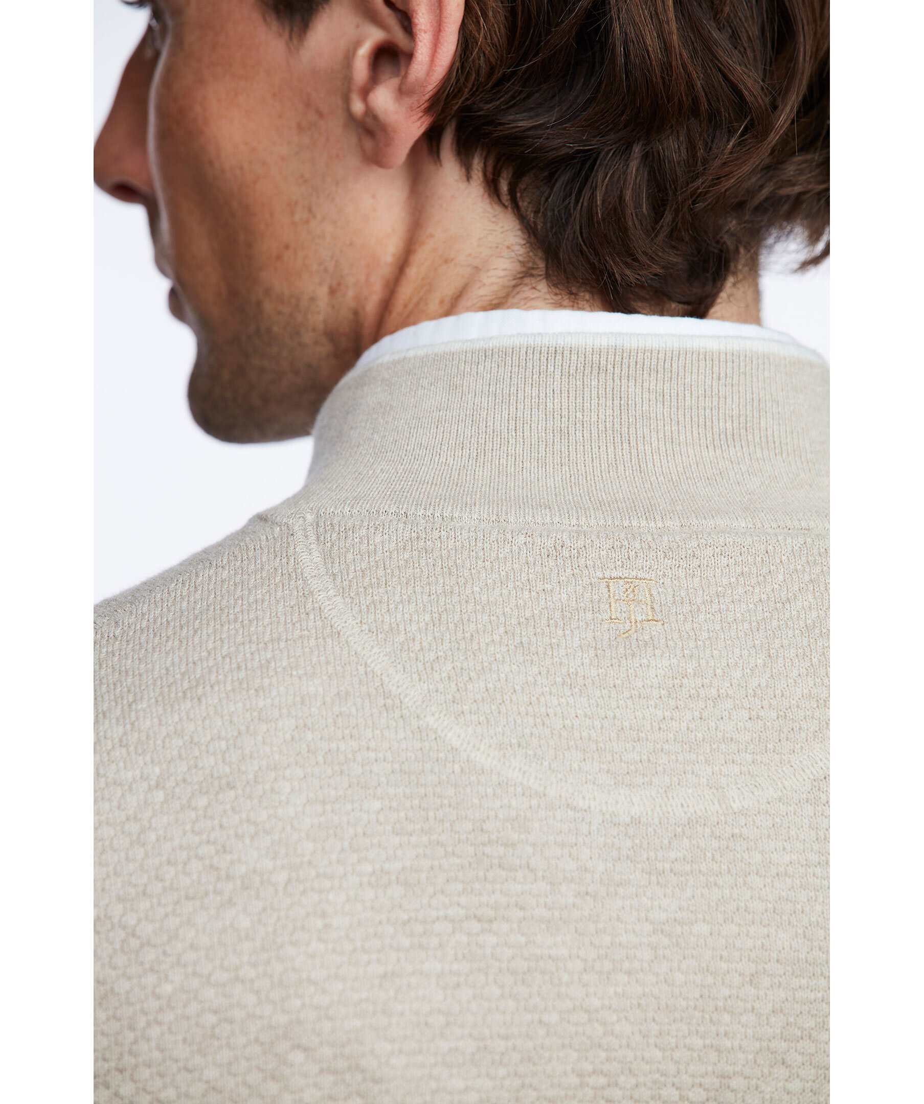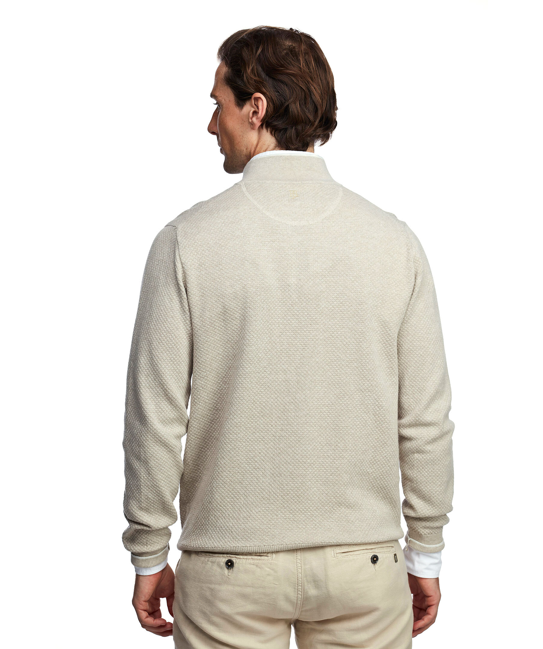 Denna halvzippade bomullströja är en nyhet för säsongen. Den har en s.k diamentstickning som ger den ett snyggt, modernt och lyxigt utseende. Kommer i en hel del färger. Tröjan har en dragkedja som man kan dra ner en liten bit. Den går både att klä upp med en skjorta och slips eller klä ner med bara en t-shirt undertill.
