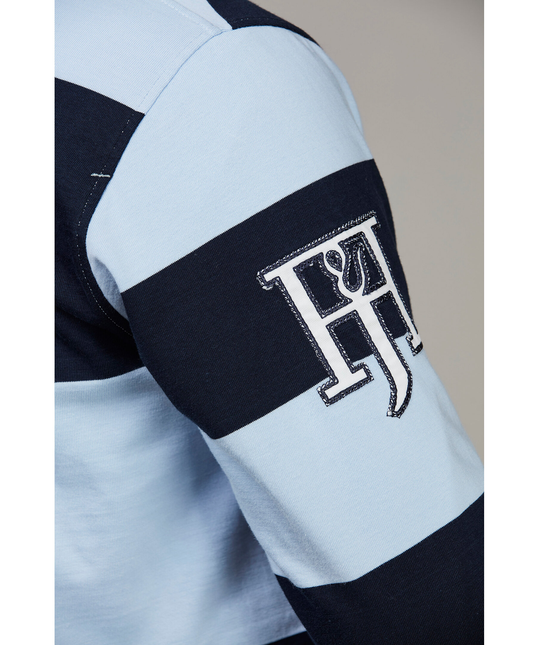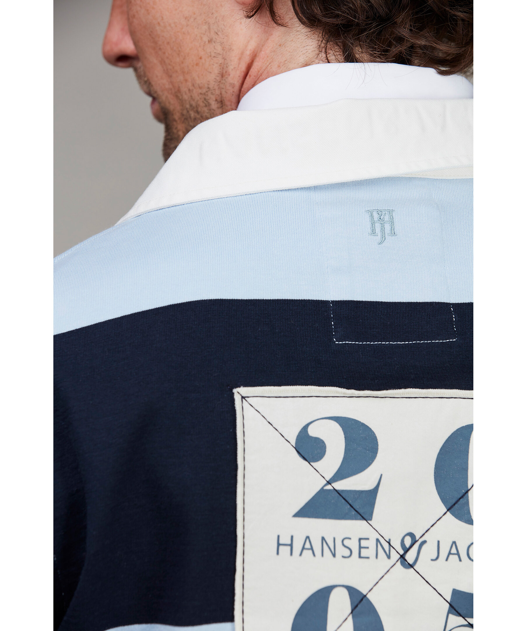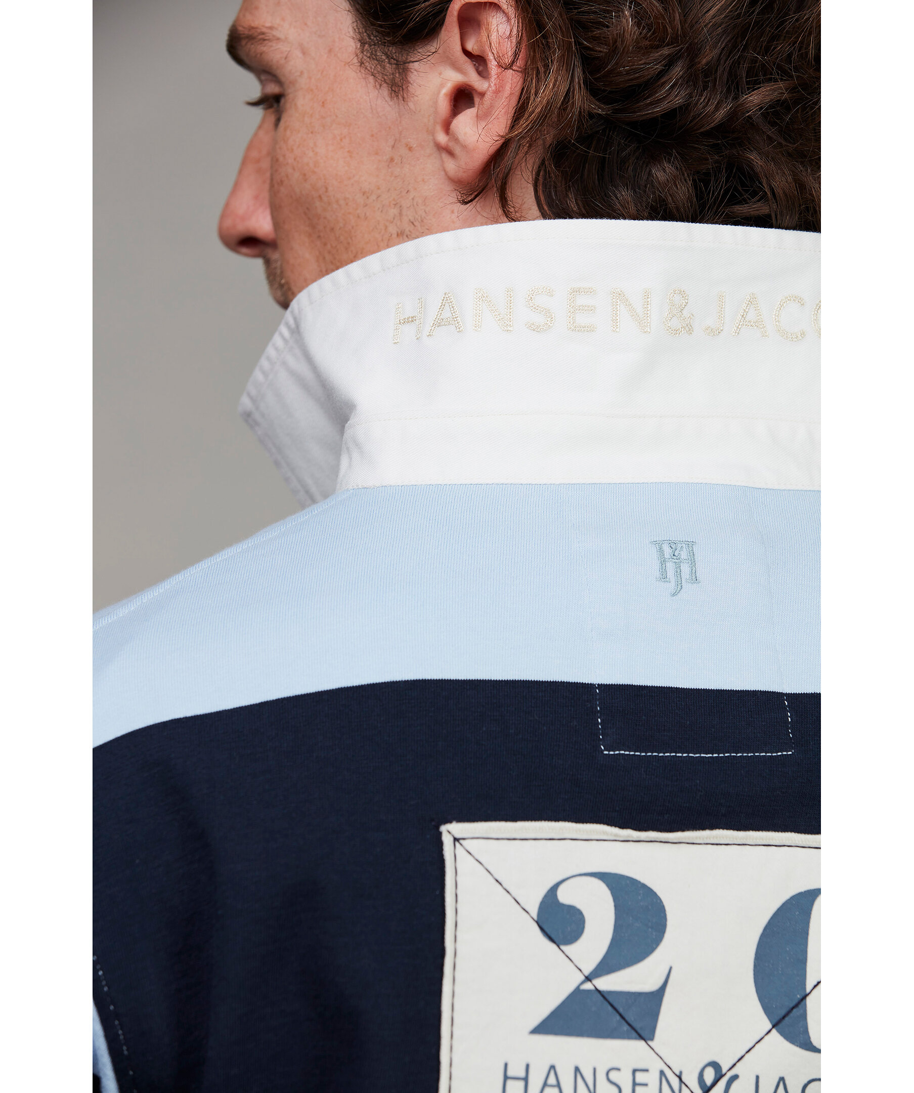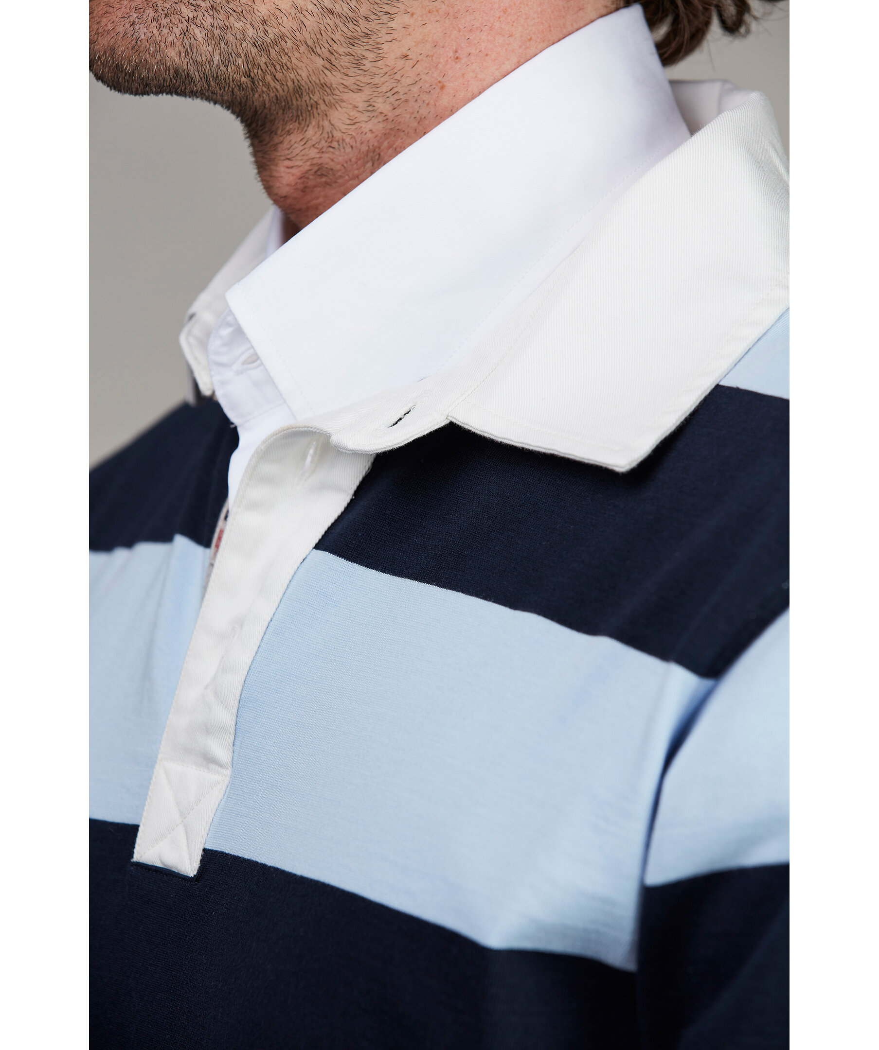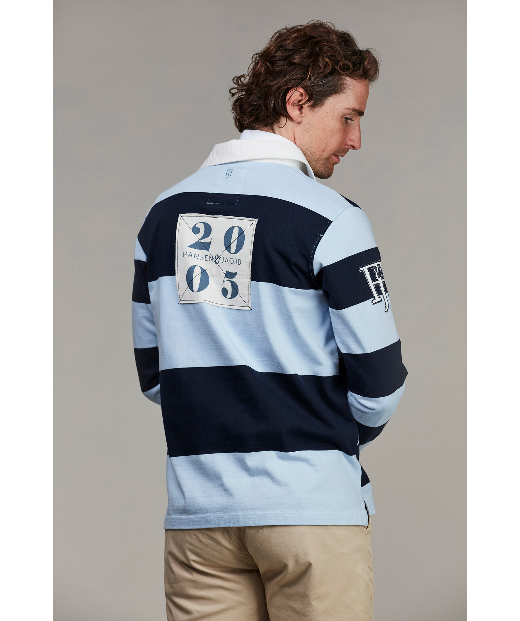 Det här är den ultimata rugbytröjan! Med sina klassiska tvärränder i två färger och en stilren cremefärgad krage, andas den tradition och tidlös stil. På ryggen pryds tröjan av en elegant patch som hyllar året då vi grundades – en subtil men kraftfull detalj.