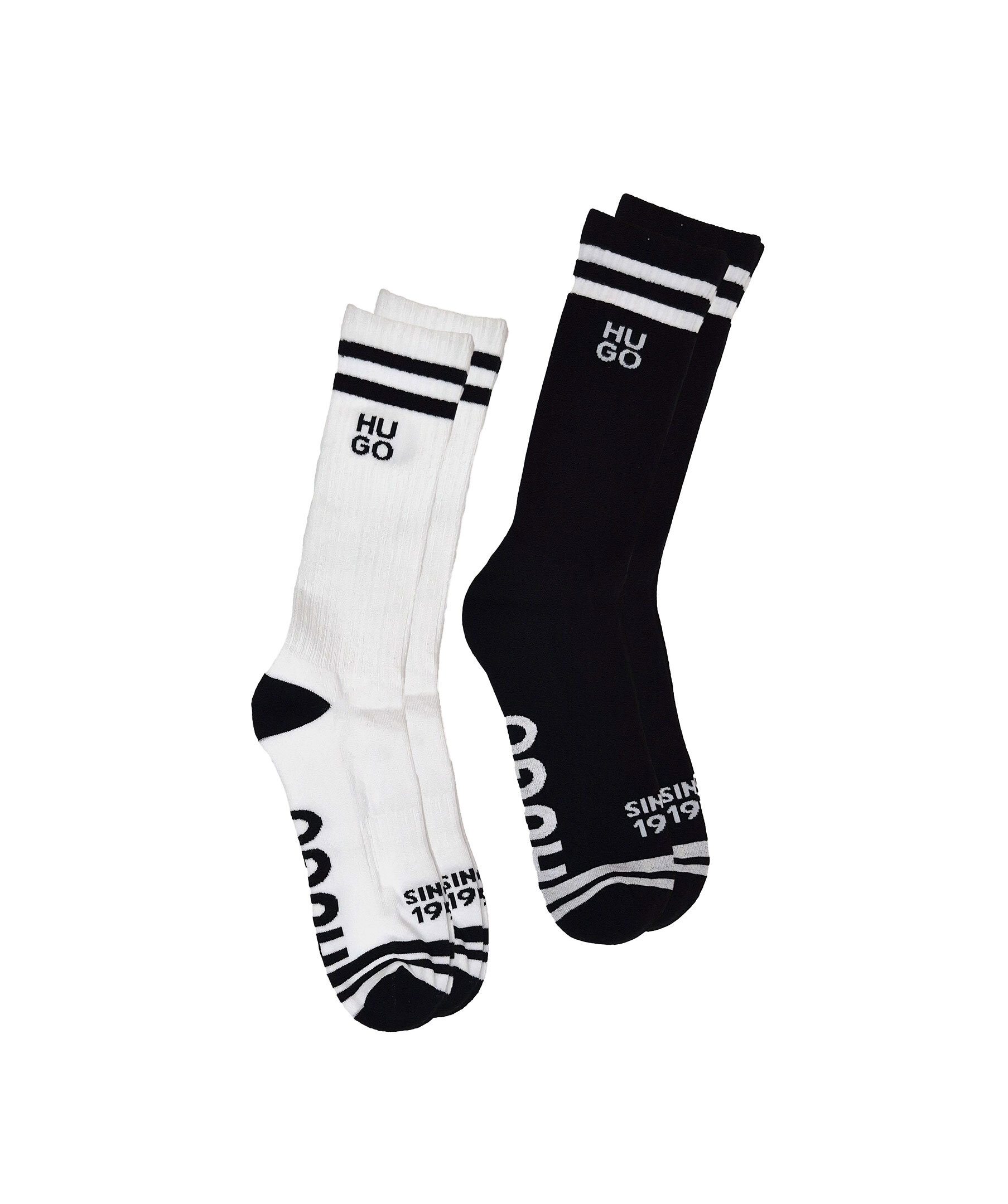 2-pack, höga strumpor från HUGO i svart och vitt. Strumporna har ränder och logotyp vid skaftet samt logotyp på fotens ovansida. Tillverkade i en bomullsblandning.