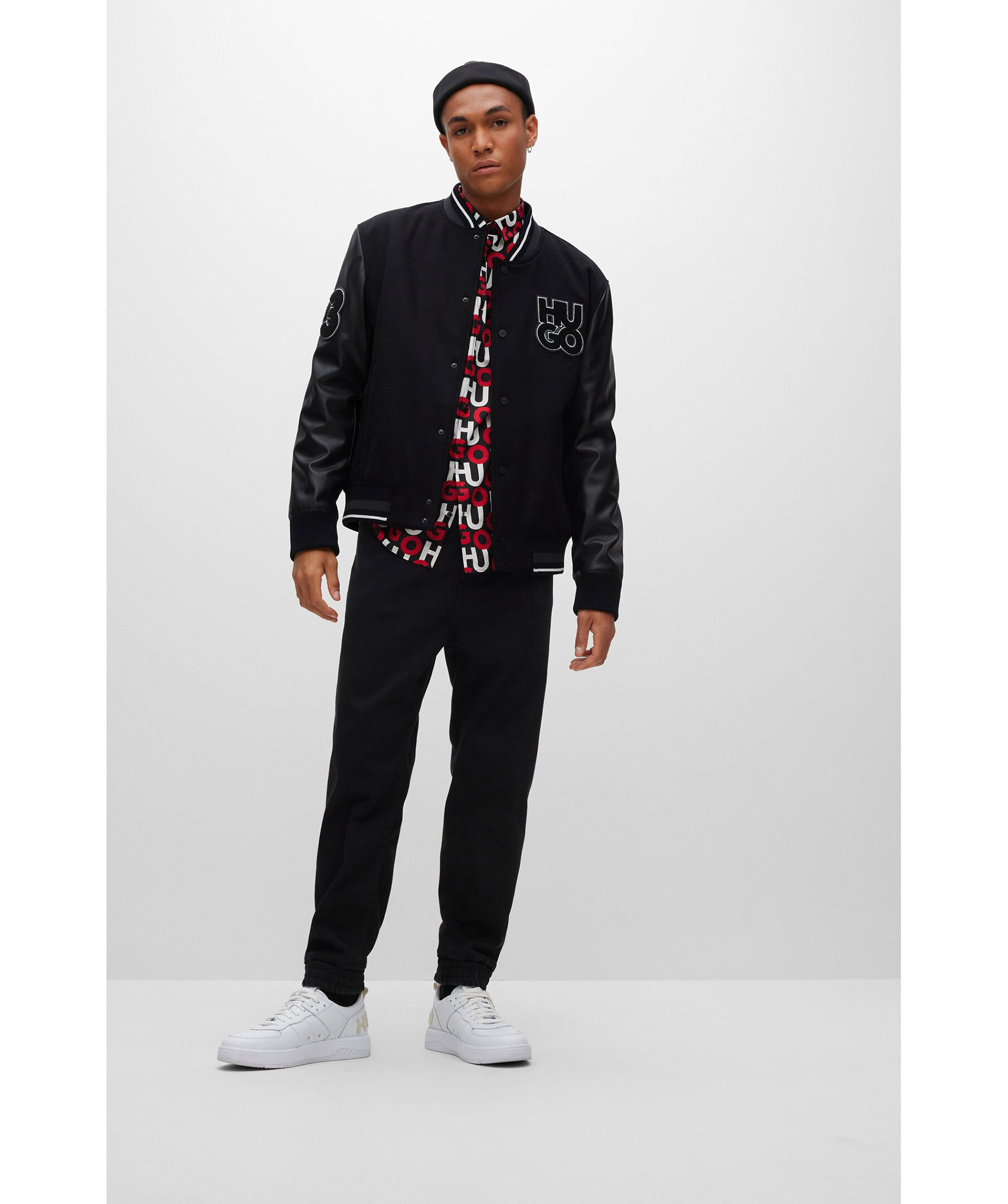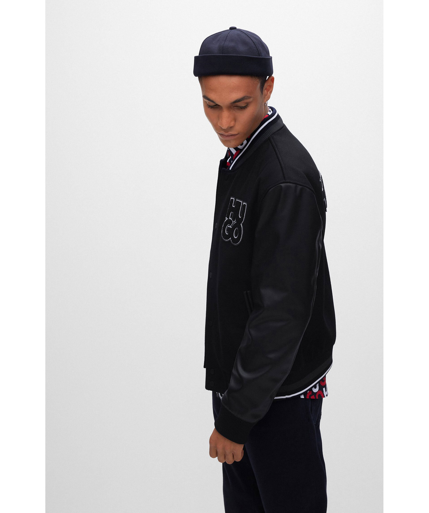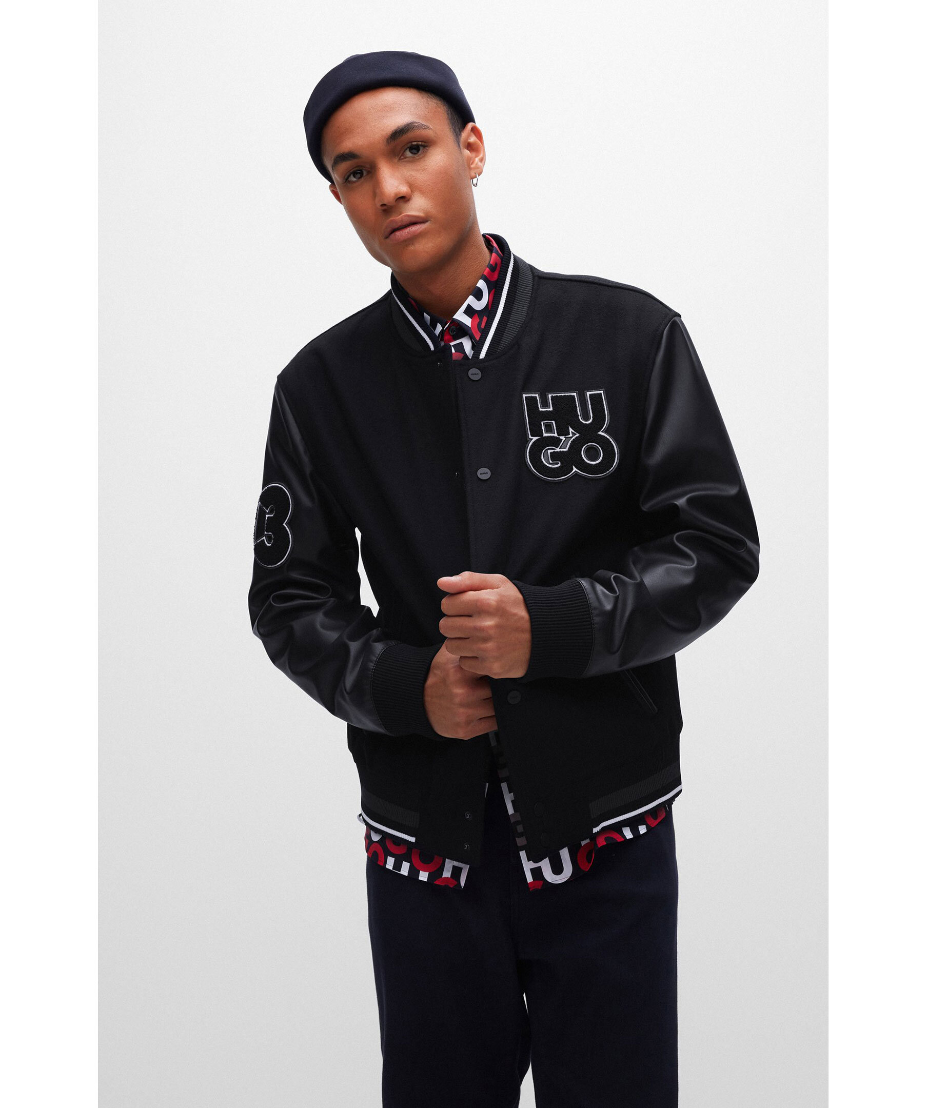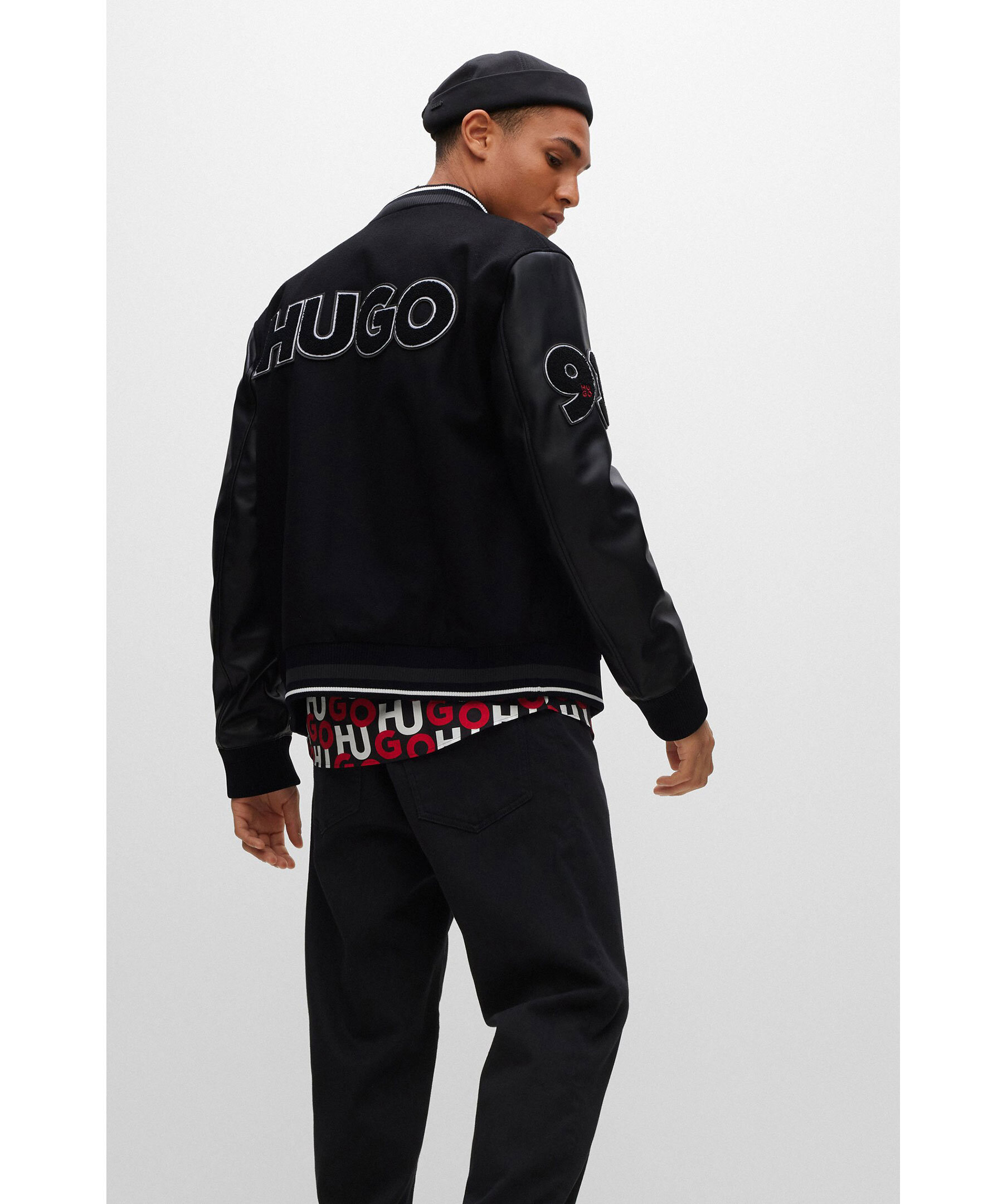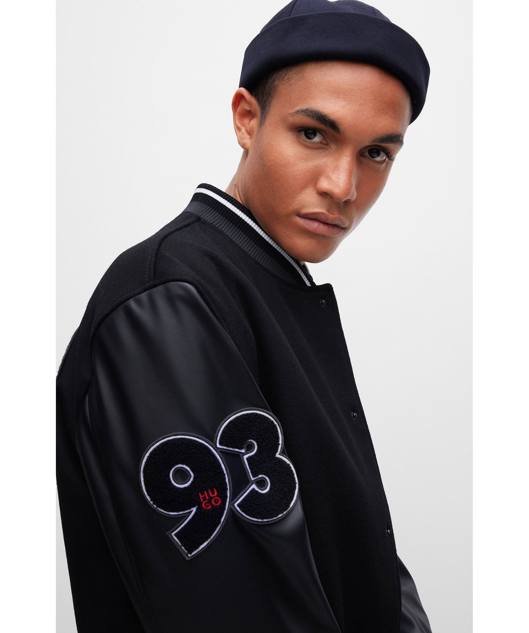 Svart varsityjacka i bomberstil i normal passform från HUGO. Patch med logga på vänster bröst, en stor Broderad HUGO-logga på ryggen och patch på höger ärm med numret 93. Tillverkad i en ullblandning med inslag av kashmir. Ärmar i konstläder och randiga ribbade kanter vid ståkragen och i plaggslut samt svarta ribbade muddar i ärmslut. Stängs med tryckknappar, har två öppna fickor i sidorna och innerficka med dragkedja. Passform rygglängd: 65 cm i storlek M.