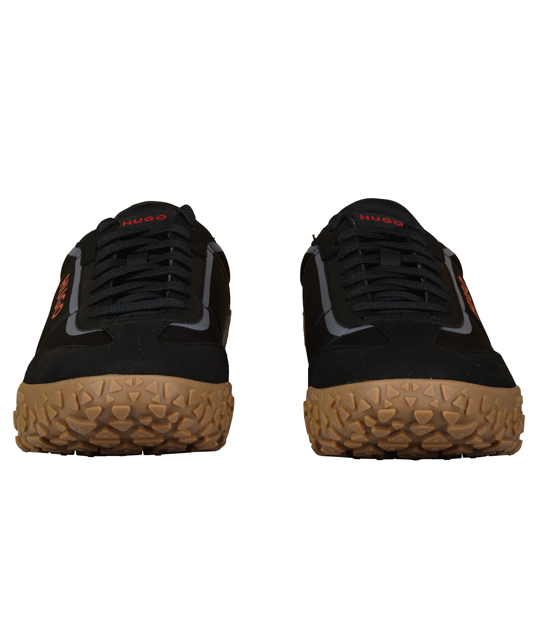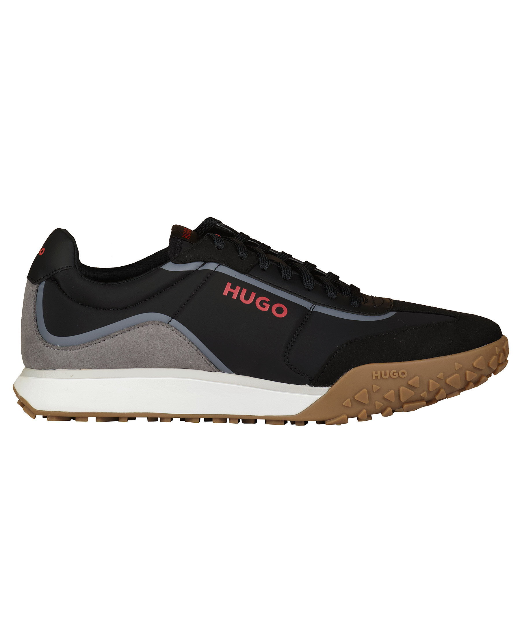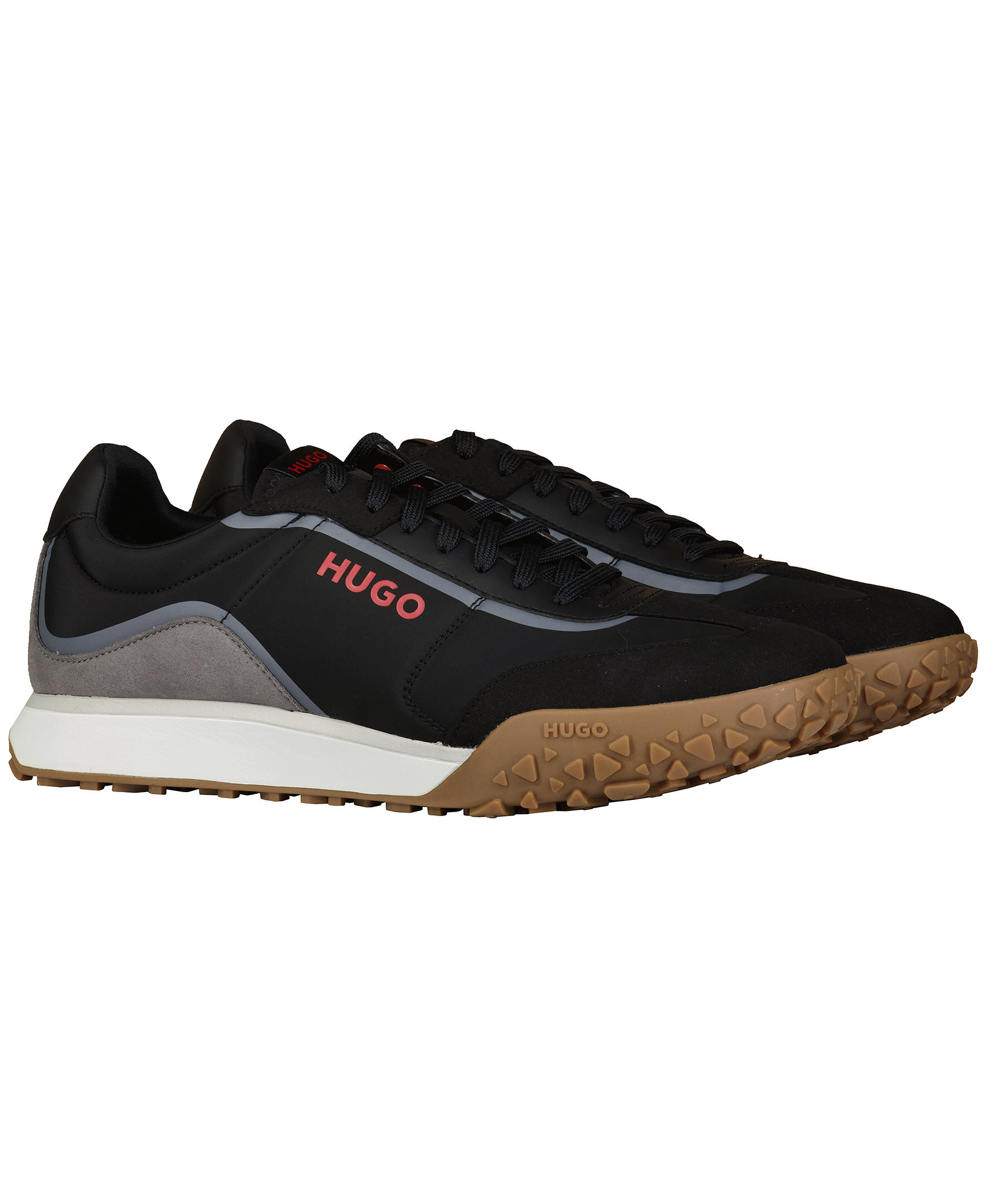 Svarta sneakers från HUGO Men. Vit och brun sula i gummi. Tryckta logotyper i rött, patch på plösen. Grå detaljer i imitation av mocka. Platta skosnören i svart.