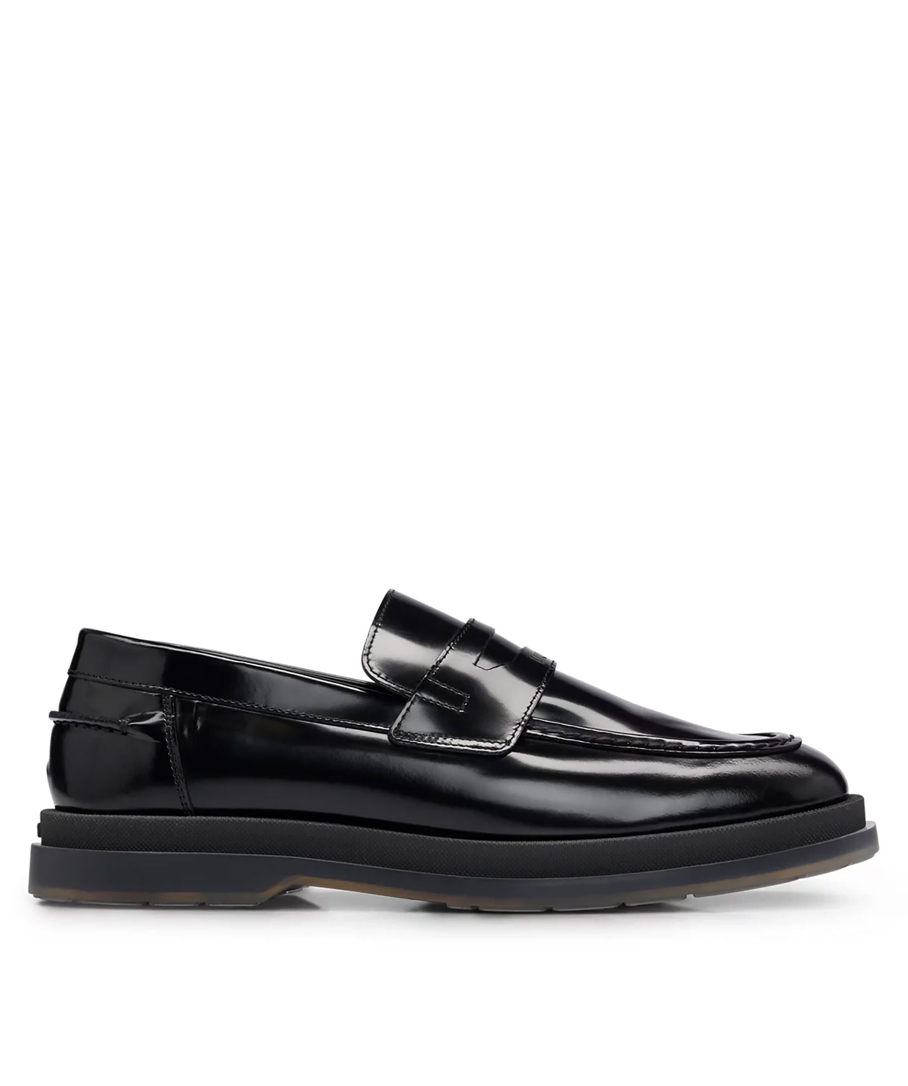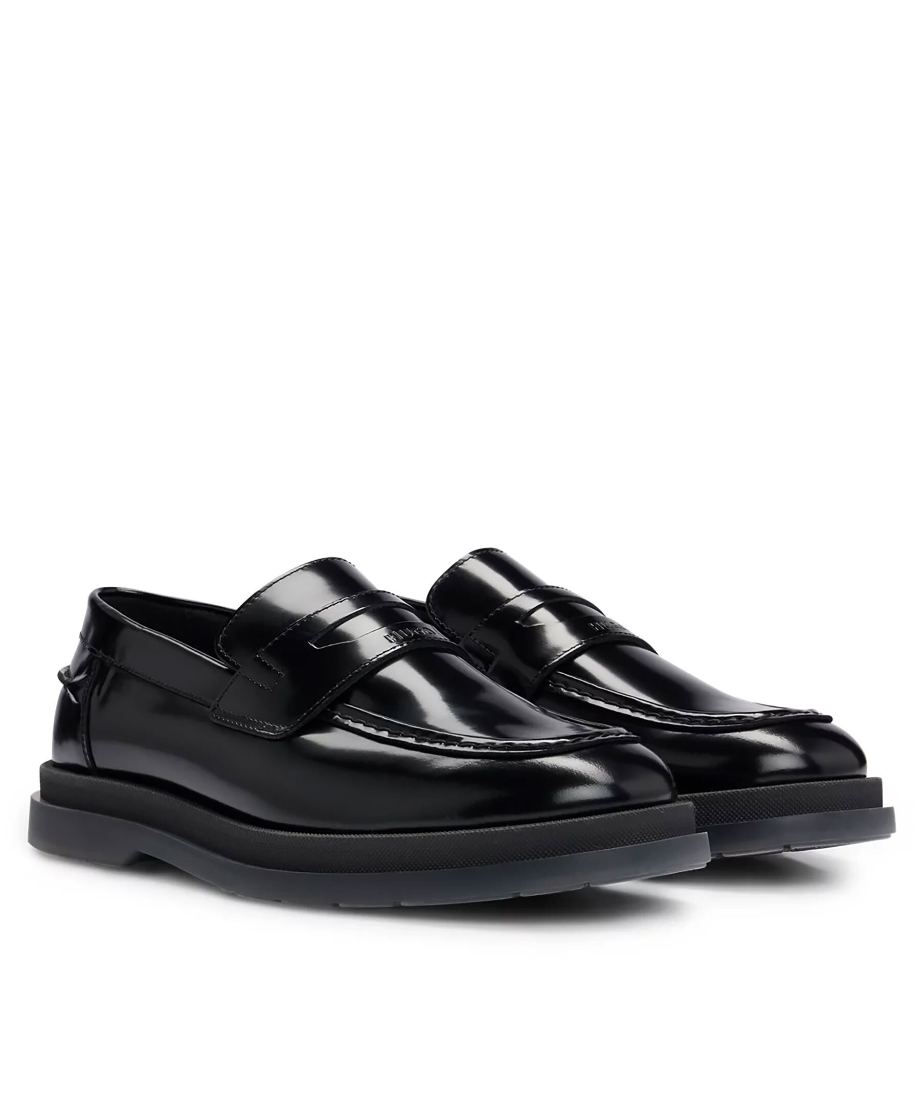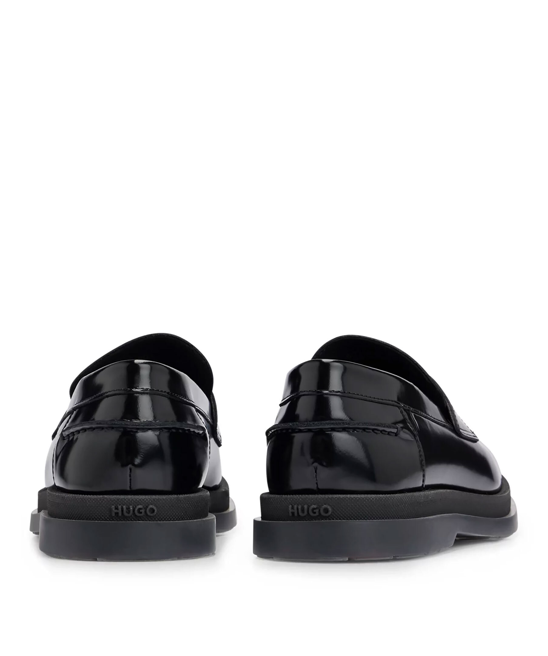 Svarta blanka loafers i läder från HUGO. Grov sula i gummi. Embossad logotyp framtill i lädret. Präglad logotyp baktill på hälen. Tillverkad i borstat läder.