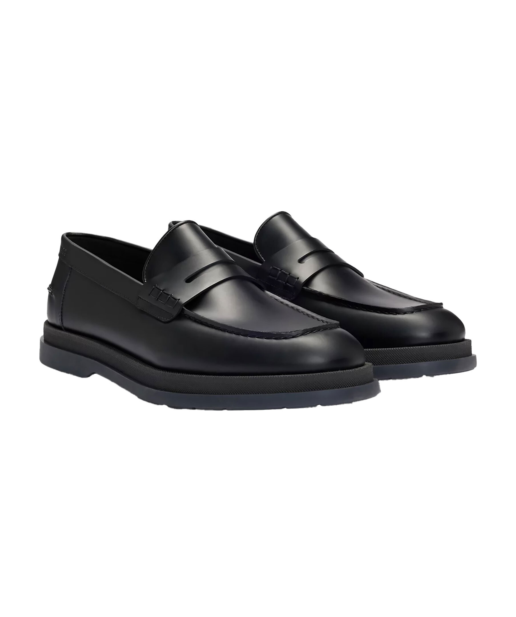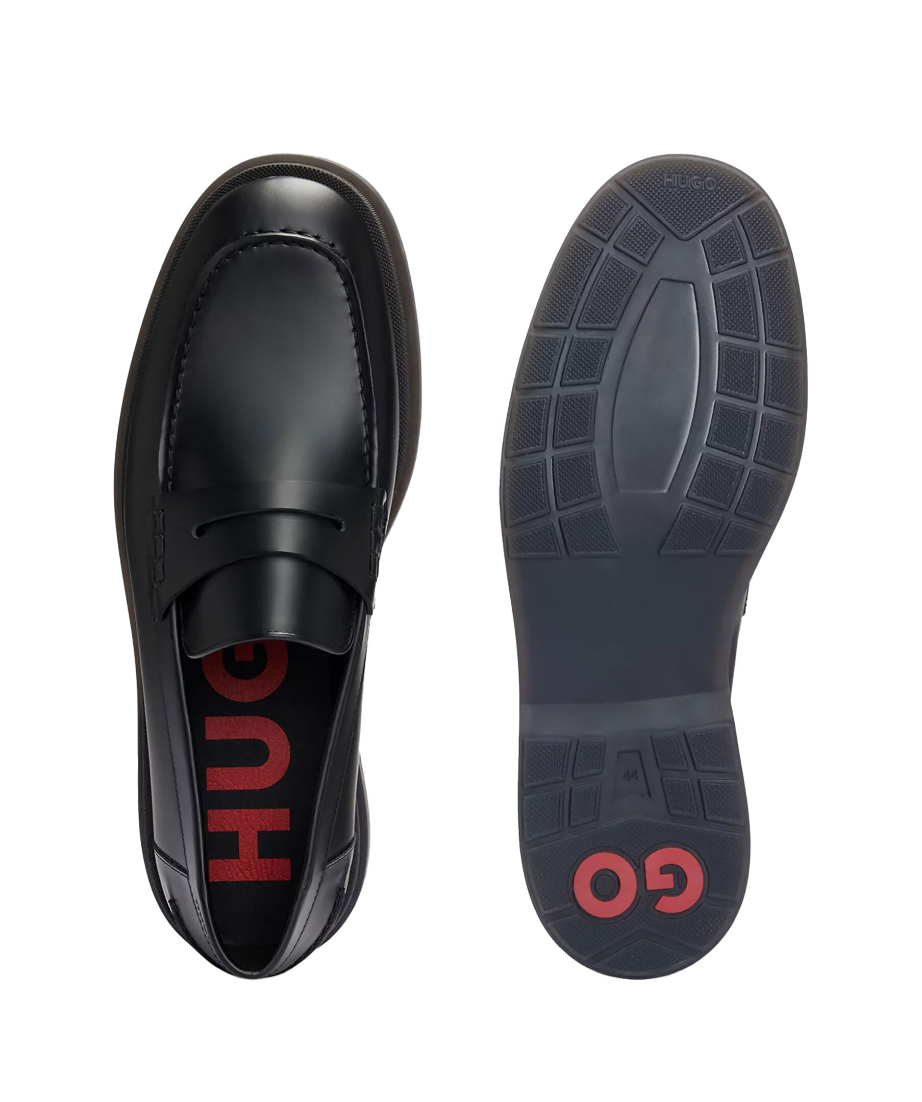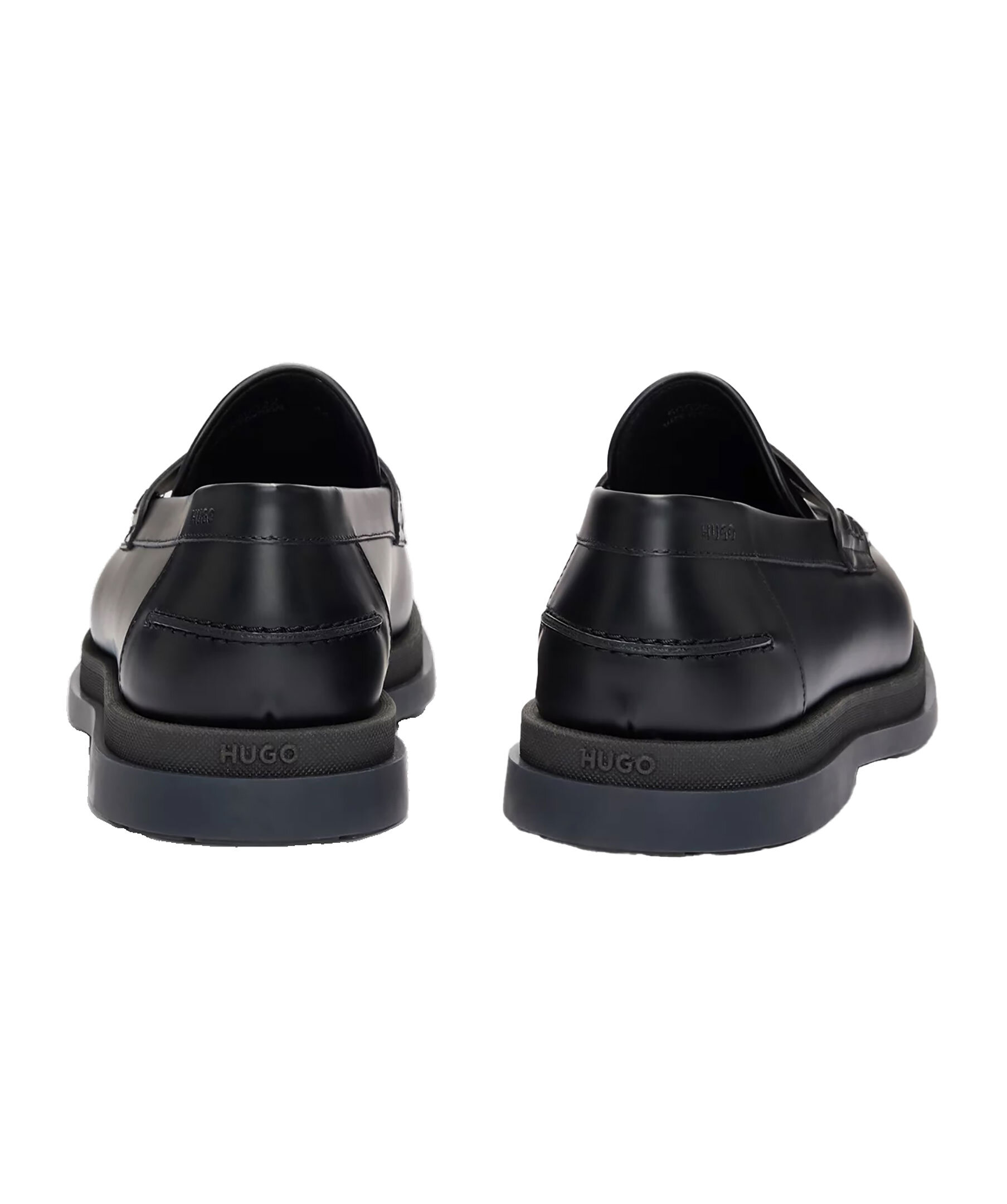 Svarta mockasiner från Hugos Boss. Skorna har en yttersula i gummi för en mer vardaglig lock. Slip-on skor med dekorativa sömmar på ovan- och baksidan. Tillverkad i borstat läder.