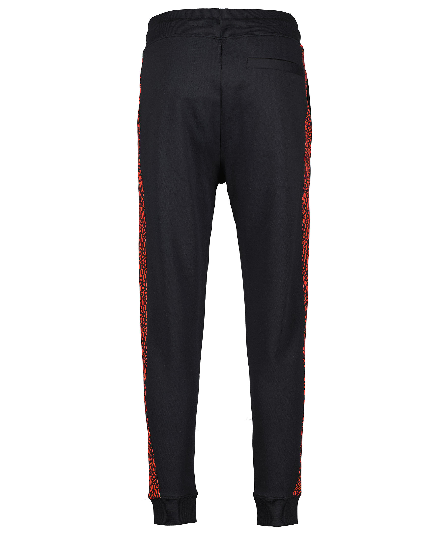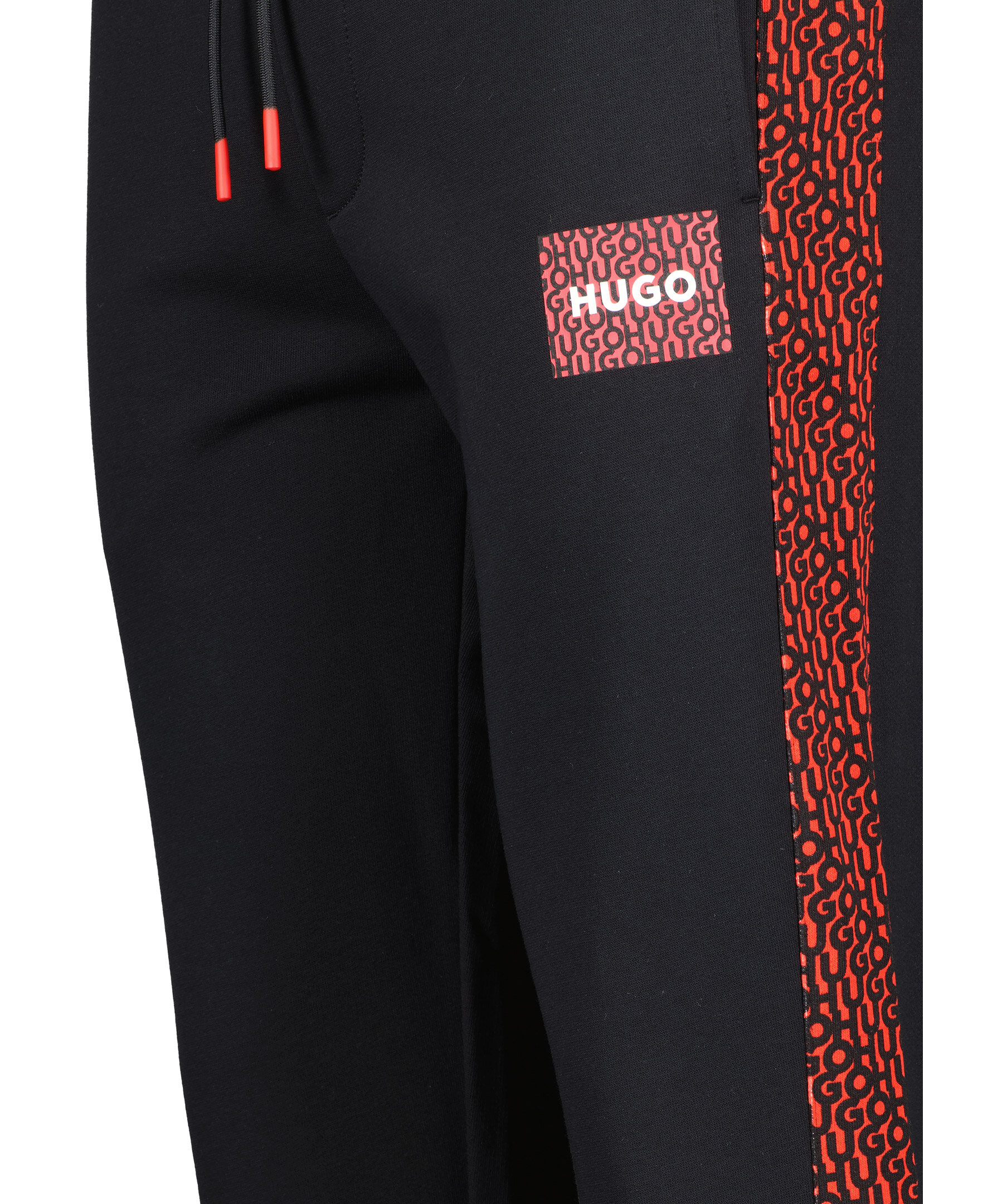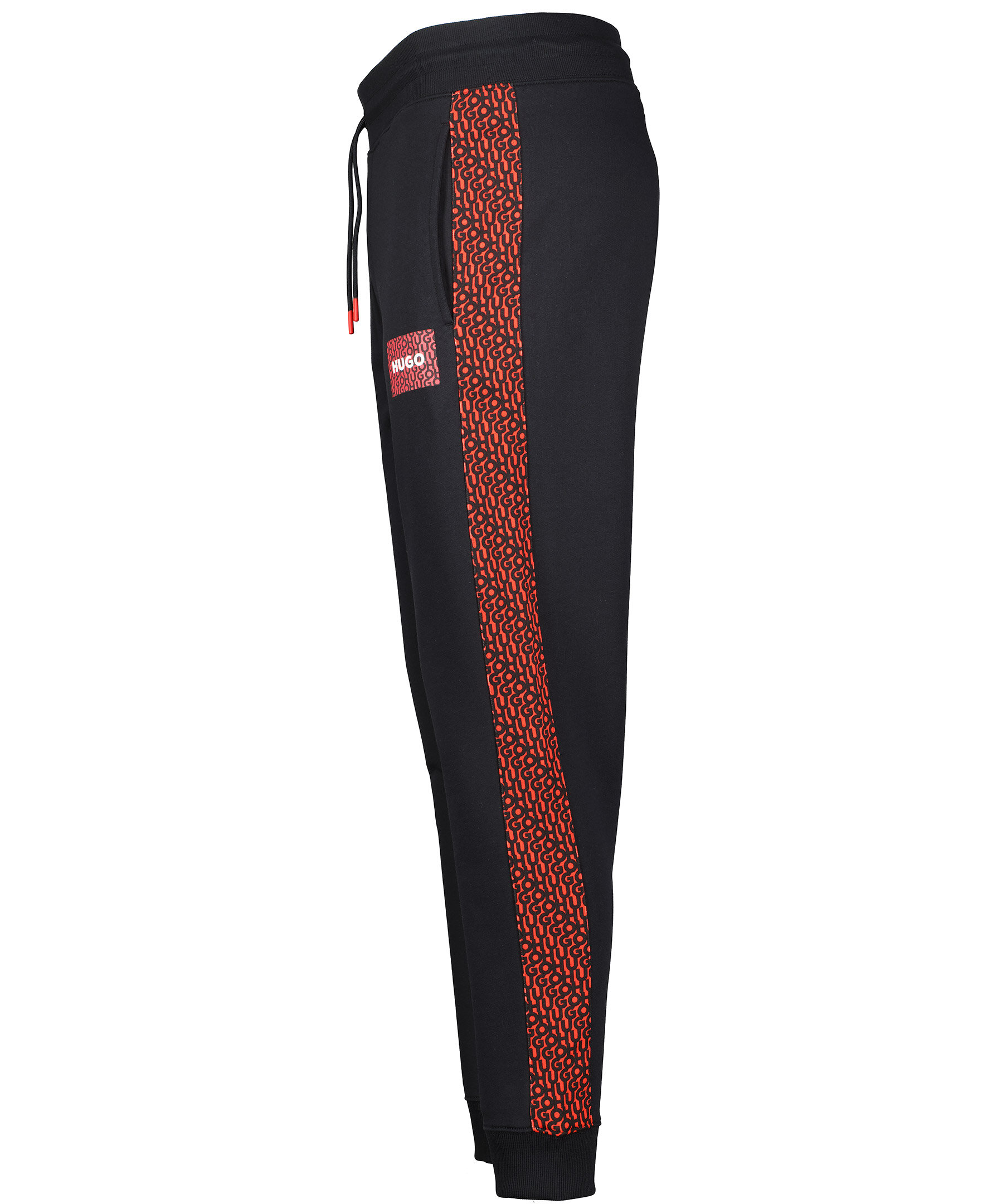 Svarta mjukisbyxor från HUGO. Monogram mönstrade revärer i rött och svart. Dragsko i midjan. Två fickor framtill, en ficka bak. Ribbstickade muddar i midjan och benslut. Tryckt logotyp på vänster lår.