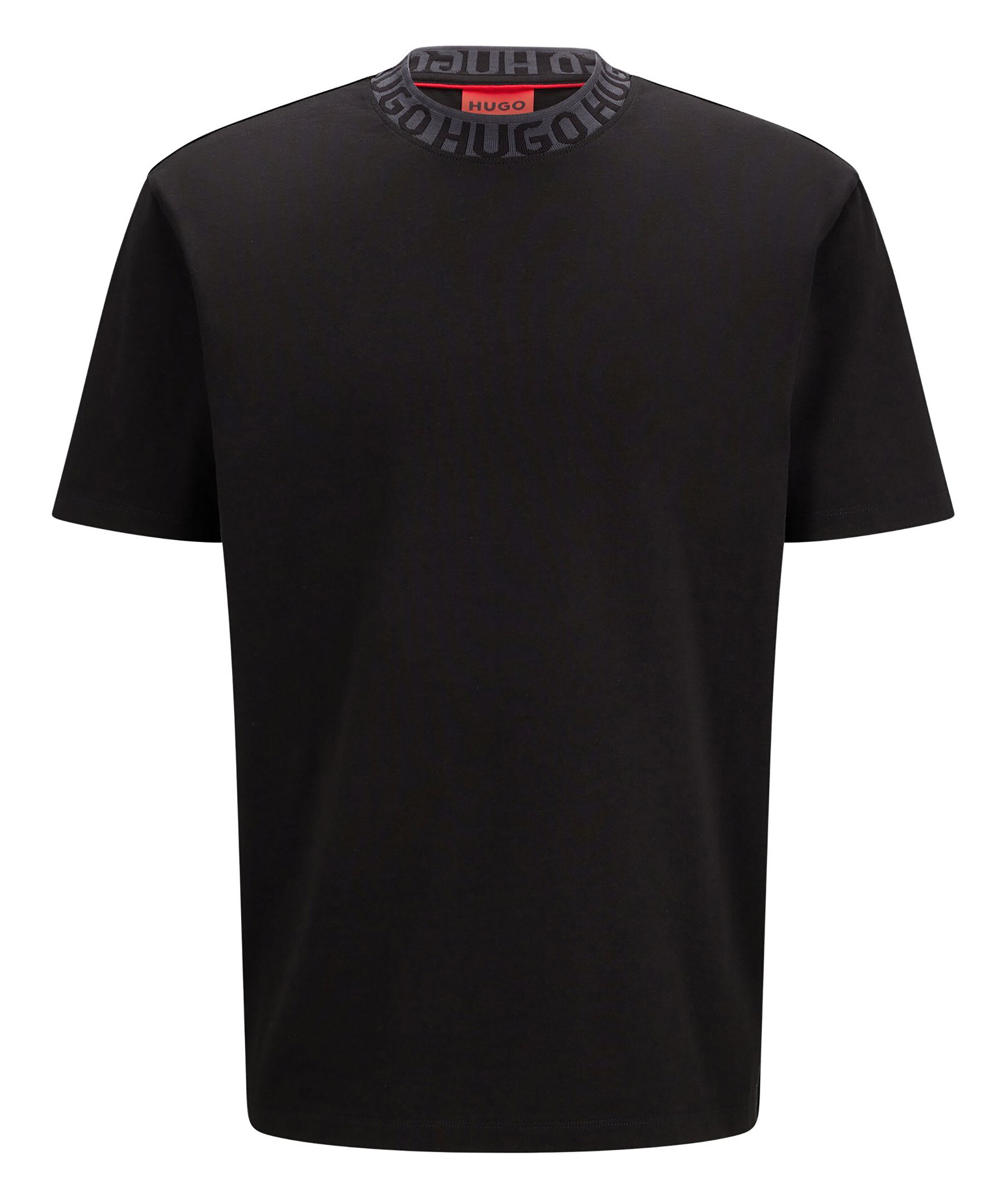 Svart, ledig t-shirt från HUGO med ett rakt snitt. Den kortärmade t-shirten är tillverkad i jerseytyg av mjuk bomull och har logotyper instickade i kanten på den höga halsringningen.