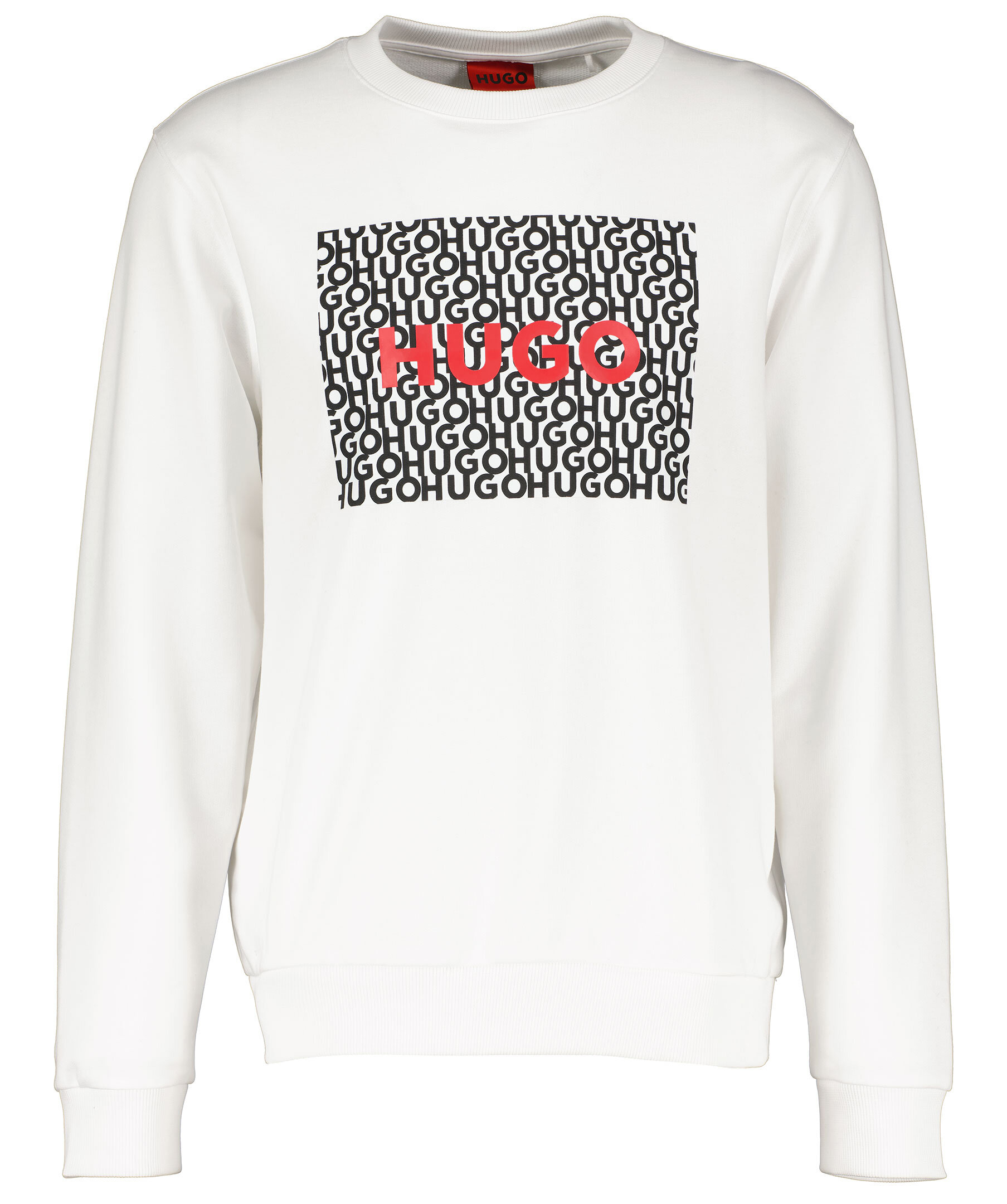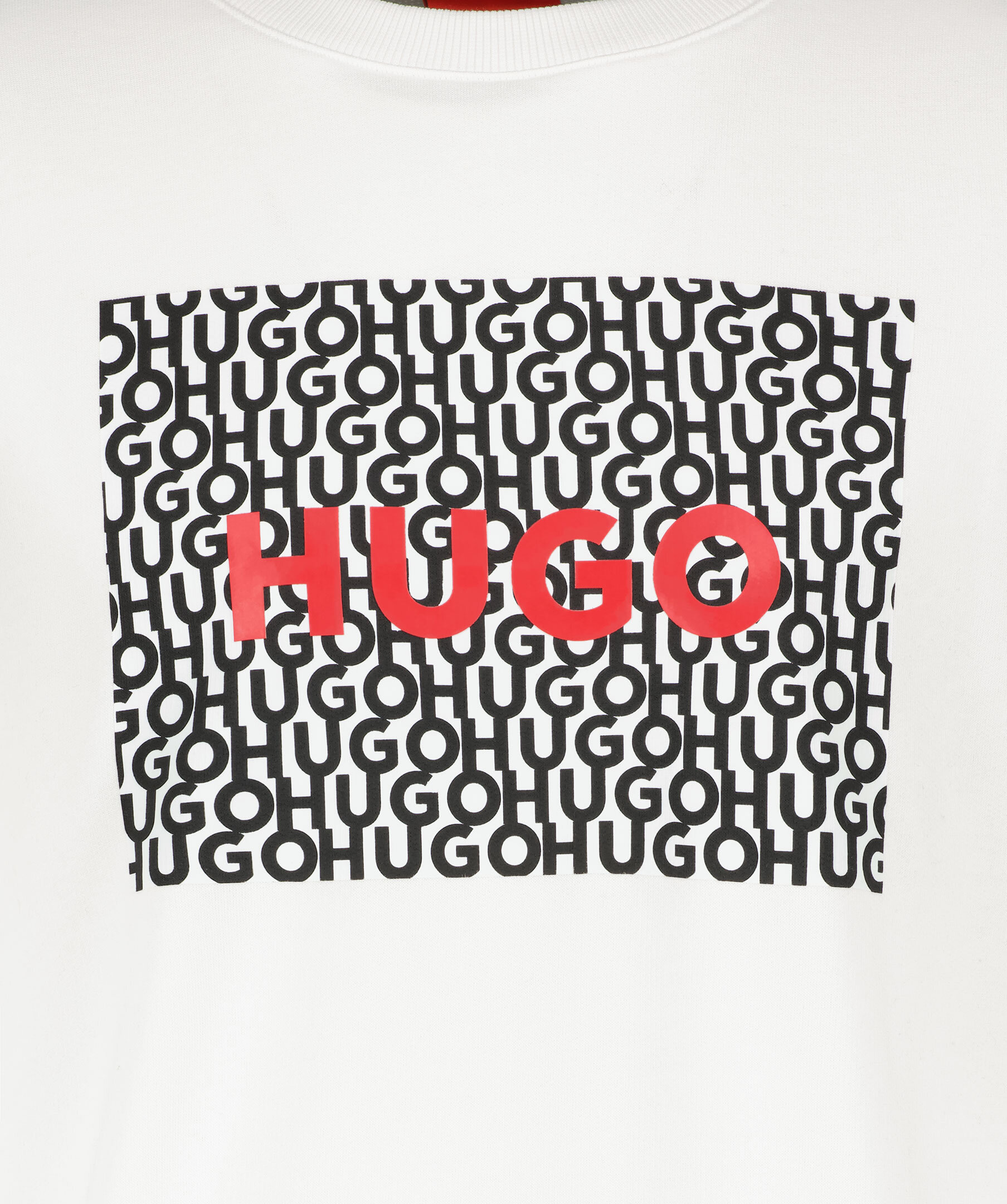 Vit sweatshirt från HUGO. Tillverkad i 100% bomull. Stor tryckt logotyp i svart, vitt och rött mitt på bröstet. Rundad halsringning, ribbade muddar i ärmslut, i halsringning och i plaggslut.