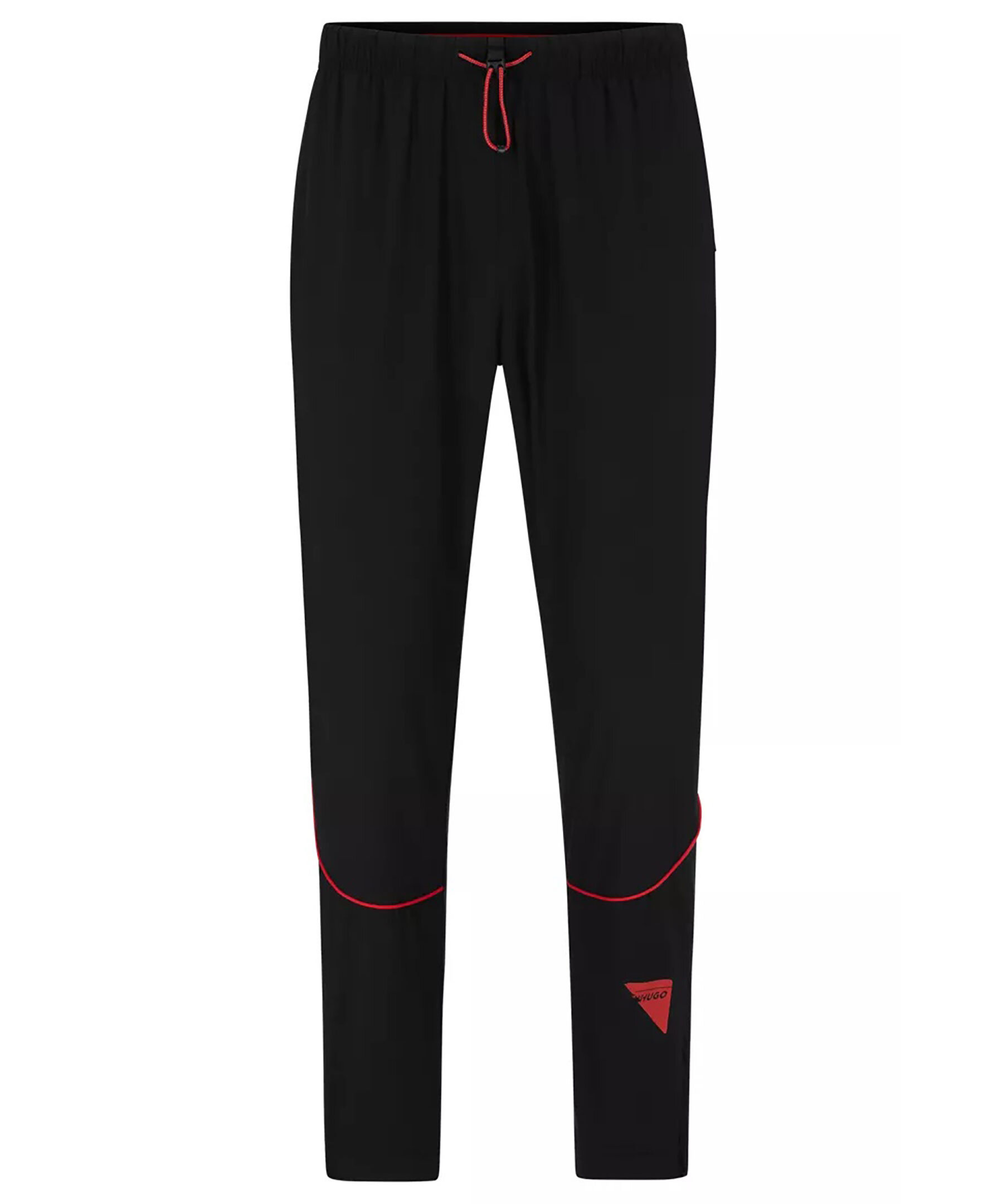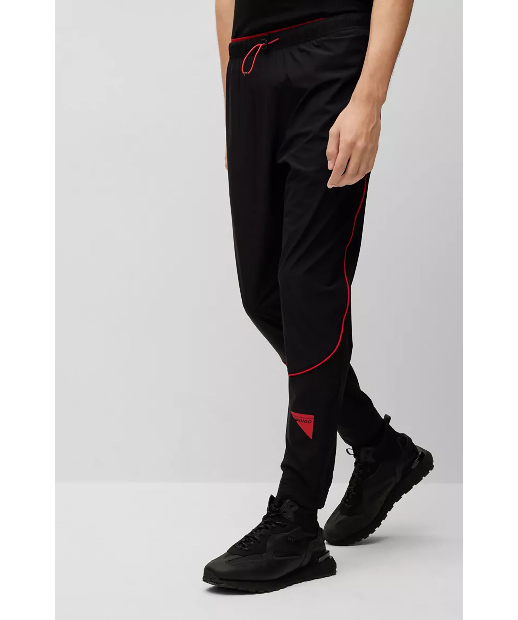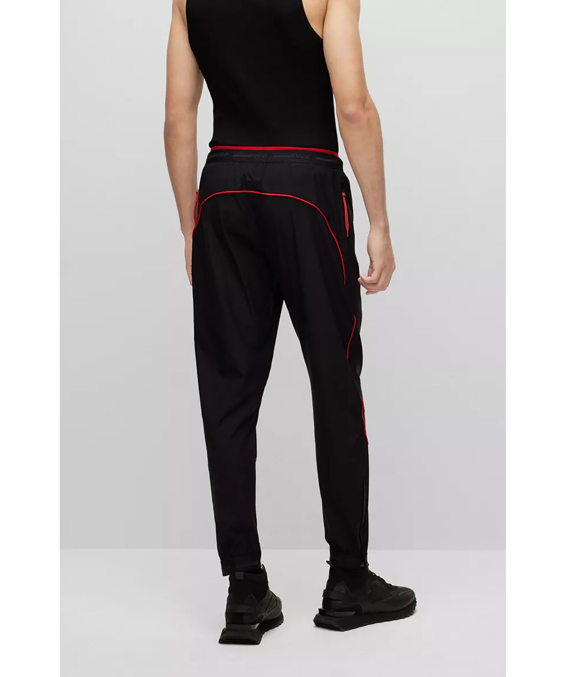 Svarta funktionsbyxor från HUGO. Två fickor med dragkedja fram, resår och knyt i midjan samt dragkedjor och mudd i slutet av byxbenen. Tunna röda revärer i sidorna som går ihop över rumpan och strax under knäna i en båge. Röd logotyp nedtill på vänster ben.