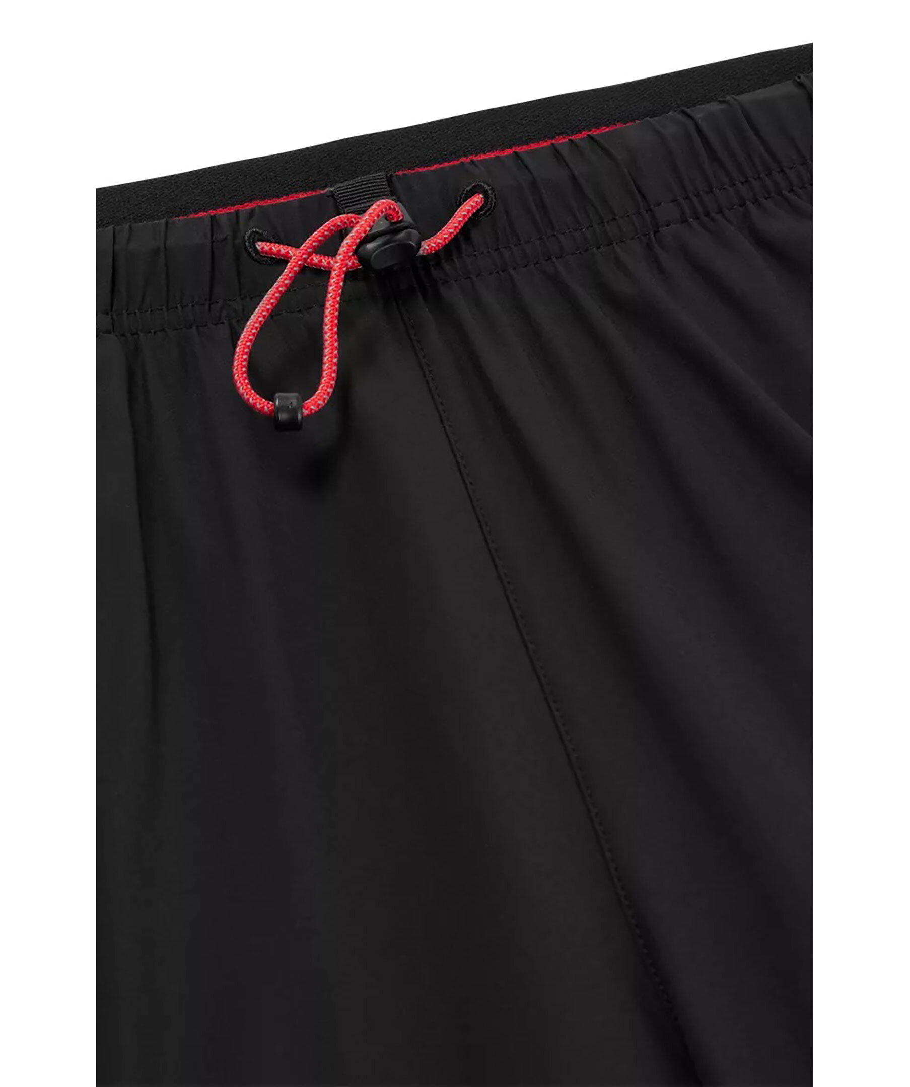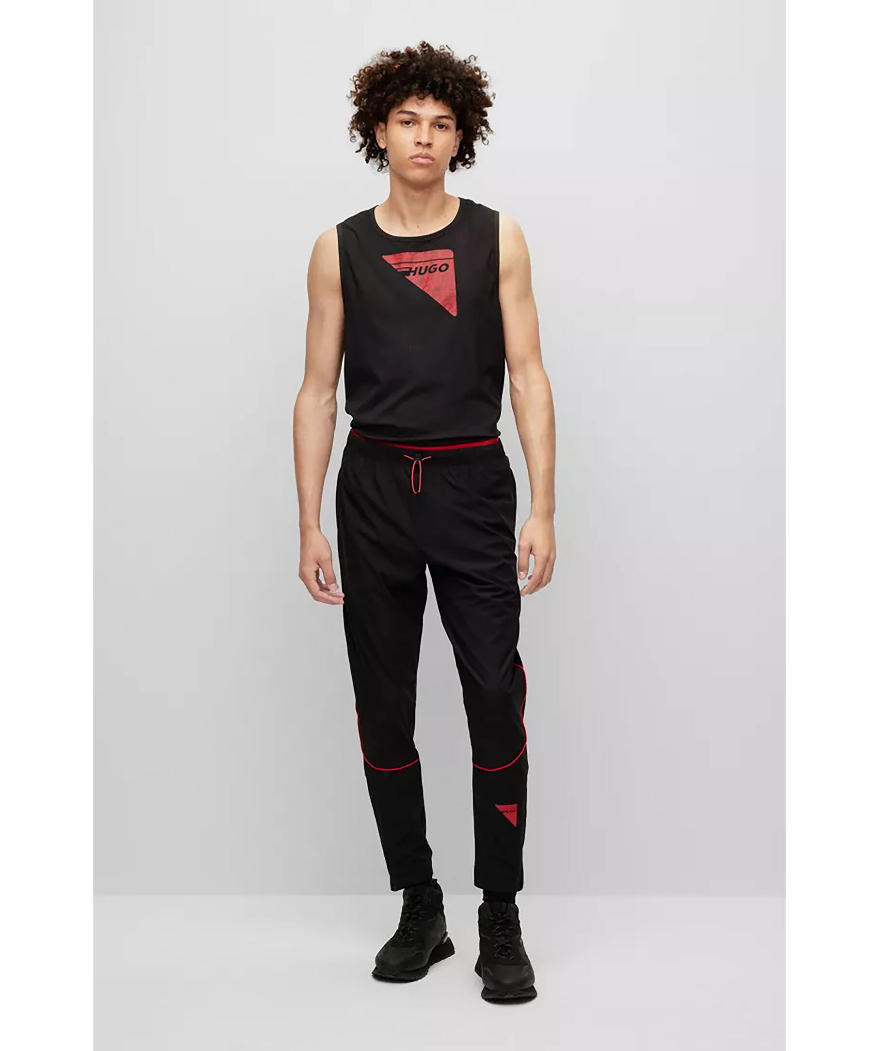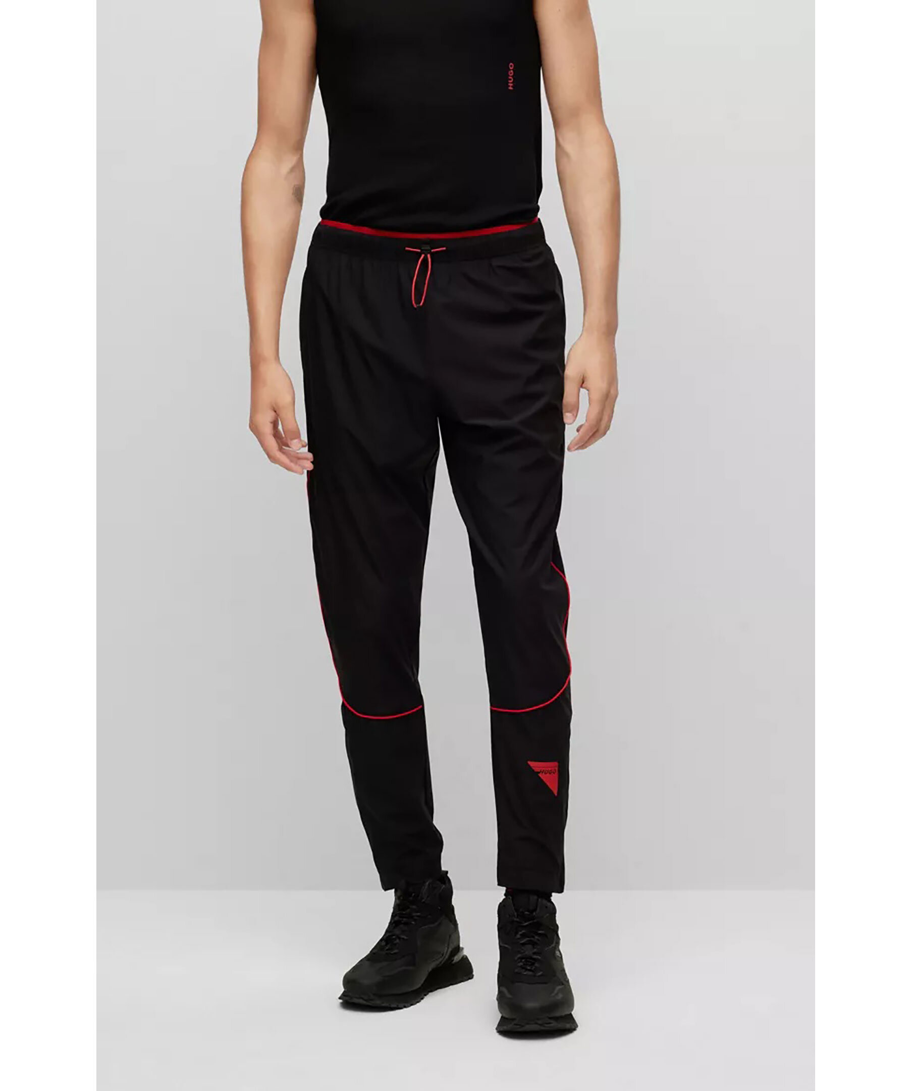 Svarta funktionsbyxor från HUGO. Två fickor med dragkedja fram, resår och knyt i midjan samt dragkedjor och mudd i slutet av byxbenen. Tunna röda revärer i sidorna som går ihop över rumpan och strax under knäna i en båge. Röd logotyp nedtill på vänster ben.
