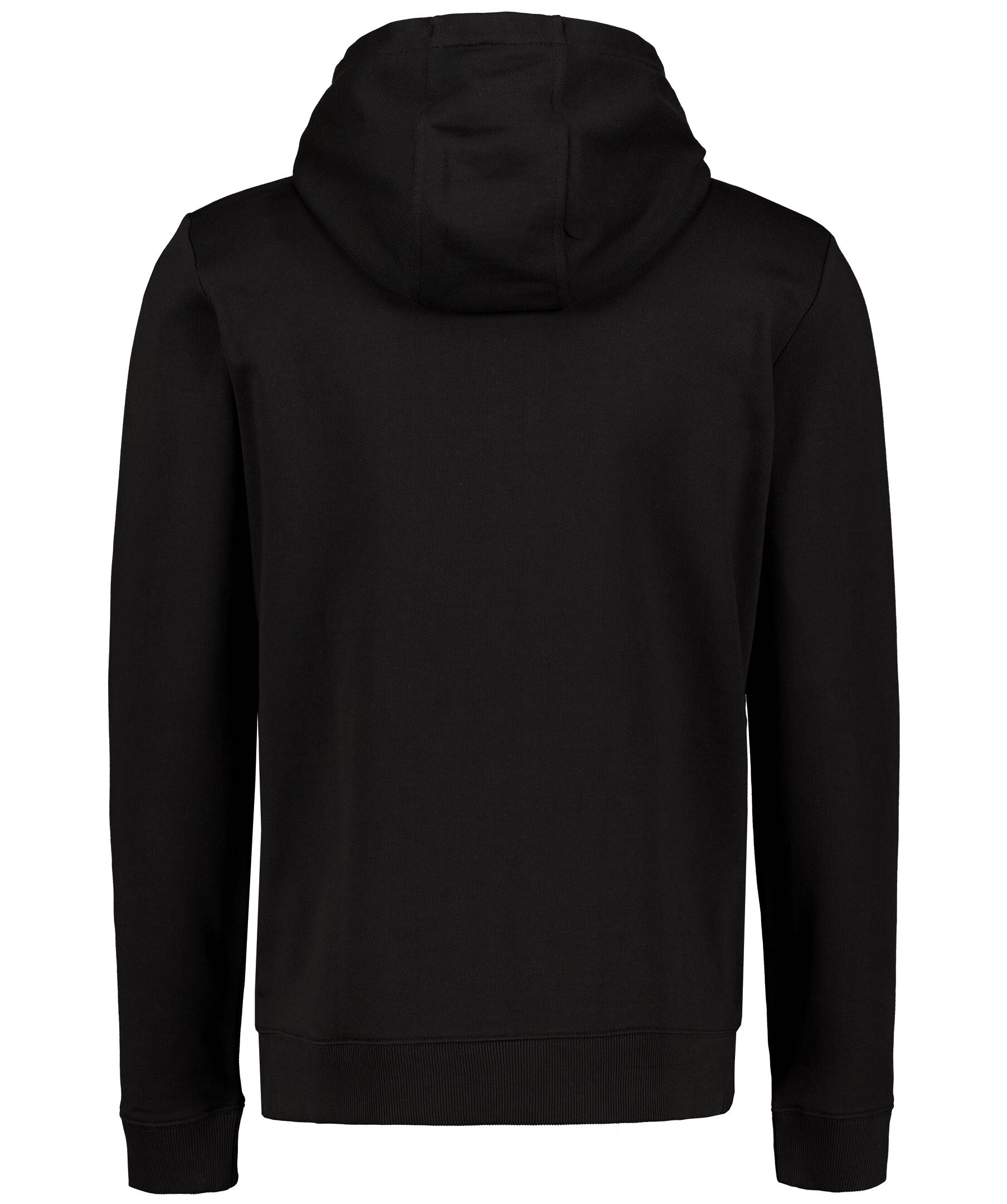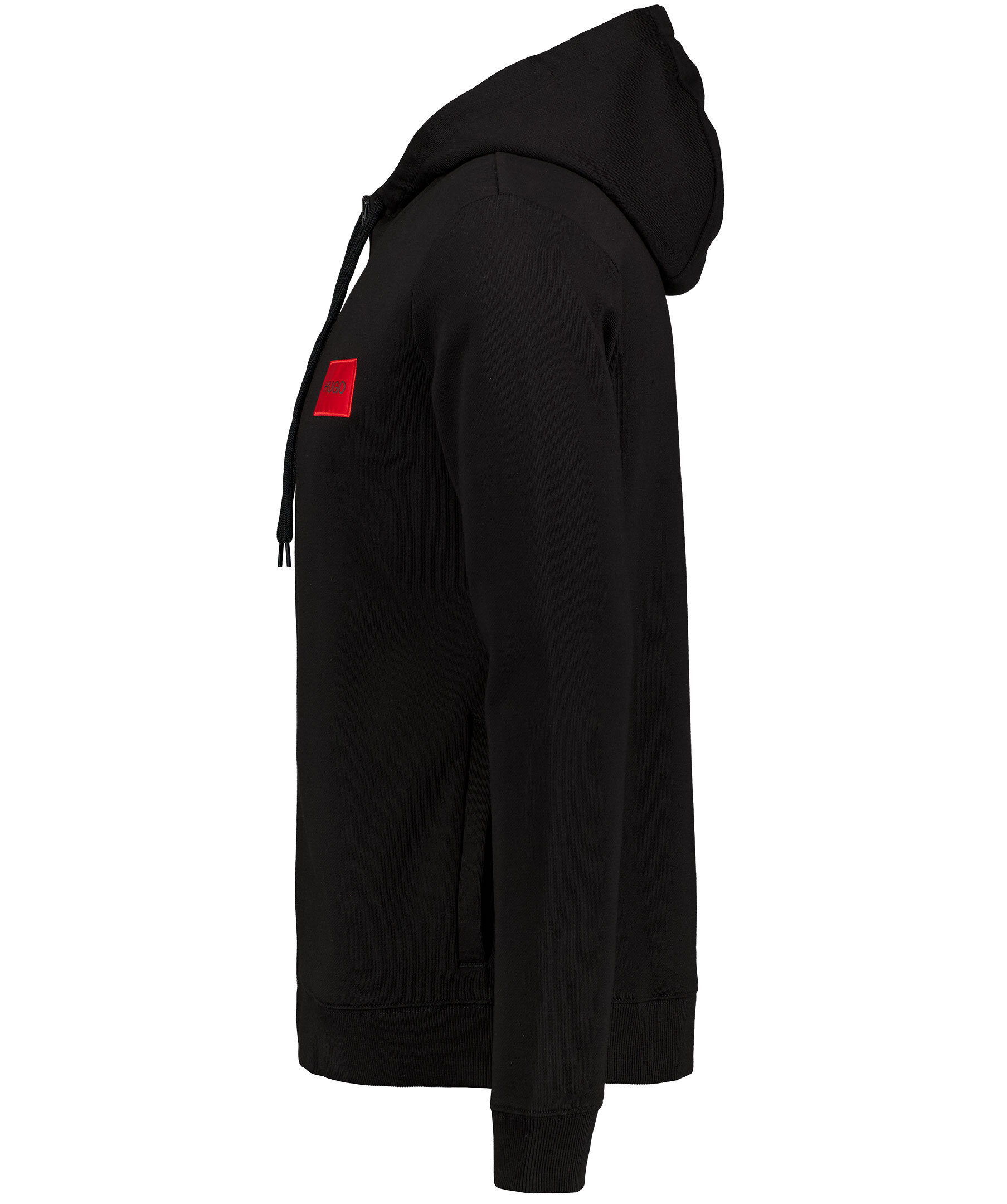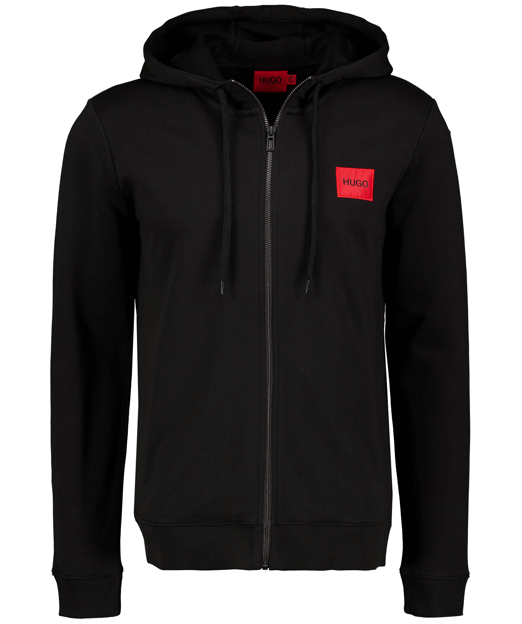 Svart hoodie med dragkedja fram från Hugo, Hugo Boss. Tillverkad i 100% bomull, har en liten röd patch med svart logotyp på vänster sida av bröstet. Ribbade muddar i ärmslut och i plaggslut samt har öppna fickor i sidorna. Svart dragsko med snörning i luva. * Patch med logotyp * Stängs med dragkedja * 100% bomull